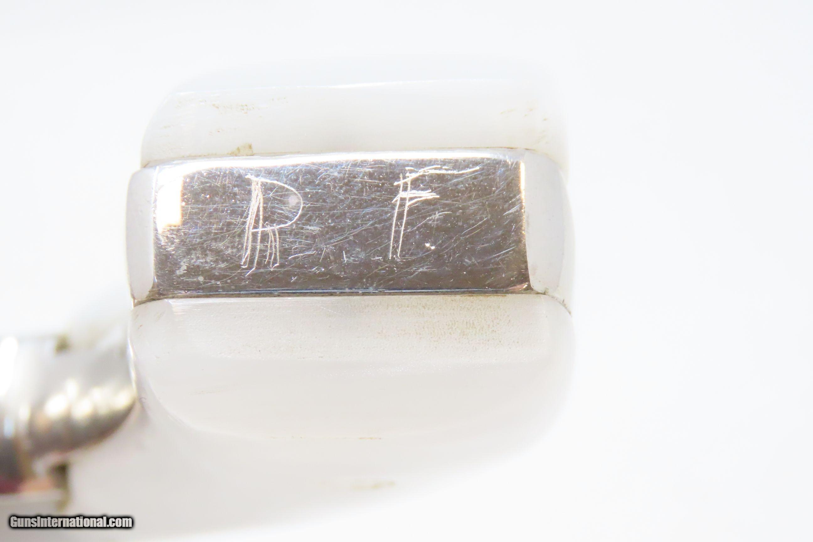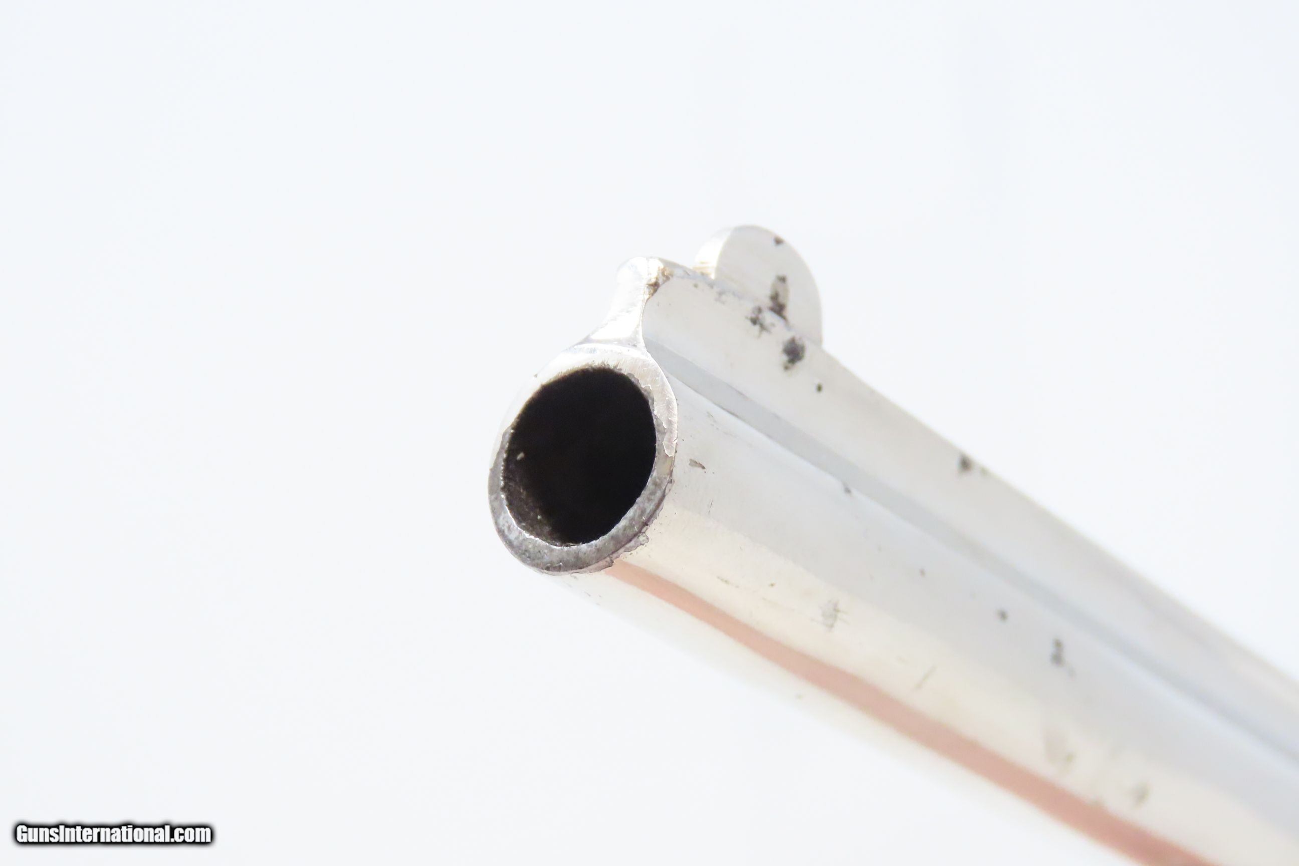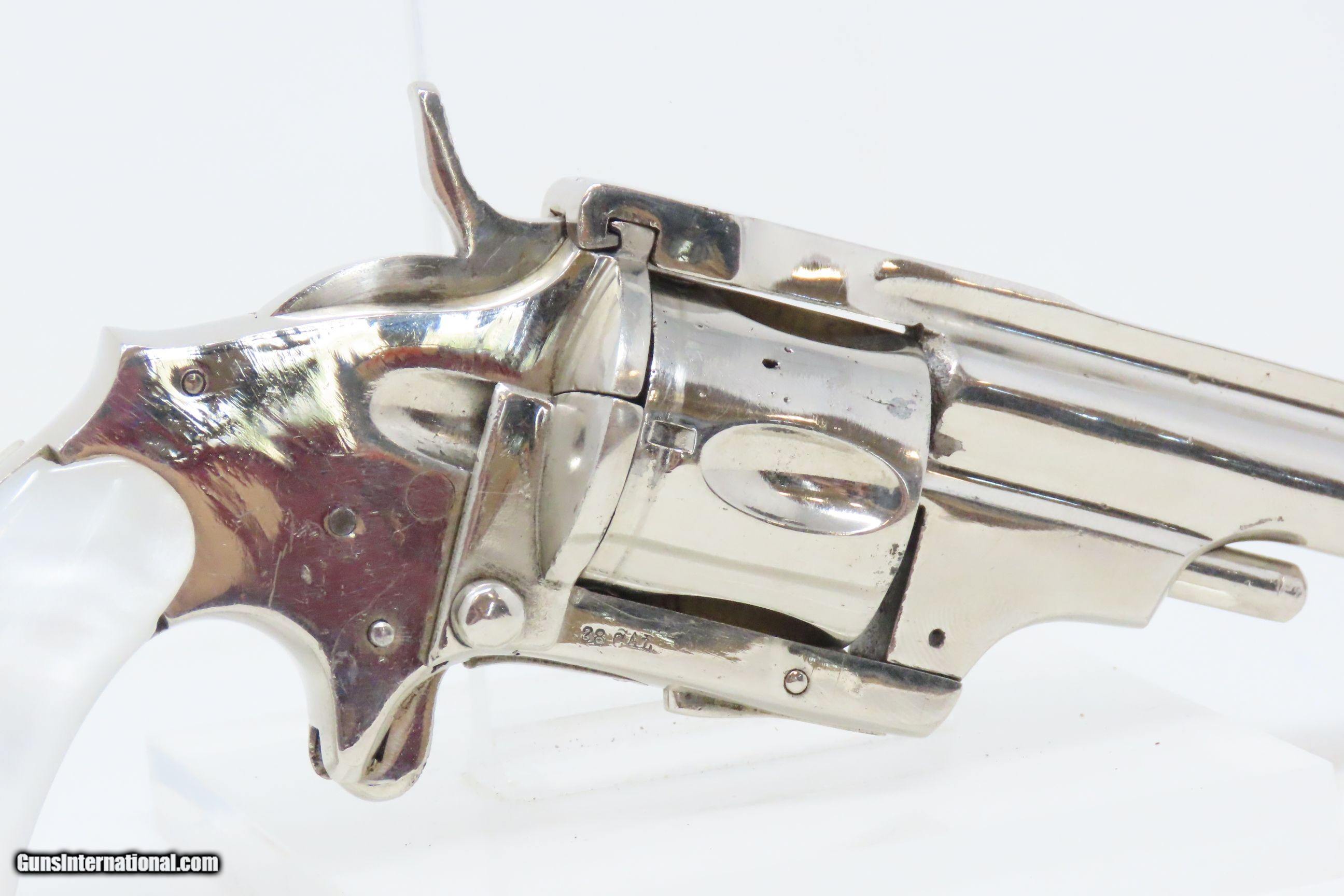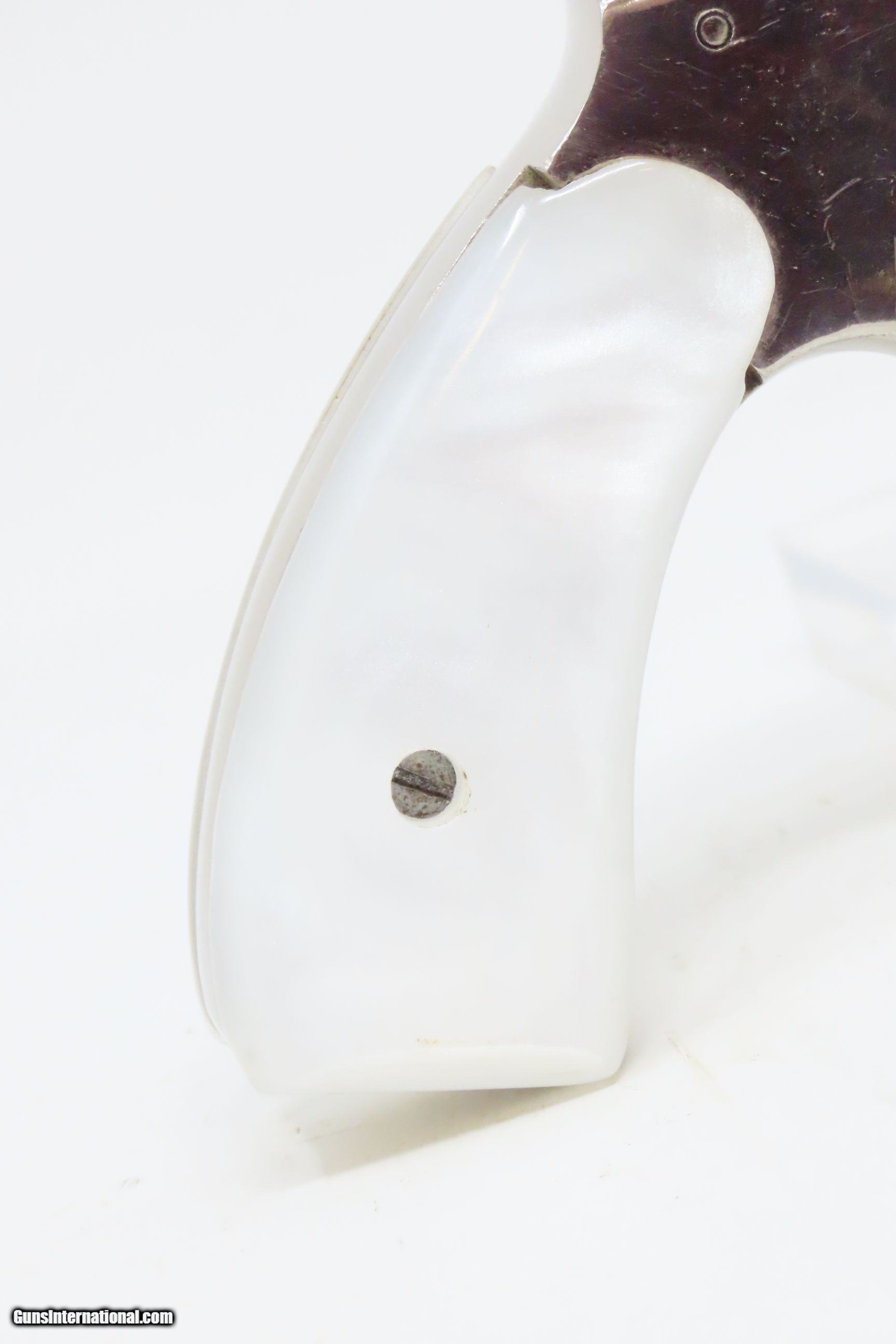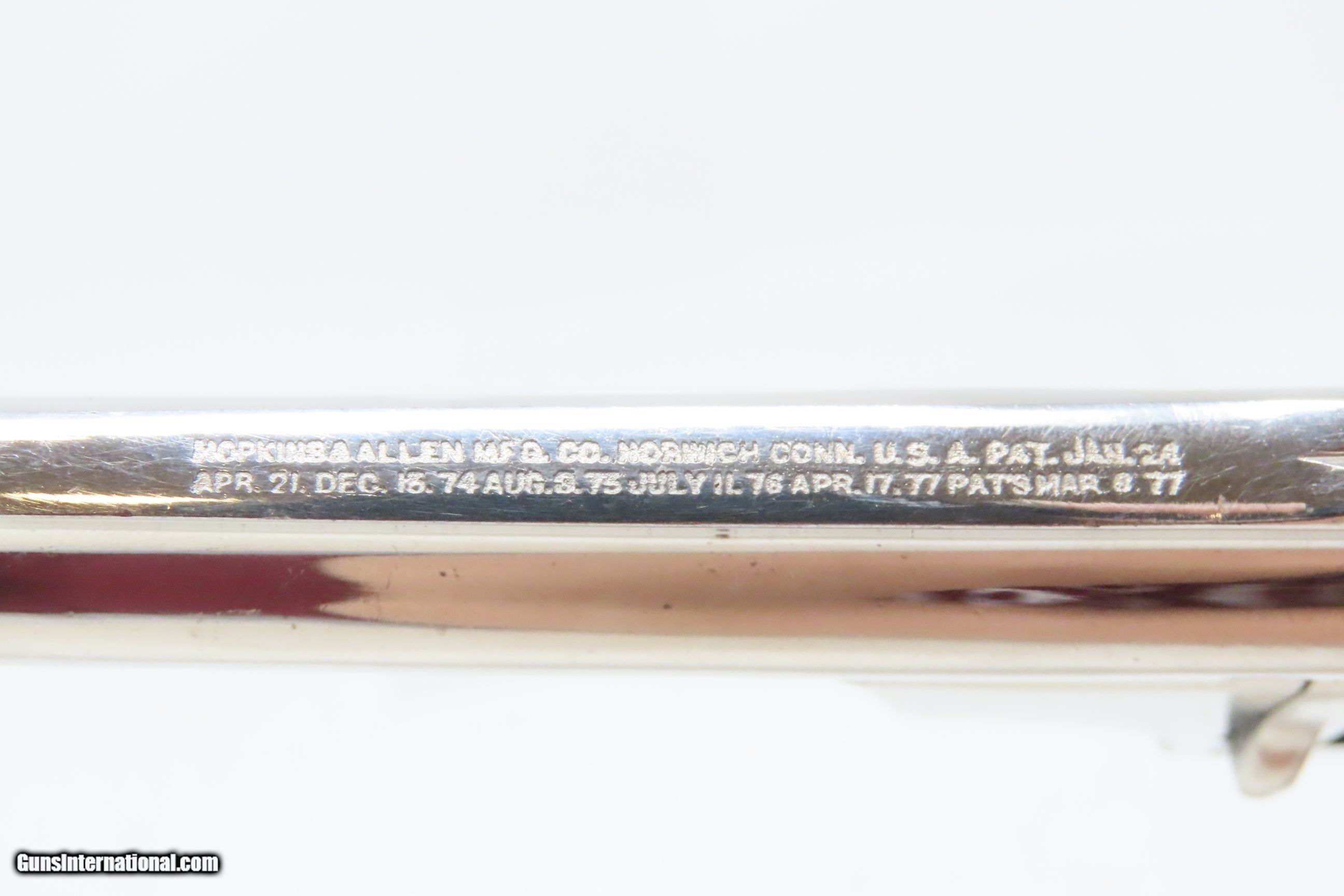 Description: c1880s MERWIN HULBERT .38 S&W 5-1/4” 5-Shot Nickel Revolver Norwich Antique One of the Best 1880s Revolvers Here we present an antique Merwin, Hulbert & Co. Single Action Revolver, made circa the late 1870s to early 1880s by Hopkins & Allen in Norwich, Connecticut. Only a few thousand were produced. These revolvers are considered today to be some of the best made of the late 19th Century and the Wild West, even better in some minds than similar Colts and Smith & Wessons. These pistols certainly tended to have very well-thought and different features than their competition, and they were extremely well-made. One such feature was the method of ejection. Loading was achieved by placing the hammer at half-cock and sliding down the loading gate to single feed cartridges. If one wanted to unload the gun, they could simply push the latch back on the bottom of the gun, twist the barrel and cylinder assembly and pull forward. Only the empty brass would come out as the space created was shorter than a loaded cartridge, enabling the shooter to top of his gun and keep rounds available. An ingenious method was designed to achieve this that included a machined cut on the cylinder axis pin and a ledge on the breech face that kept the cartridge rims underneath. This system was also advantageous for forcefully removing stuck cartridges, providing lots of mechanical advantage. The overall condition is good. Refinished in nickel. The action is strong. The bore is in good condition with nice rifling. One of the five chambers in the cylinder is thin and has a small hole through the wall. The grips are Pearlite replacements. Own the original! This is a legitimate antique and not a reproduction. Barrel is 5-1/4 inches. Caliber: .38 S&W Overall condition as seen in photos. Very Fast. Very Safe. FREE SHIPPING WORLDWIDE. Delivered directly to your door by express mail! Guaranteed AUTHENTIC & Includes CERTIFICATE OF AUTHENTICITY. ancestryguns $1500 #230136 SOLD Antique: Yes |