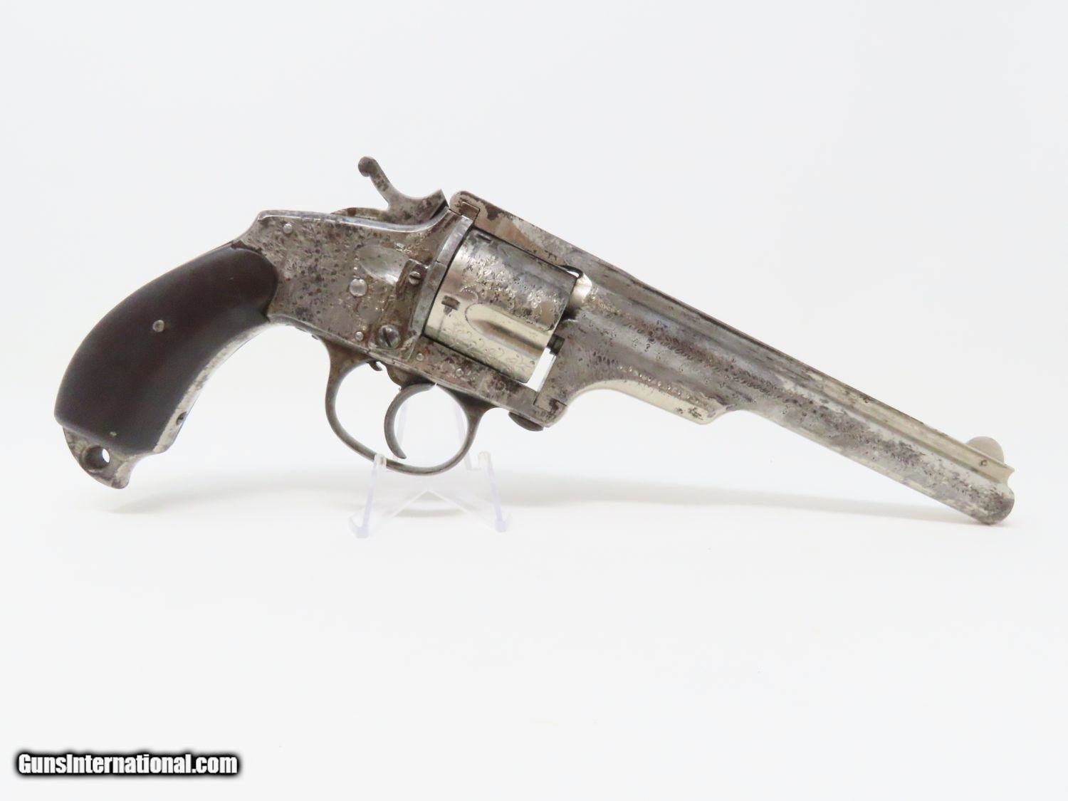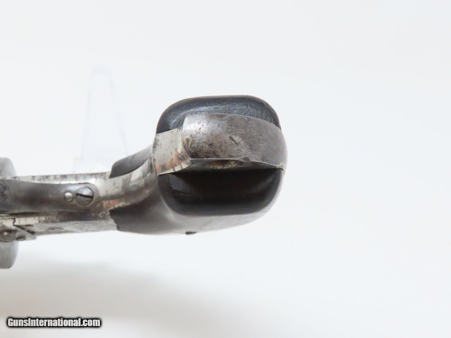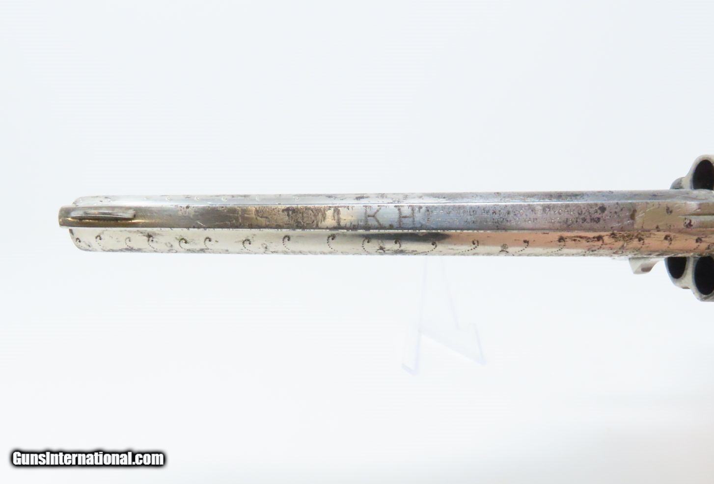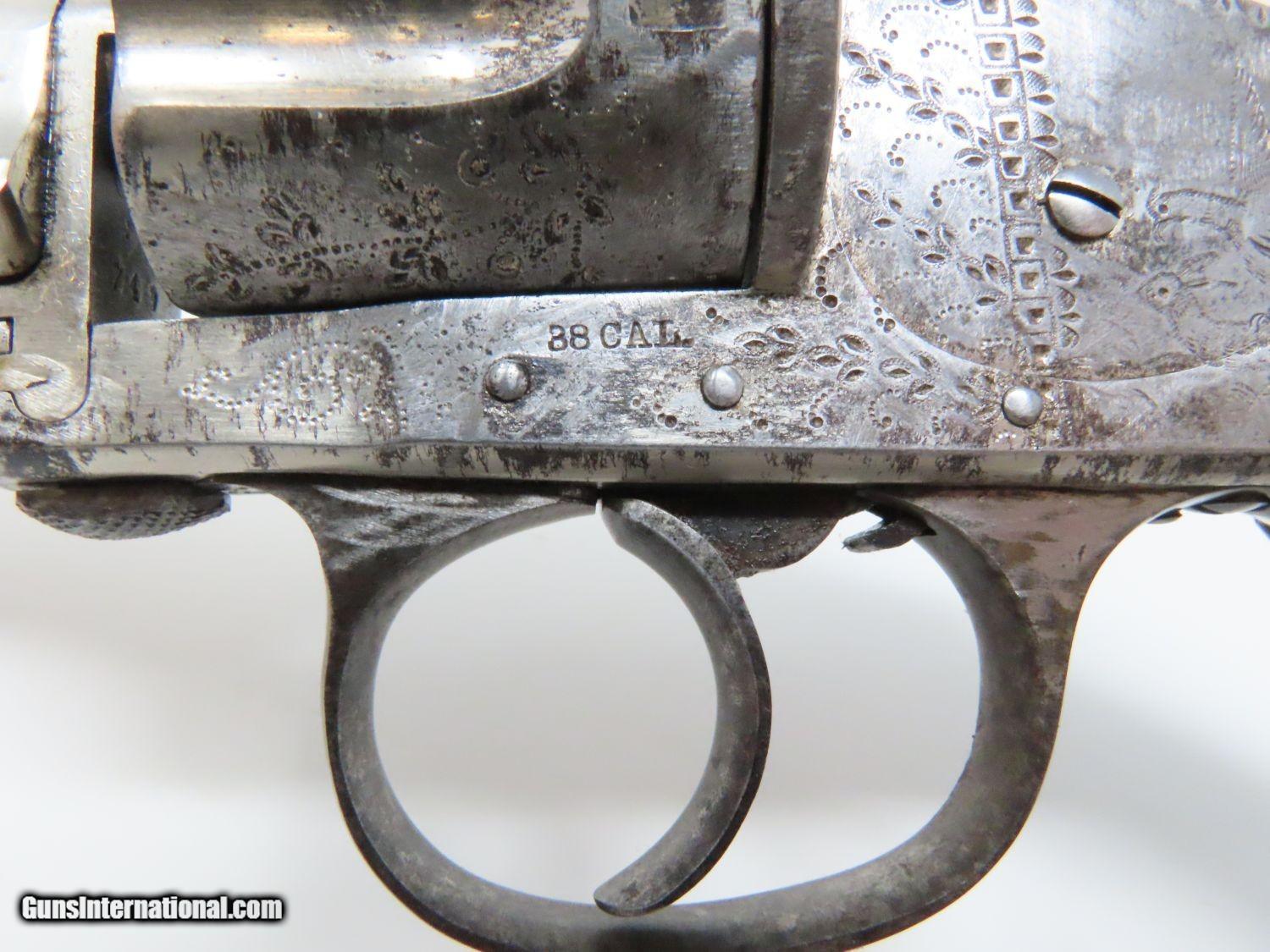 Description: Factory Engraved MERWIN & HULBERT .38 S&W Revolver w PERSONAL INSCRIPTION HAWK & RABBIT Engraved Predator/Prey Scene Here we present an Engraved Antique Merwin & Hulbert Double Action Revolver in .38 S&W, made circa the 1880s by Hopkins & Allen in Norwich, Connecticut, Inscribed “J.S. TO T.K.H”. Only a few thousand of these revolvers were produced. These revolvers are considered today to be some of the best made of the late 19th Century and the Wild West, even better in some minds than similar Colts and Smith & Wessons. These pistols certainly tended to have different, very well-thought features than their competition, and they were extremely well-made. One such feature was the method of ejection. Loading was achieved by placing the hammer at half-cock and sliding down the loading gate to single feed cartridges. If one wanted to unload the gun, they could simply push the latch back on the bottom of the gun, twist the barrel and cylinder assembly and pull forward. Only the empty brass would come out as the space created was shorter than a loaded cartridge, enabling the shooter to top off his gun and keep rounds available. An ingenious method was designed to achieve this that included a machined cut on the cylinder axis pin and a ledge on the breech face that kept the cartridge rims underneath. This system was also advantageous for forcefully removing stuck cartridges, providing lots of mechanical advantage. This one has the “birds’ head” grip that extends past the grip panels, known as some as the “skull-crusher” grip frame. That exposed little corner certainly looks rather unappealing to get smacked with. The engraving comes from the factory and features a hawk swooping down on a rabbit on the left side, with punch-dot designs throughout the rest of the gun. The top of the barrel has “J.S. TO T.K.H” engraved on it, and it looks very much like this was also from the factory. The inscription was performed by hand and consists of tiny zig-zags. A nickel finish overlays it all. The overall condition is very good. The action is strong and tight. The bore is shiny bright. A very attractive example of a desirable Old West revolver! Own the original! This is a legitimate antique and not a reproduction. Barrel is 5-1/2 inches. Caliber: .38 S&W Overall condition as seen in photos. Very Fast. Very Safe. FREE SHIPPING WORLDWIDE. Delivered directly to your door by express mail! Guaranteed AUTHENTIC & Includes CERTIFICATE OF AUTHENTICITY. ancestryguns $2200 #20432 SOLD Antique: Yes |