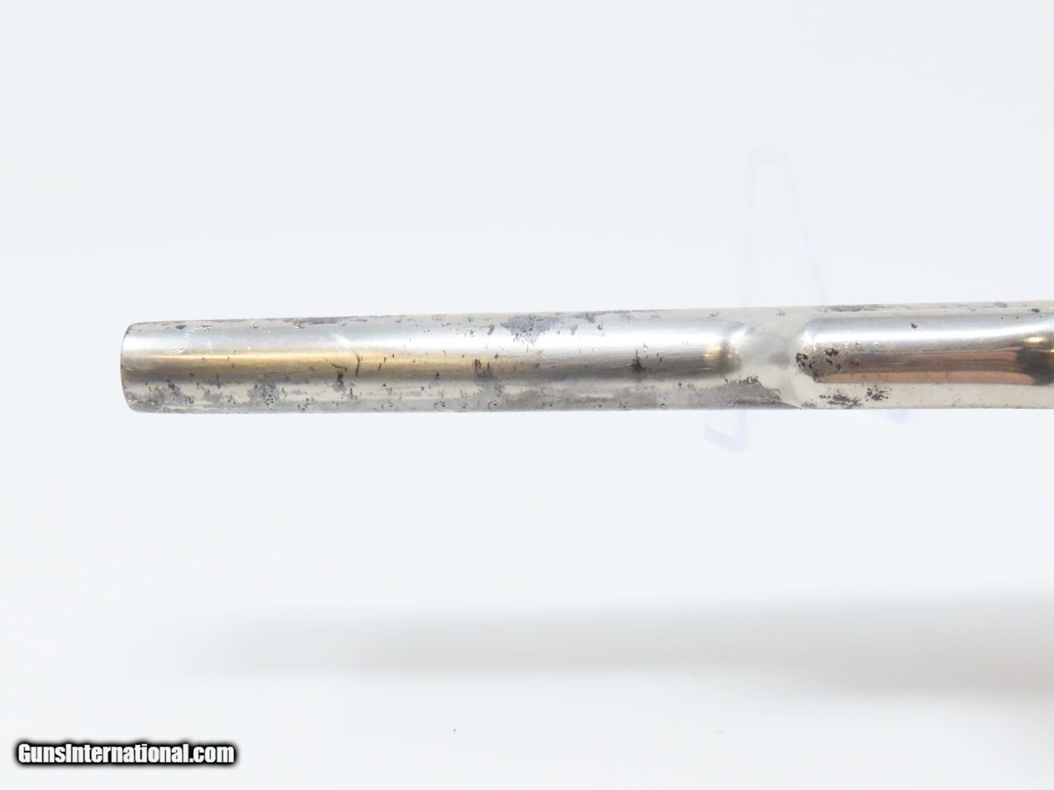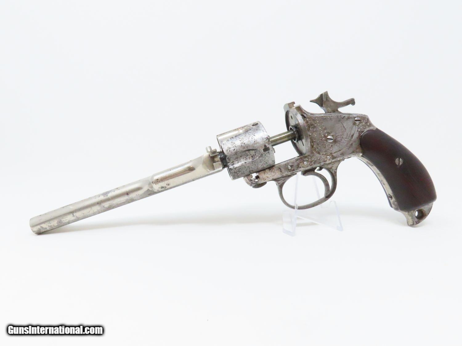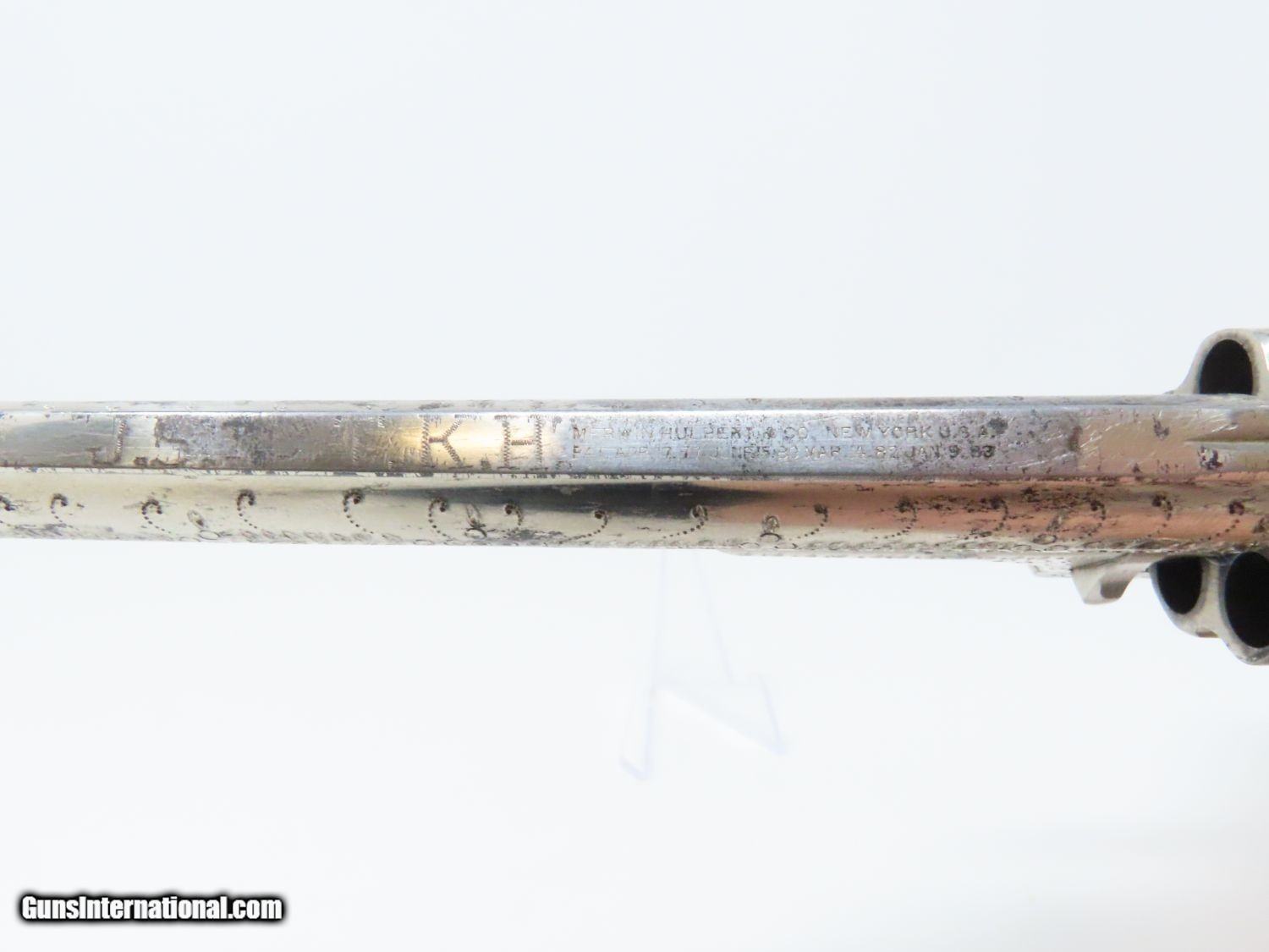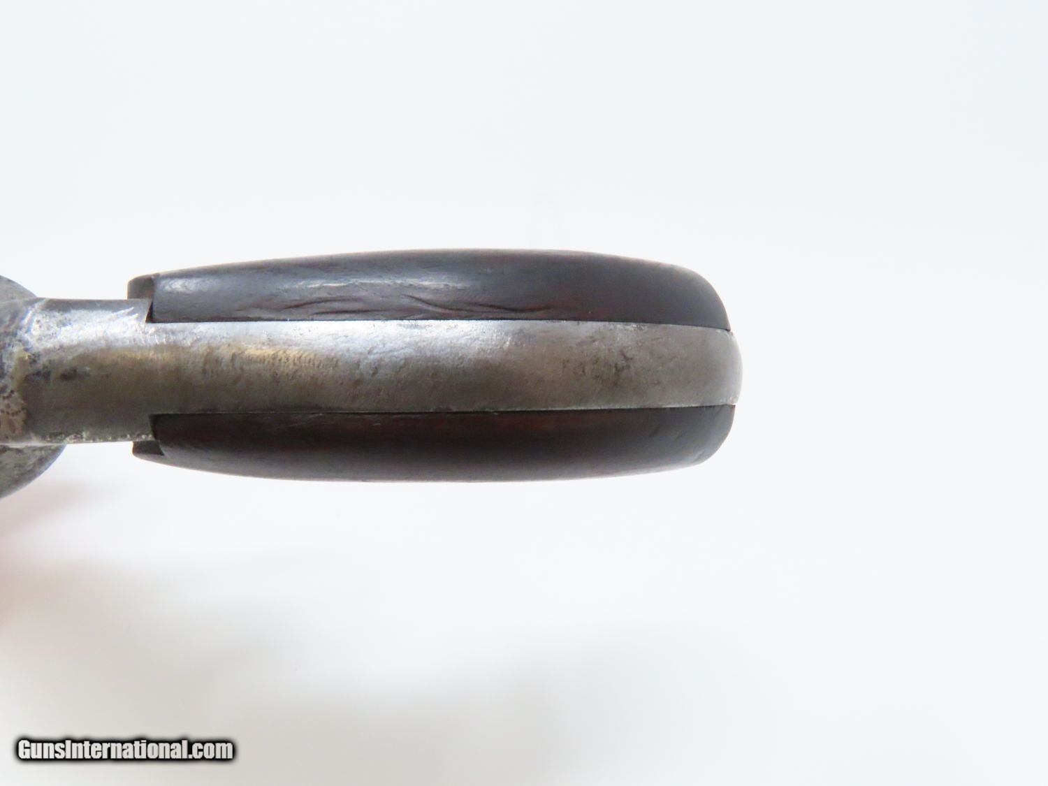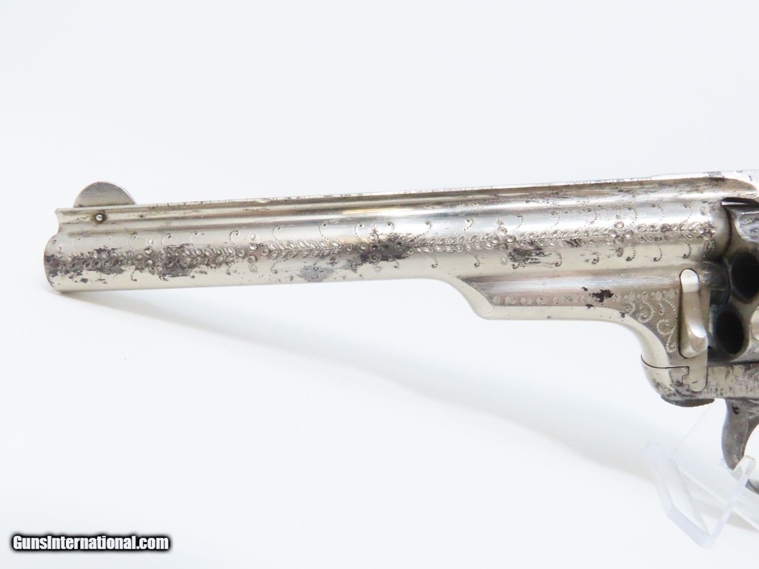 Description: Factory Engraved MERWIN & HULBERT .38 S&W Revolver w PERSONAL INSCRIPTION HAWK & RABBIT Engraved Predator/Prey Scene Here we present an Engraved Antique Merwin & Hulbert Double Action Revolver in .38 S&W, made circa the 1880s by Hopkins & Allen in Norwich, Connecticut, Inscribed “J.S. TO T.K.H”. Only a few thousand of these revolvers were produced. These revolvers are considered today to be some of the best made of the late 19th Century and the Wild West, even better in some minds than similar Colts and Smith & Wessons. These pistols certainly tended to have different, very well-thought features than their competition, and they were extremely well-made. One such feature was the method of ejection. Loading was achieved by placing the hammer at half-cock and sliding down the loading gate to single feed cartridges. If one wanted to unload the gun, they could simply push the latch back on the bottom of the gun, twist the barrel and cylinder assembly and pull forward. Only the empty brass would come out as the space created was shorter than a loaded cartridge, enabling the shooter to top off his gun and keep rounds available. An ingenious method was designed to achieve this that included a machined cut on the cylinder axis pin and a ledge on the breech face that kept the cartridge rims underneath. This system was also advantageous for forcefully removing stuck cartridges, providing lots of mechanical advantage. This one has the “birds’ head” grip that extends past the grip panels, known as some as the “skull-crusher” grip frame. That exposed little corner certainly looks rather unappealing to get smacked with. The engraving comes from the factory and features a hawk swooping down on a rabbit on the left side, with punch-dot designs throughout the rest of the gun. The top of the barrel has “J.S. TO T.K.H” engraved on it, and it looks very much like this was also from the factory. The inscription was performed by hand and consists of tiny zig-zags. A nickel finish overlays it all. The overall condition is very good. The action is strong and tight. The bore is shiny bright. A very attractive example of a desirable Old West revolver! Own the original! This is a legitimate antique and not a reproduction. Barrel is 5-1/2 inches. Caliber: .38 S&W Overall condition as seen in photos. Very Fast. Very Safe. FREE SHIPPING WORLDWIDE. Delivered directly to your door by express mail! Guaranteed AUTHENTIC & Includes CERTIFICATE OF AUTHENTICITY. ancestryguns $2200 #20432 SOLD Antique: Yes |