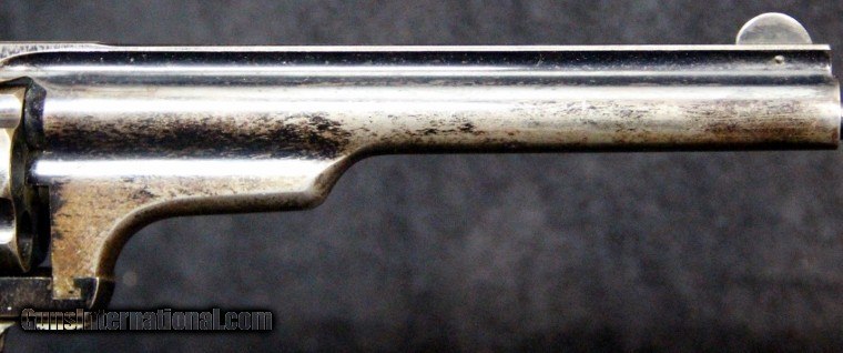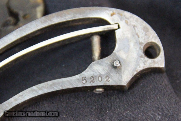 Description: .38, #5202, 5 1/2 inch barrel, blue finish, case color folding hammer and trigger, bird's head hard rubber grips, all matching, 1880's. Condition: excellent bright bore, 60% barrel blue, 75% frame, 90% case colors, excellent grips, excellent mechanically, excellent marks. SOLD Antique: Yes |