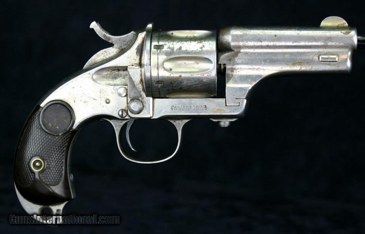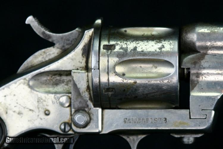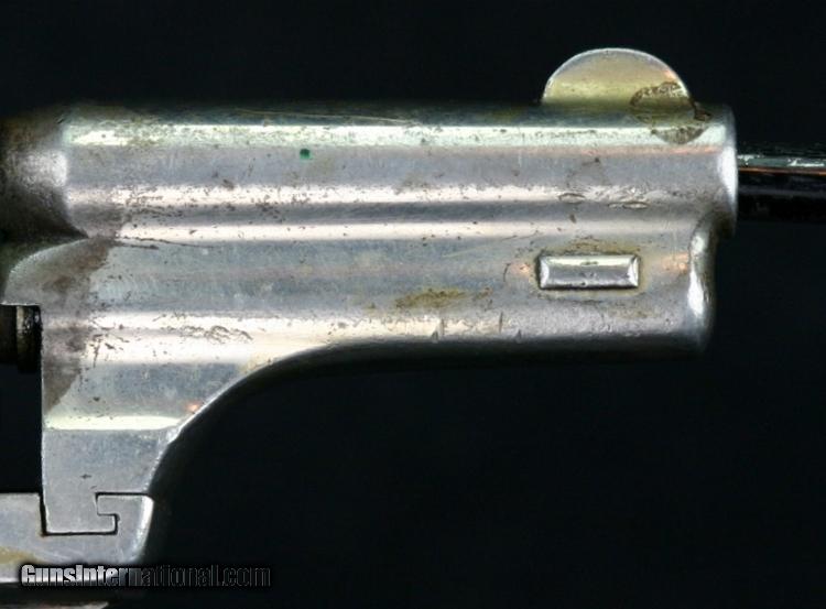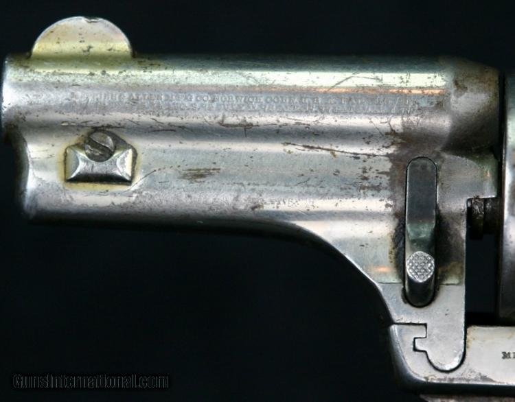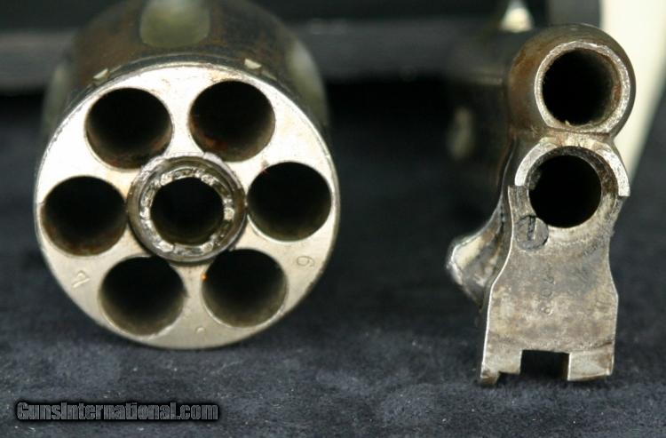 Description: #555, .44-40, 3 1/4 inch barrel, nickel finish, 2 piece hard rubber grips, late 1870's Condition: bore is rough but rifling is still strong, 60% nickel overall, back side cover screw replaced with lead "slug", has a museum catalog number on butt (from small local museum in Wyoming), grips are in great condition, excellent mechanically, excellent marks. SOLD Antique: Yes |