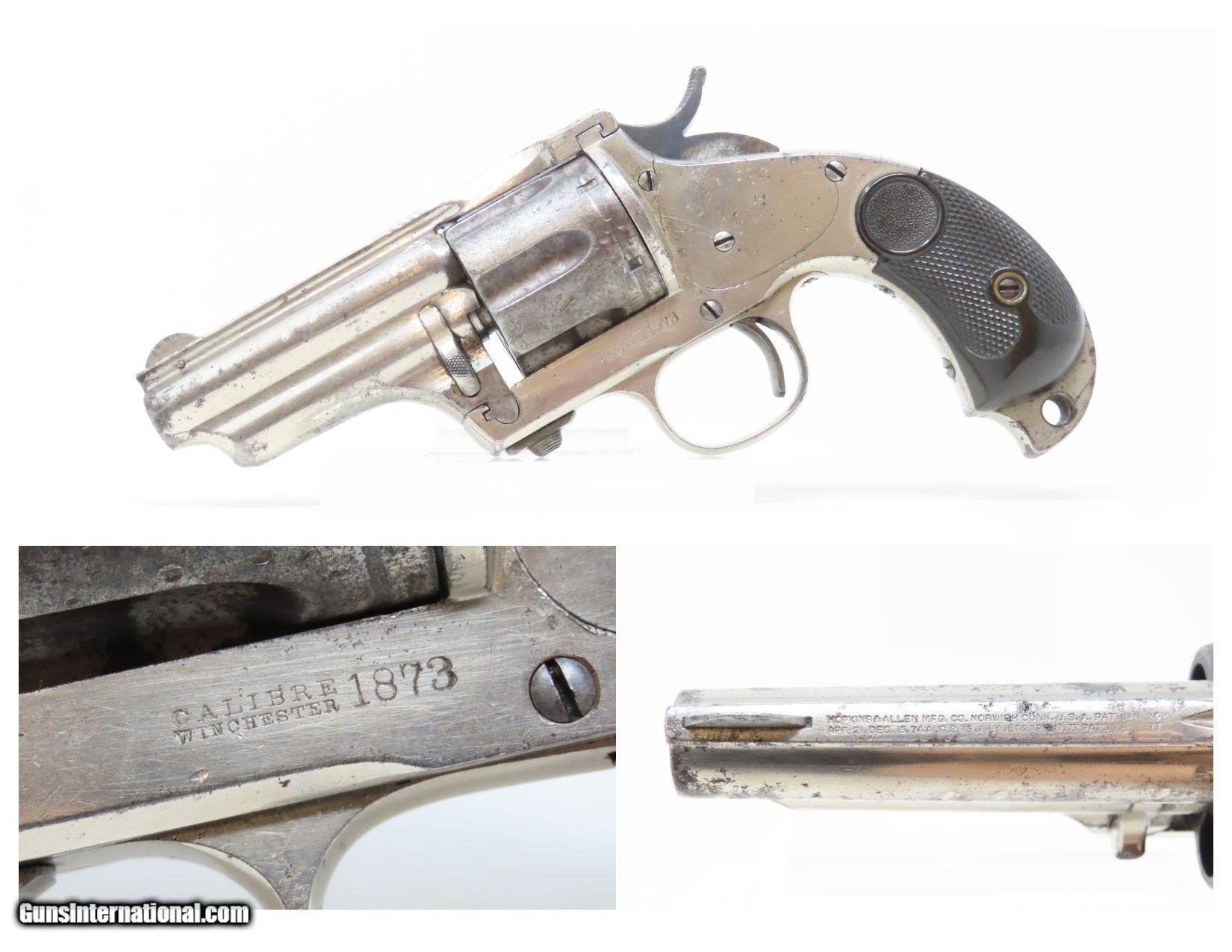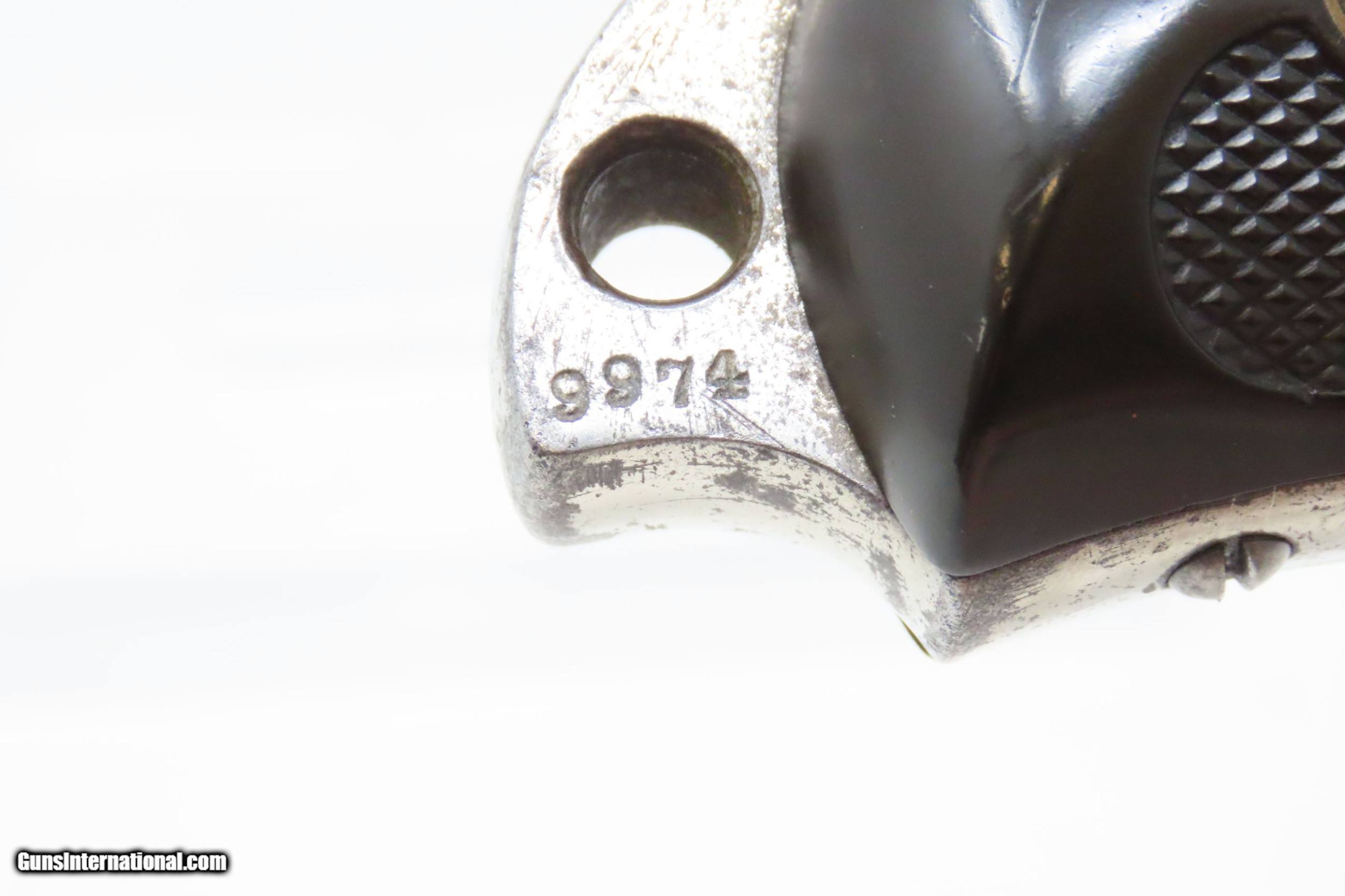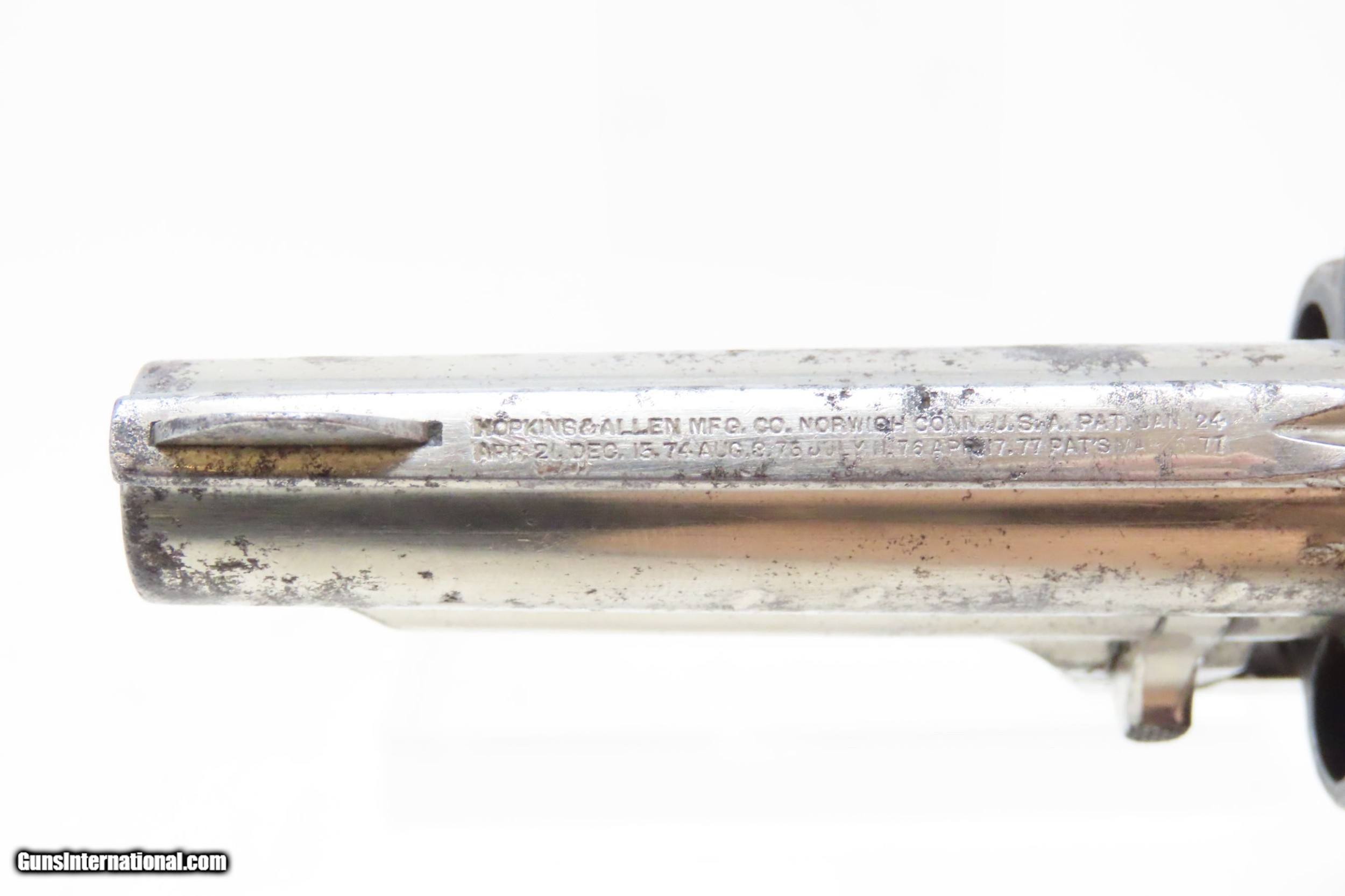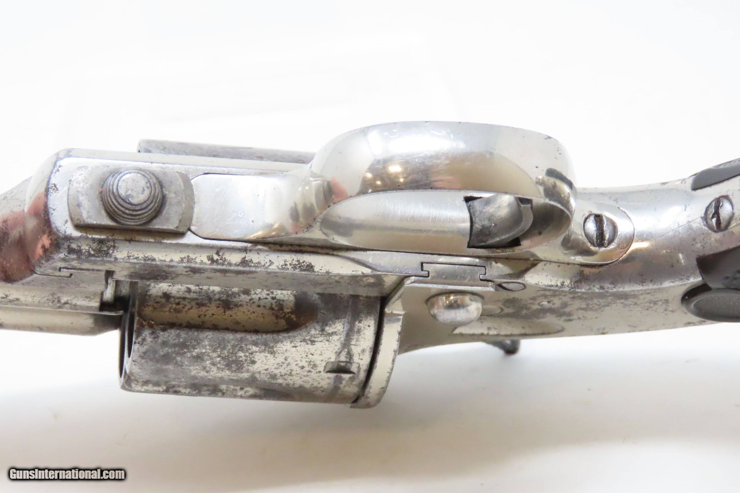 Description: MERWIN, HULBERT & Co. Antique “POCKET ARMY” .44 WCF Single Action Revolver .44-40 With “SKULL CRUSHER” Grip Frame Here we present an antique Merwin, Hulbert & Co. Pocket Army Single Action Revolver, made circa 1880-1883 in Norwich, Connecticut by Hopkins and Allen. These revolvers are considered today to be some of the best made of the late 19th Century and the Wild West, even better to some than similar Colts and Smith & Wessons, though we all know who stood the test of time. These revolvers certainly tended to have different, very well-thought features than their competition, and they were extremely well-made. A plus feature of this revolver was the method of ejection. Loading was achieved by placing the hammer at half-cock and sliding down the loading gate to single feed cartridges. If one wanted to unload the gun, they could simply push the latch back on the bottom of the gun, twist the barrel and cylinder assembly and pull forward. Only the empty brass would come out as the space created was shorter than a loaded cartridge, enabling the shooter to top off his gun and keep rounds available. An ingenious method was designed to achieve this that included a machined cut on the cylinder axis pin and a ledge on the breech face that kept the cartridge rims underneath. This system was also advantageous for forcefully removing stuck cartridges, providing lots of mechanical advantage. Both 3-1/2 inch and 7 inch barrels could be purchased, with the customer able to purchase both. Barrels were easily changed by the owner without tools, offering a 'two-guns in one' advantage over the competition, with the shorter barrel giving the owner a concealable firearm for in town, and a longer barrel for the field. The overall condition is very good. Original nickel finish. Excellent action. Bright and rifled bore. Fine grips with sharp checkering and little to no handling wear. Sharp markings. Numbers match. Own the original! This is a legitimate antique and not a reproduction. Barrel is 3-1/2 inches. Caliber: .44-40 WCF Overall condition as seen in photos. Very Fast. Very Safe. FREE SHIPPING WORLDWIDE. Delivered directly to your door by express mail! Guaranteed AUTHENTIC & Includes CERTIFICATE OF AUTHENTICITY. ancestryguns $3995 #217490 SOLD Antique: Yes |