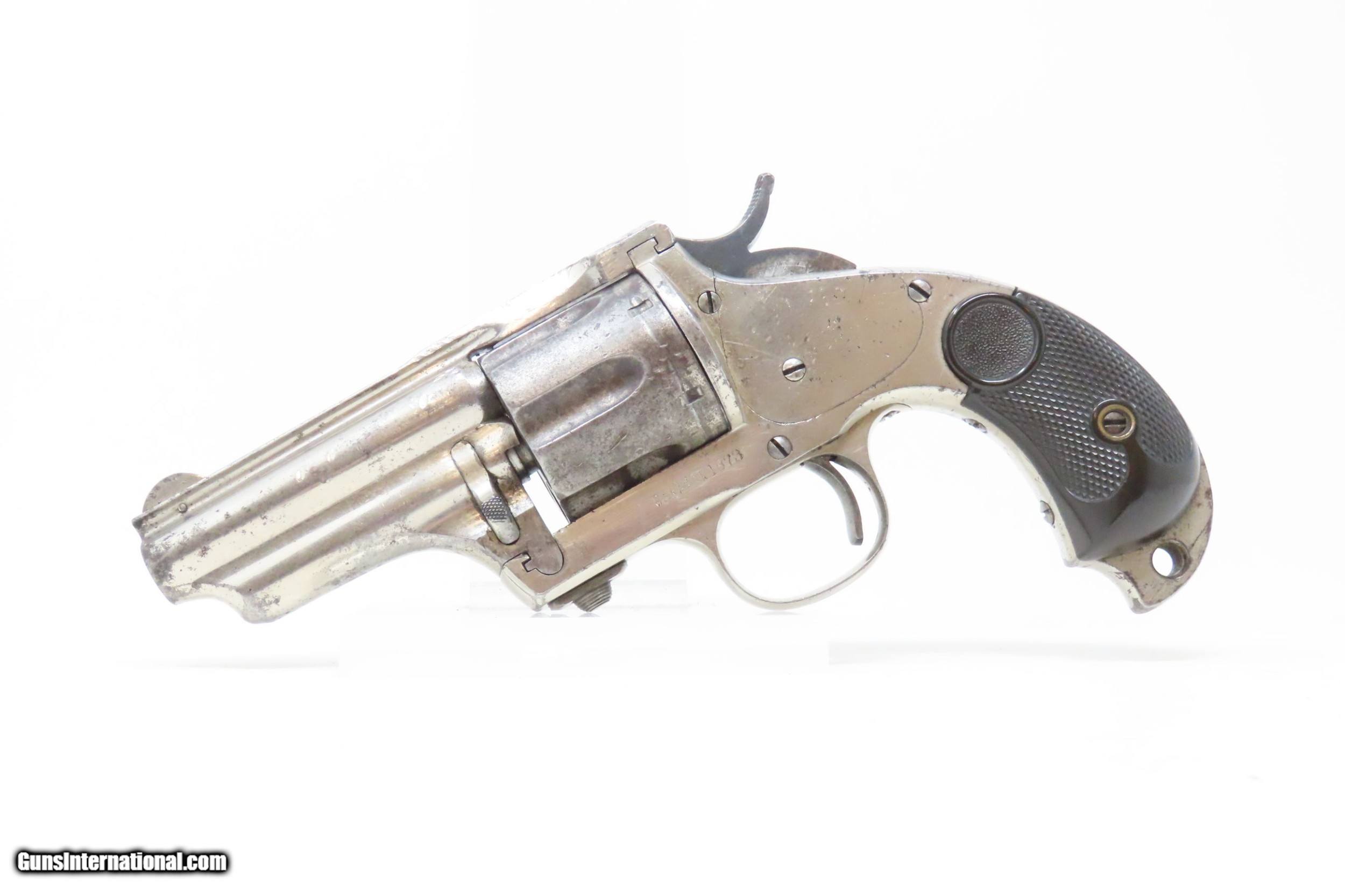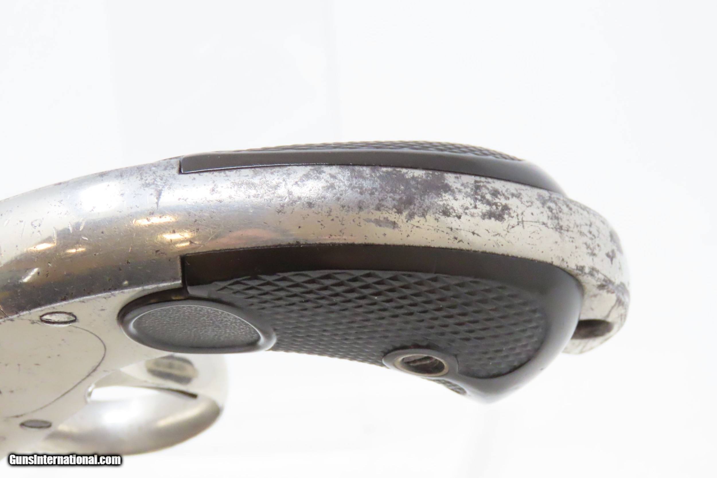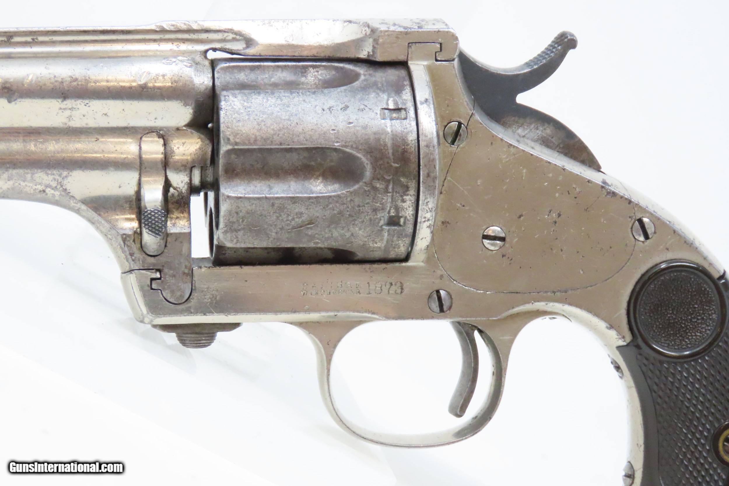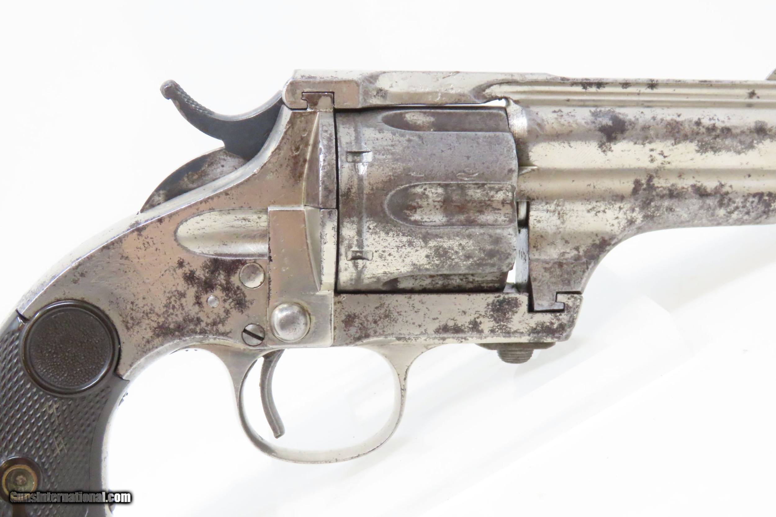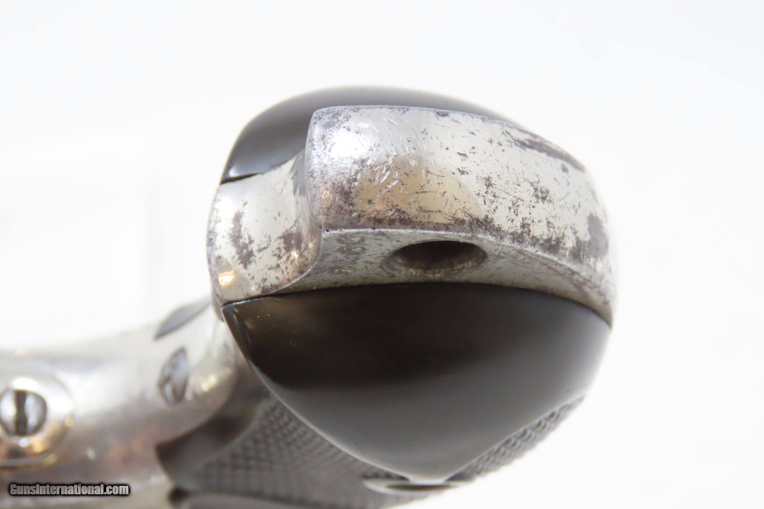 Description: MERWIN, HULBERT & Co. Antique “POCKET ARMY” .44 WCF Single Action Revolver .44-40 With “SKULL CRUSHER” Grip Frame Here we present an antique Merwin, Hulbert & Co. Pocket Army Single Action Revolver, made circa 1880-1883 in Norwich, Connecticut by Hopkins and Allen. These revolvers are considered today to be some of the best made of the late 19th Century and the Wild West, even better to some than similar Colts and Smith & Wessons, though we all know who stood the test of time. These revolvers certainly tended to have different, very well-thought features than their competition, and they were extremely well-made. A plus feature of this revolver was the method of ejection. Loading was achieved by placing the hammer at half-cock and sliding down the loading gate to single feed cartridges. If one wanted to unload the gun, they could simply push the latch back on the bottom of the gun, twist the barrel and cylinder assembly and pull forward. Only the empty brass would come out as the space created was shorter than a loaded cartridge, enabling the shooter to top off his gun and keep rounds available. An ingenious method was designed to achieve this that included a machined cut on the cylinder axis pin and a ledge on the breech face that kept the cartridge rims underneath. This system was also advantageous for forcefully removing stuck cartridges, providing lots of mechanical advantage. Both 3-1/2 inch and 7 inch barrels could be purchased, with the customer able to purchase both. Barrels were easily changed by the owner without tools, offering a 'two-guns in one' advantage over the competition, with the shorter barrel giving the owner a concealable firearm for in town, and a longer barrel for the field. The overall condition is very good. Original nickel finish. Excellent action. Bright and rifled bore. Fine grips with sharp checkering and little to no handling wear. Sharp markings. Numbers match. Own the original! This is a legitimate antique and not a reproduction. Barrel is 3-1/2 inches. Caliber: .44-40 WCF Overall condition as seen in photos. Very Fast. Very Safe. FREE SHIPPING WORLDWIDE. Delivered directly to your door by express mail! Guaranteed AUTHENTIC & Includes CERTIFICATE OF AUTHENTICITY. ancestryguns $3995 #217490 SOLD Antique: Yes |