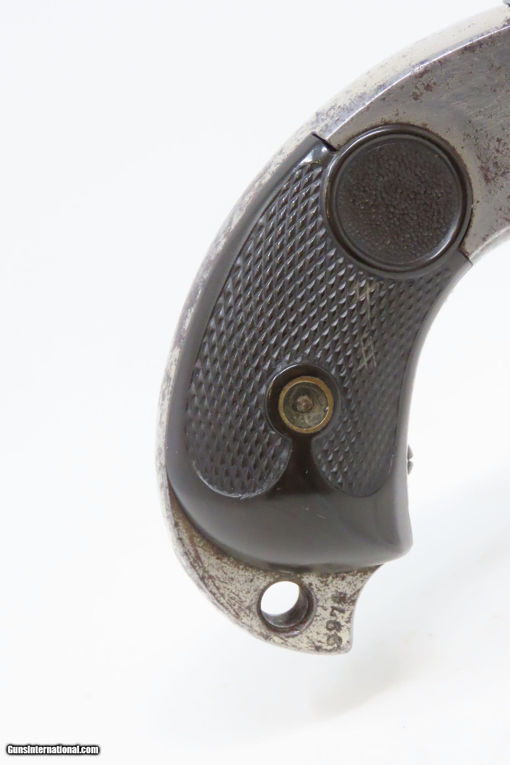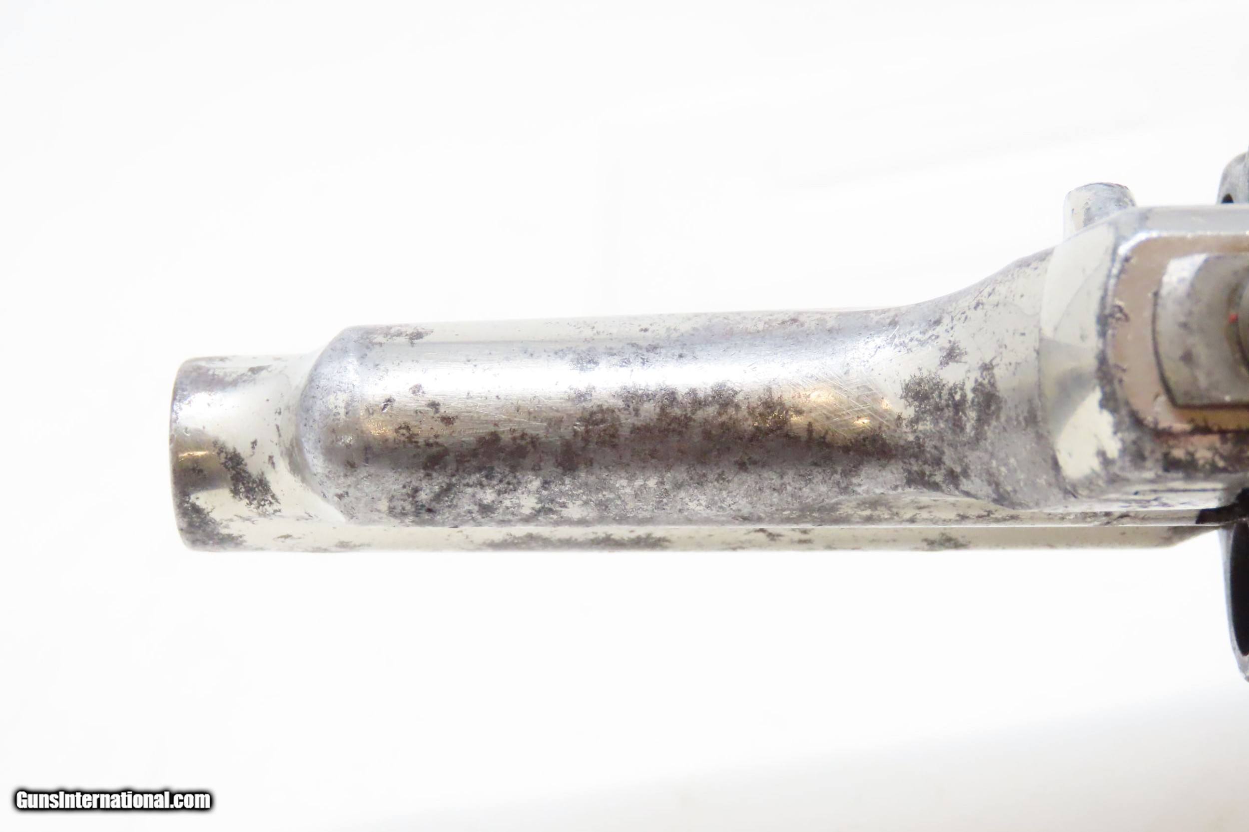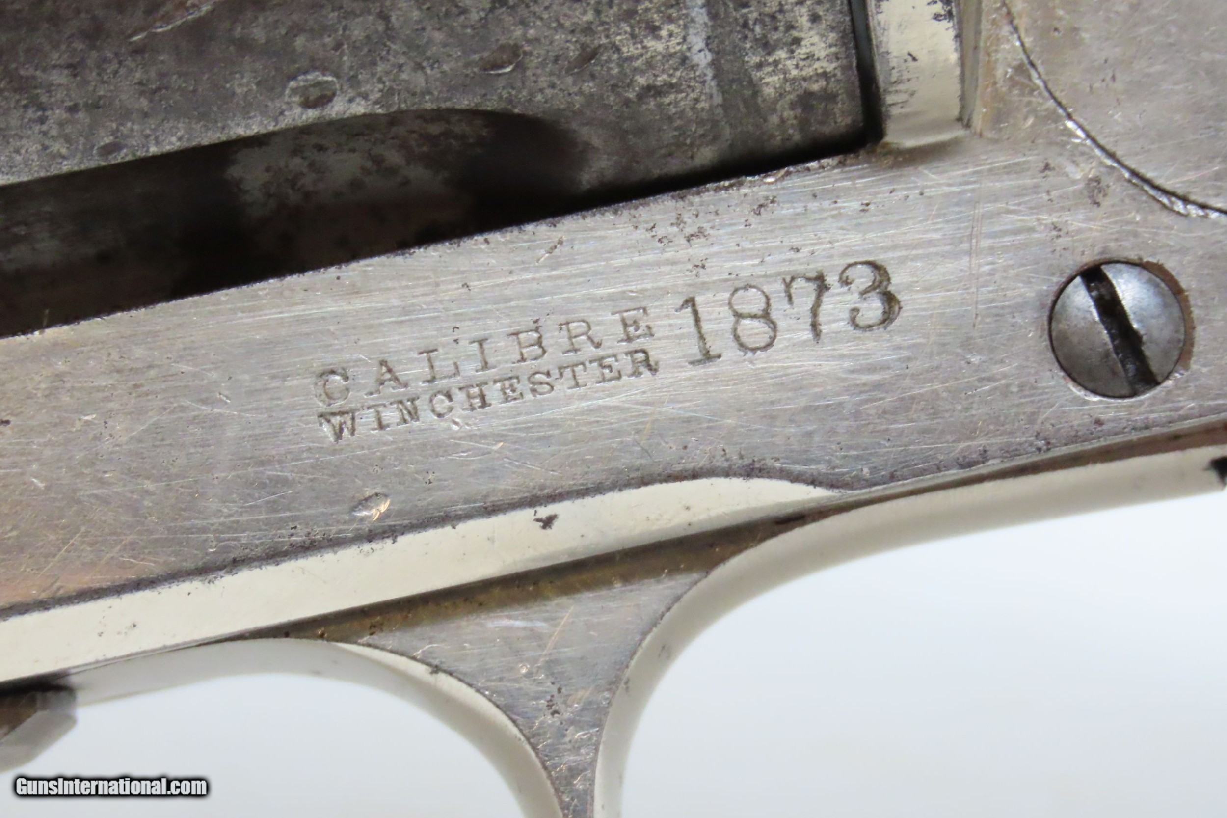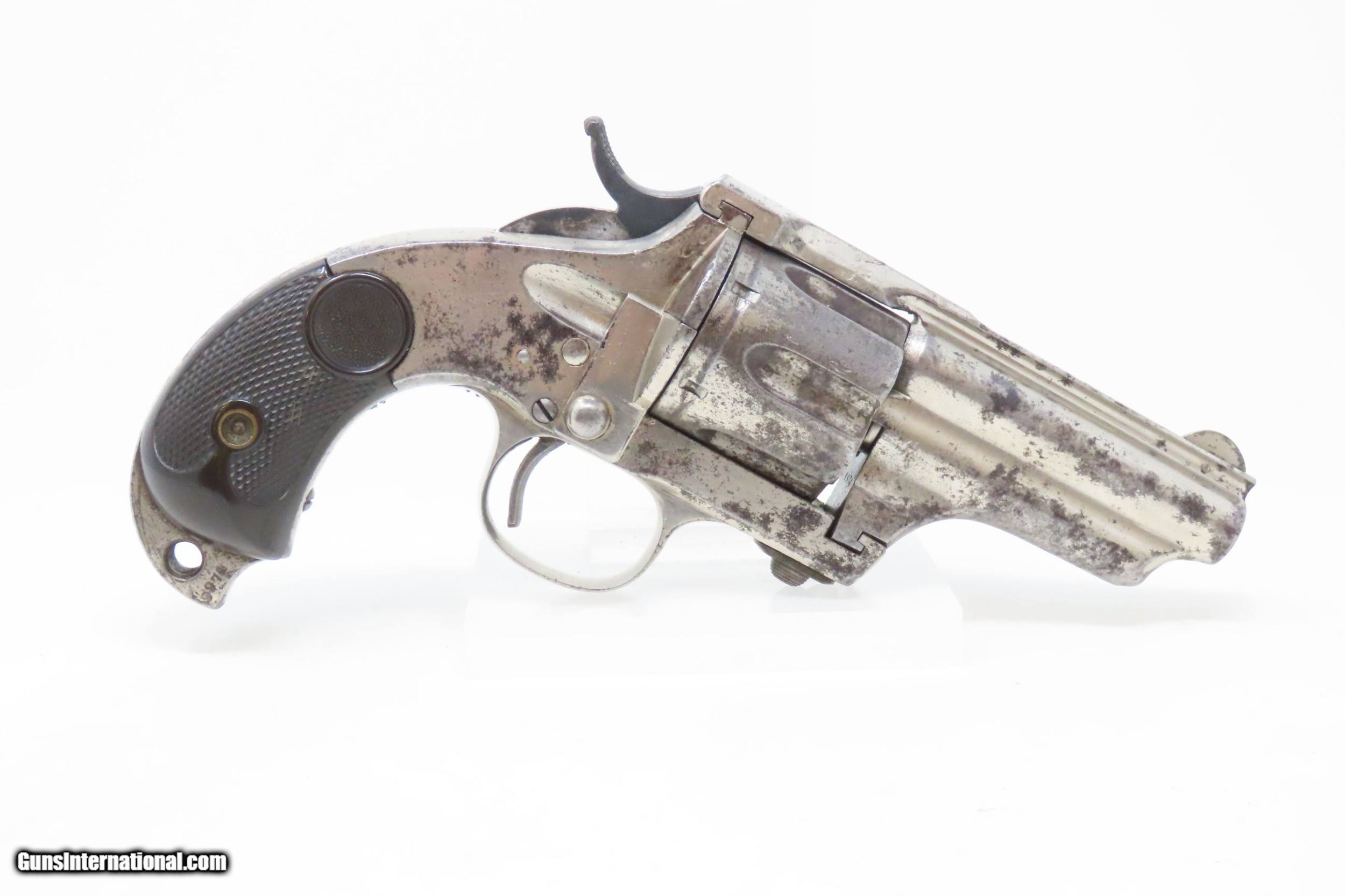 Description: MERWIN, HULBERT & Co. Antique “POCKET ARMY” .44 WCF Single Action Revolver .44-40 With “SKULL CRUSHER” Grip Frame Here we present an antique Merwin, Hulbert & Co. Pocket Army Single Action Revolver, made circa 1880-1883 in Norwich, Connecticut by Hopkins and Allen. These revolvers are considered today to be some of the best made of the late 19th Century and the Wild West, even better to some than similar Colts and Smith & Wessons, though we all know who stood the test of time. These revolvers certainly tended to have different, very well-thought features than their competition, and they were extremely well-made. A plus feature of this revolver was the method of ejection. Loading was achieved by placing the hammer at half-cock and sliding down the loading gate to single feed cartridges. If one wanted to unload the gun, they could simply push the latch back on the bottom of the gun, twist the barrel and cylinder assembly and pull forward. Only the empty brass would come out as the space created was shorter than a loaded cartridge, enabling the shooter to top off his gun and keep rounds available. An ingenious method was designed to achieve this that included a machined cut on the cylinder axis pin and a ledge on the breech face that kept the cartridge rims underneath. This system was also advantageous for forcefully removing stuck cartridges, providing lots of mechanical advantage. Both 3-1/2 inch and 7 inch barrels could be purchased, with the customer able to purchase both. Barrels were easily changed by the owner without tools, offering a 'two-guns in one' advantage over the competition, with the shorter barrel giving the owner a concealable firearm for in town, and a longer barrel for the field. The overall condition is very good. Original nickel finish. Excellent action. Bright and rifled bore. Fine grips with sharp checkering and little to no handling wear. Sharp markings. Numbers match. Own the original! This is a legitimate antique and not a reproduction. Barrel is 3-1/2 inches. Caliber: .44-40 WCF Overall condition as seen in photos. Very Fast. Very Safe. FREE SHIPPING WORLDWIDE. Delivered directly to your door by express mail! Guaranteed AUTHENTIC & Includes CERTIFICATE OF AUTHENTICITY. ancestryguns $3995 #217490 SOLD Antique: Yes |