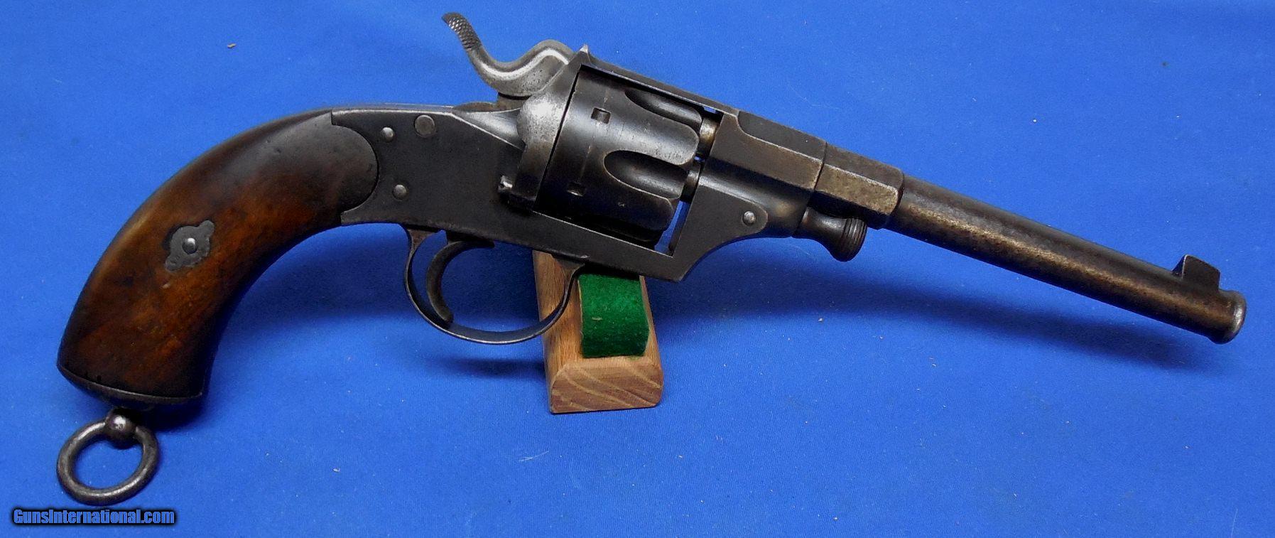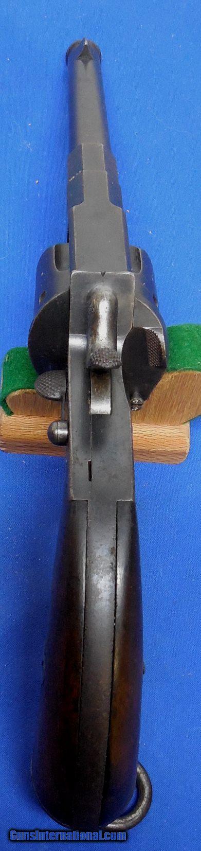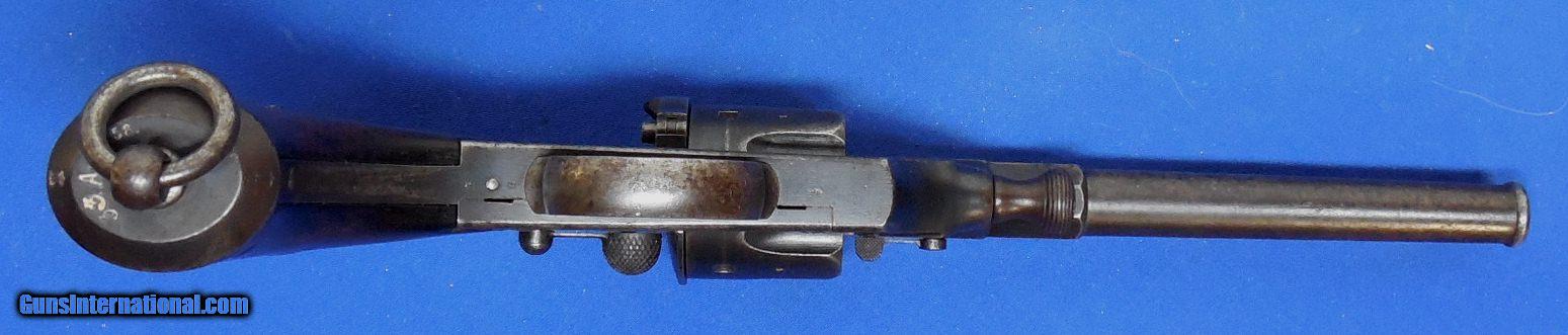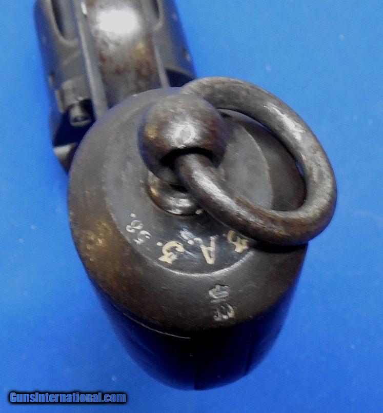 Description: German Model 1879 Reichsrevolver "Unit Marked", made by V.C. Schilling & Company, serial # 43, cal. 11mm German Ordnance, has a 7" barrel with a good plus bore that shows some scattered light peppery pitting between the lands. The frame (date stamped 1881) shows a balance between original blue, fading and oxidation staining, the barrel shows oxidation staining throughout with silvering. The walnut grips are very good showing a few dings, handling marks and abrasions but nothing alarming. All visible serial numbers are matching and there is a unit marking on bottom of the grip near lanyard which reads "33.A.3.58." which is likely an artillery unit marking. A great piece for the collector of German or military firearms. These revolvers are becoming scarce and this one is in good plus plus - very good condition overall. Inv,: # 12-141 SOLD Antique: Yes |