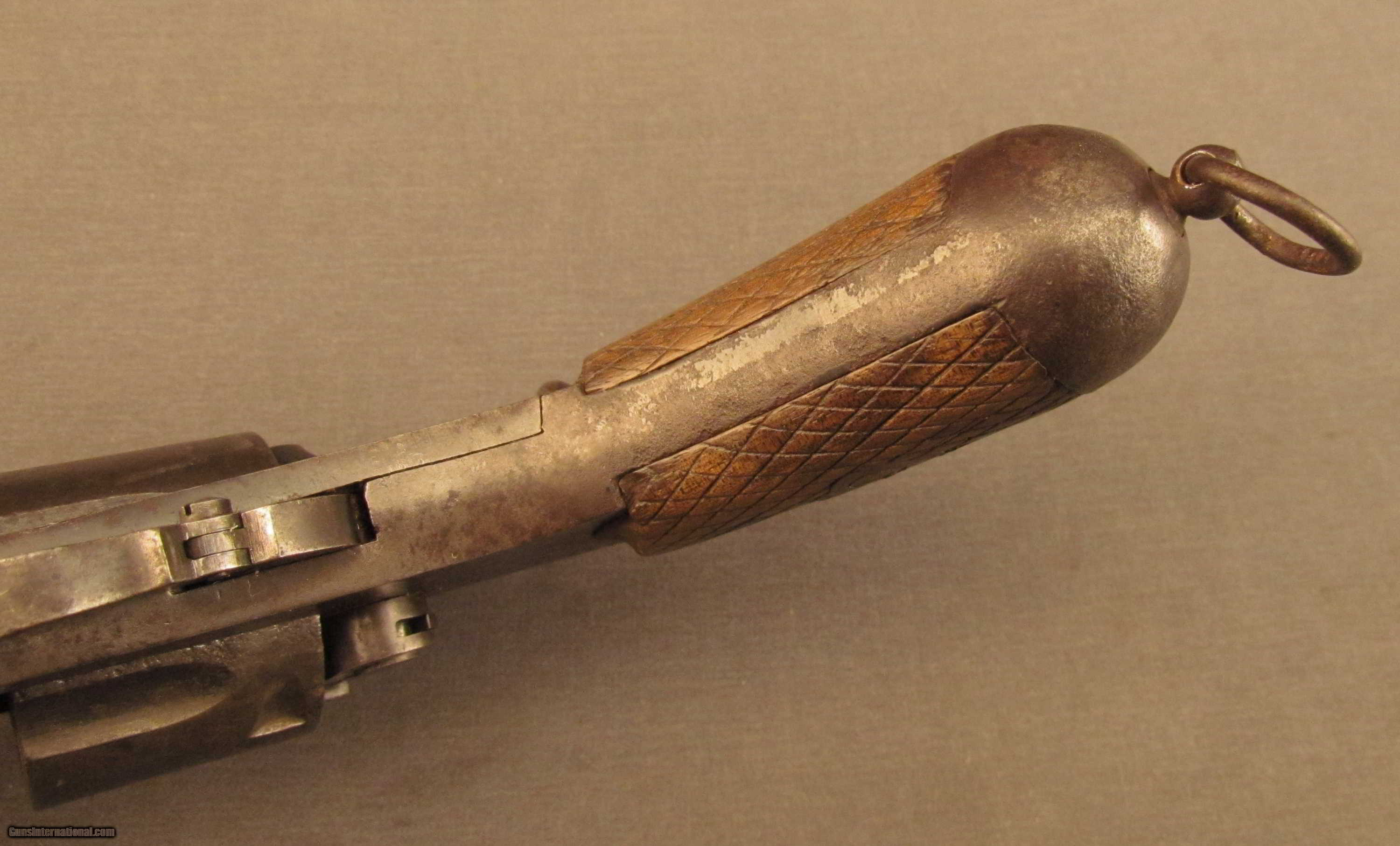 Description: Serial #AF8685, 10.4mm, 4 1/2” octagon barrel with a very good bore that has a few spots of dark pitting along its length. This is a 1916 dated, enlisted model revolver with folding, guard-less trigger that retains about 20-25% of the original blue with the balance having turned to a dark pewter gray patina having scattered spots of light freckling and moderate-heavy pitting towards the muzzle and underside of the barrel. The fluted cylinder has some further light oxidation along the edges of the flutes. Interestingly, the pistol has a Rome contractor marking but was made by Arizmendi of Eibar, Spain. The knurled wooden grips are in very good condition but have light wear with minor handling marks throughout. The mechanism is fully functional and has good timing and lock-up. These are seldom seen revolvers and this example is in very good plus condition overall and is a nice looking, war-dated example. FFL or C&R SOLD Curio/Relic: Yes Manufacturer: Italian Model: 1889 Serial Number: AF8685 Caliber Info: 10.4mm Gauge Info: 10.4mm |