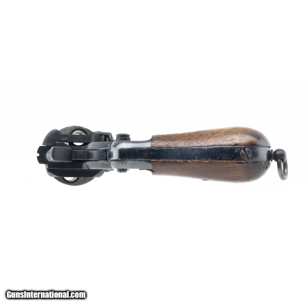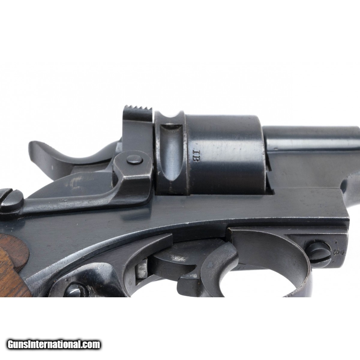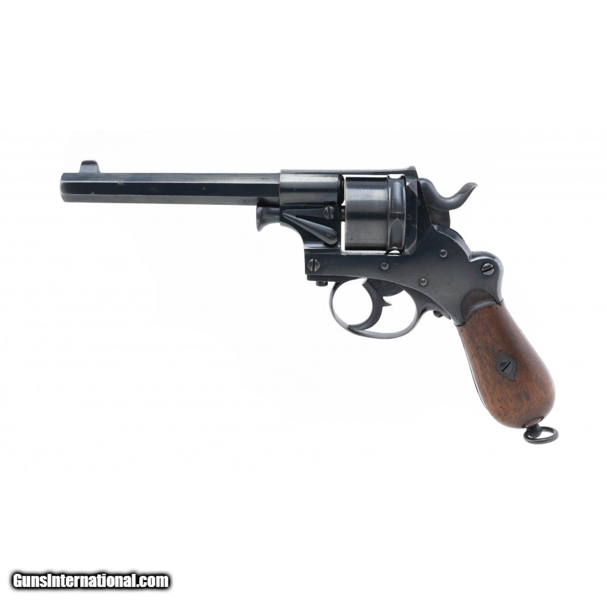 Description: " Based on the Chamelot Delvigne Design. This six-round double-action revolver chambered in 9.4mm, has a 6.3"" octagonal barrel. It was issued to the military in 1873, and was in service through 1945. The Bore is excellent. action works perfectly. Revolver has 98% original factory blue. The grips are smooth wood and show very minor handling wear. This revolver is well made and designed for heavy duty usage. All the serials are matching. A superior condition example for this model revolver. SOLD Antique: Yes |
