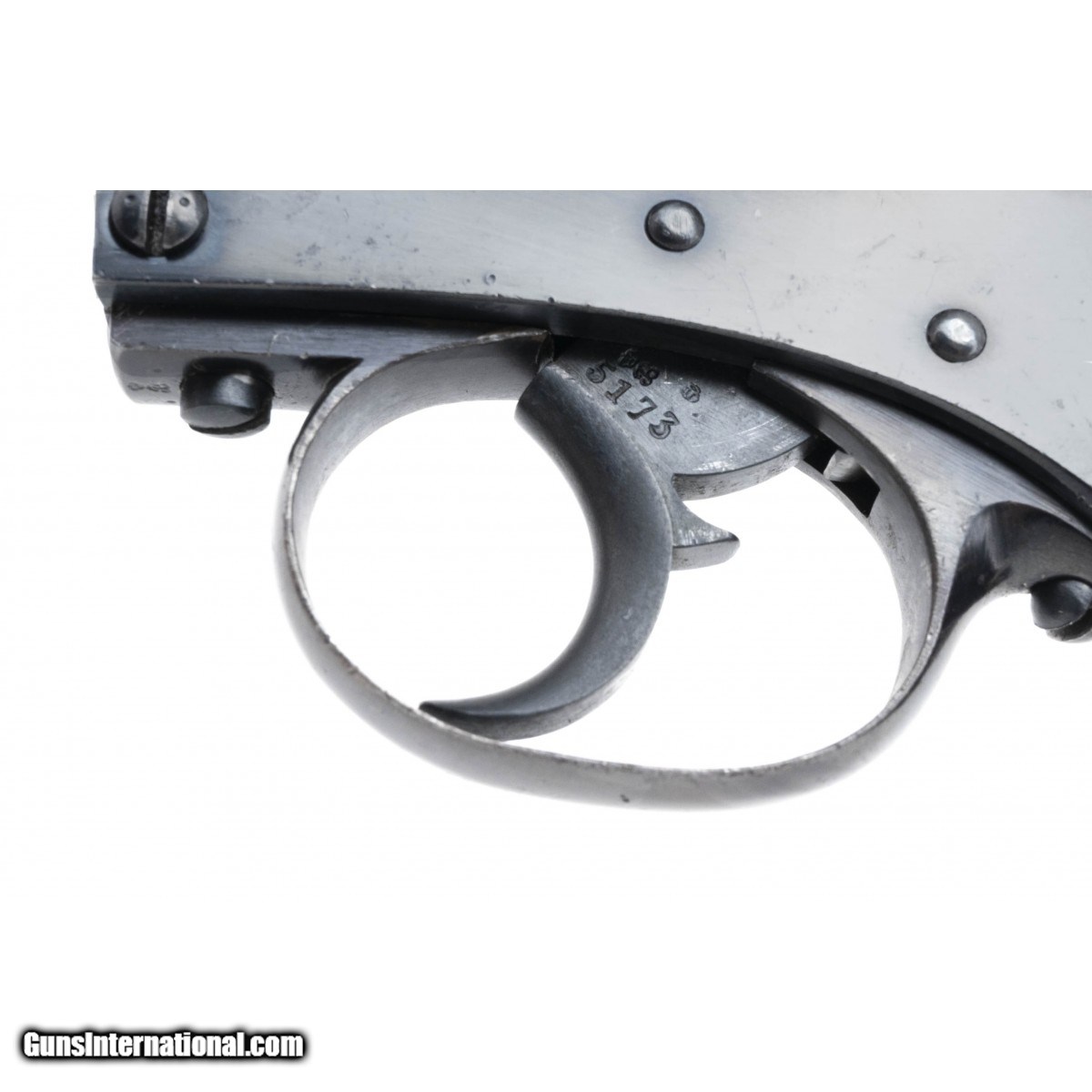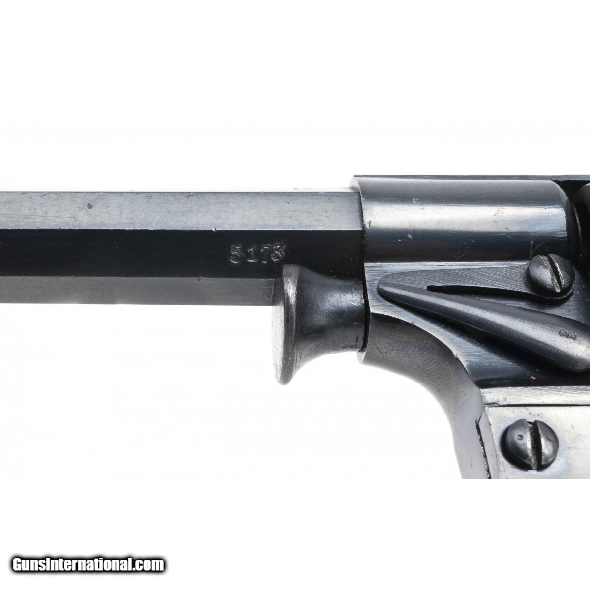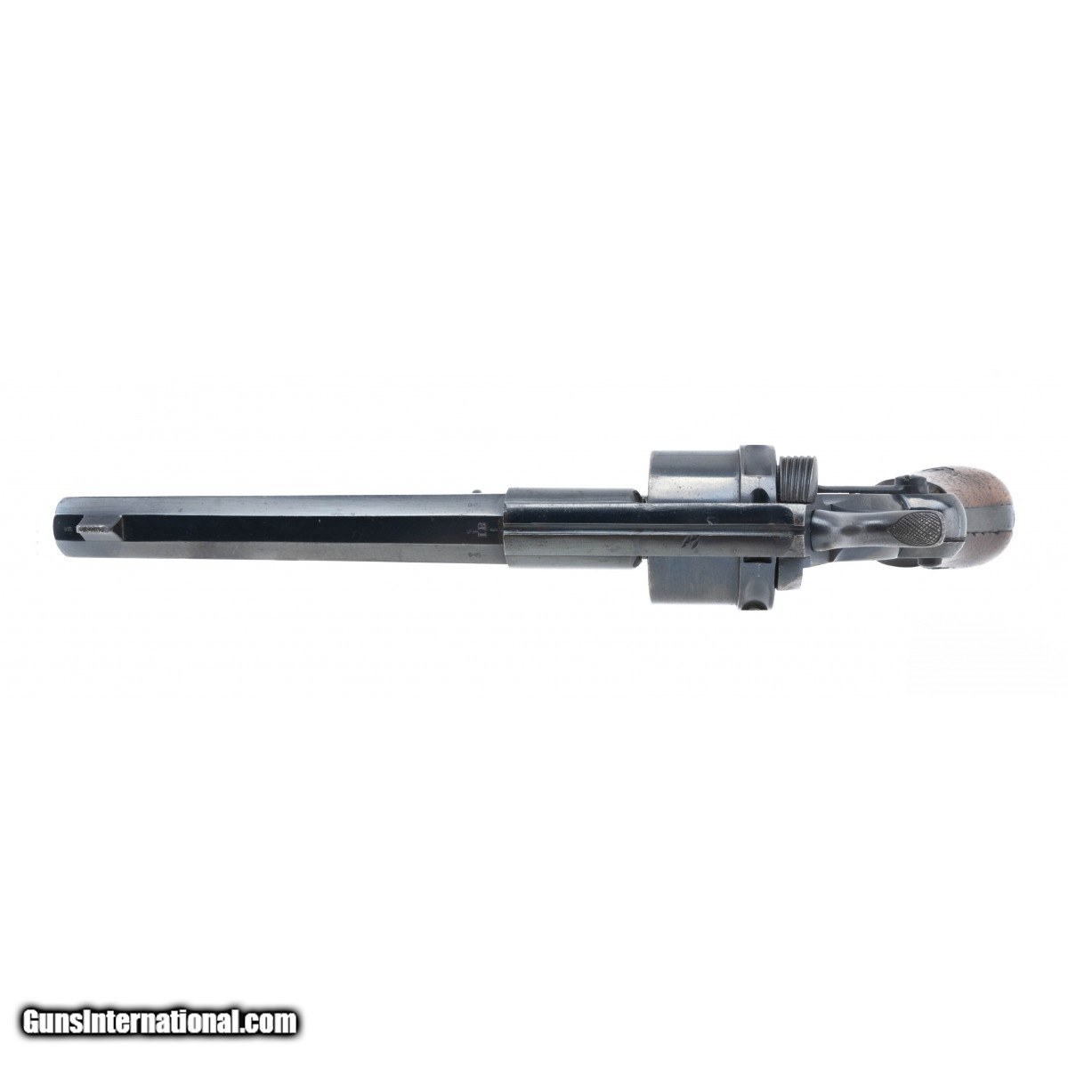 Description: " Based on the Chamelot Delvigne Design. This six-round double-action revolver chambered in 9.4mm, has a 6.3"" octagonal barrel. It was issued to the military in 1873, and was in service through 1945. The Bore is excellent. action works perfectly. Revolver has 98% original factory blue. The grips are smooth wood and show very minor handling wear. This revolver is well made and designed for heavy duty usage. All the serials are matching. A superior condition example for this model revolver. SOLD Antique: Yes |