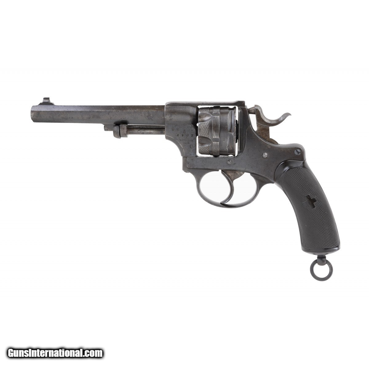 The Model 1878 was the first Swiss-made revolver used by the Swiss Army. About 6,000 were made by Waffenfabrik Bern, and so marked on the left side of the frame. This Schmidt-Galand type revolver is chambered for the 10.4mm centerfire cartridge. The overall length is approx. 11.5"". The frame is solid with a fixed cylinder and hand operated rod ejection. The 4.5"" octagon barrel has a good bore with strong rifling with light erosion. The pistol retains most of its original military blue finish with light freckling throughout. The serial number, 4132, is marked on the barrel, frame, cylinder, and trigger (last three digits). There are three proof marks on the left side of the frame and one on the barrel. The checkered composition grips, with the Swiss cross on the left grip, are excellent overall. Swiss cavalry units were issued the Model 1878 revolver. These are rarely seen today.