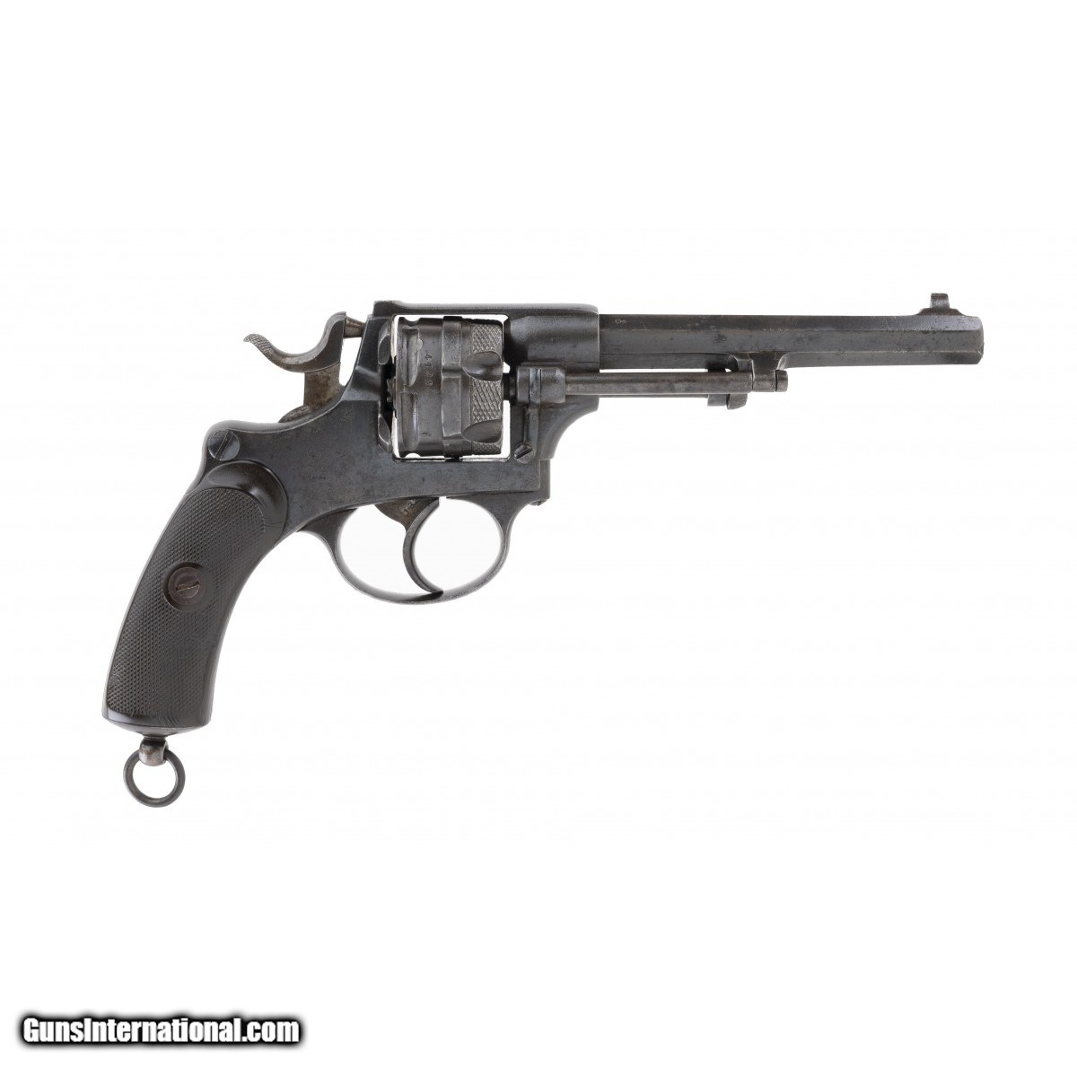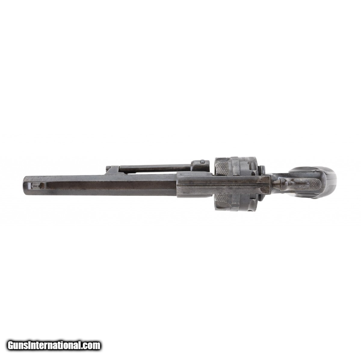Description: " The Model 1878 was the first Swiss-made revolver used by the Swiss Army. About 6,000 were made by Waffenfabrik Bern, and so marked on the left side of the frame. This Schmidt-Galand type revolver is chambered for the 10.4mm centerfire cartridge. The overall length is approx. 11.5"". The frame is solid with a fixed cylinder and hand operated rod ejection. The 4.5"" octagon barrel has a good bore with strong rifling with light erosion. The pistol retains most of its original military blue finish with light freckling throughout. The serial number, 4132, is marked on the barrel, frame, cylinder, and trigger (last three digits). There are three proof marks on the left side of the frame and one on the barrel. The checkered composition grips, with the Swiss cross on the left grip, are excellent overall. Swiss cavalry units were issued the Model 1878 revolver. These are rarely seen today. SOLD Antique: Yes |