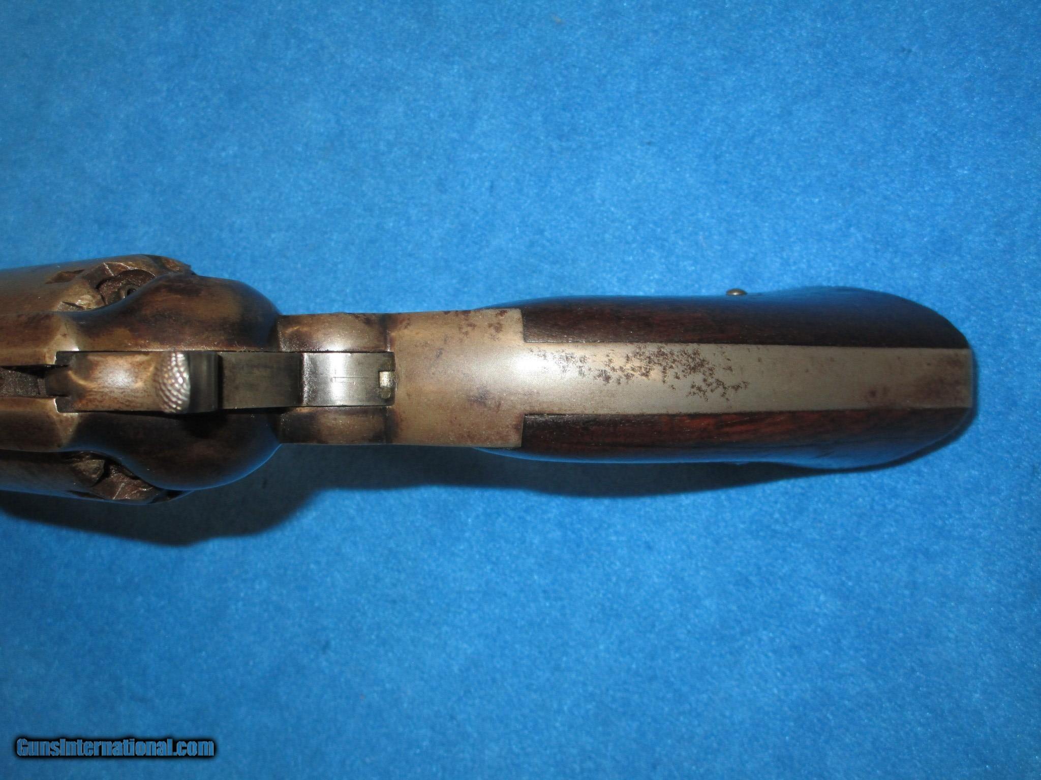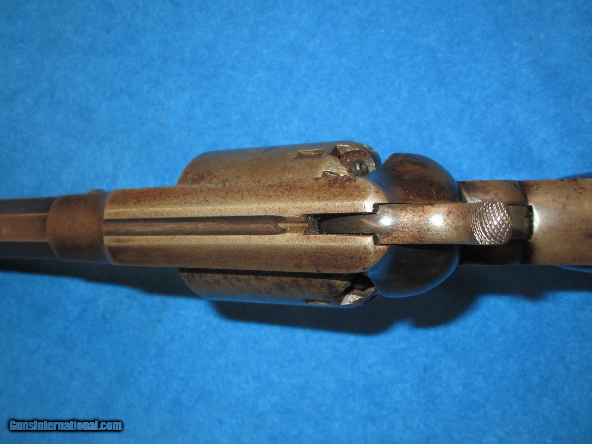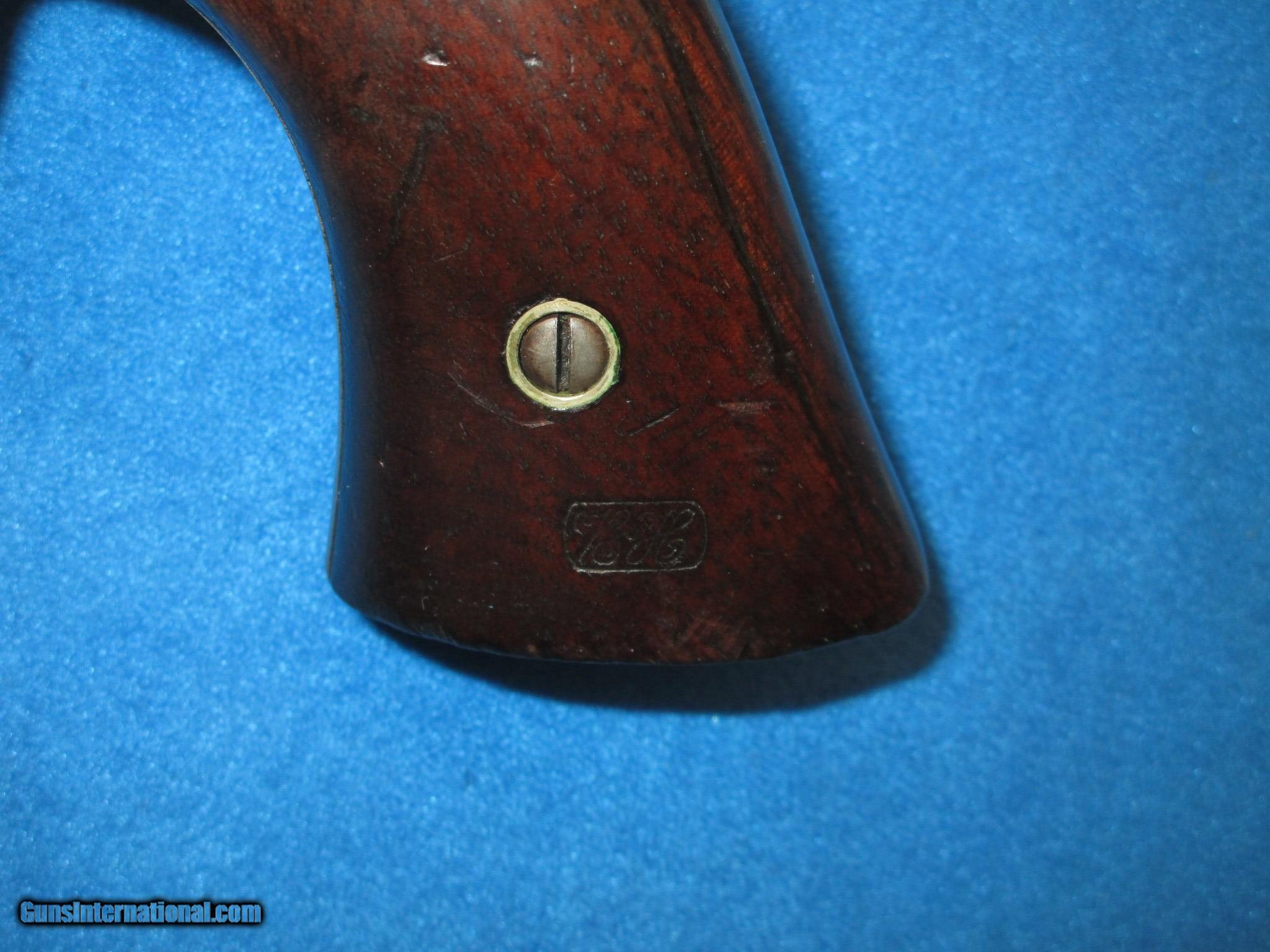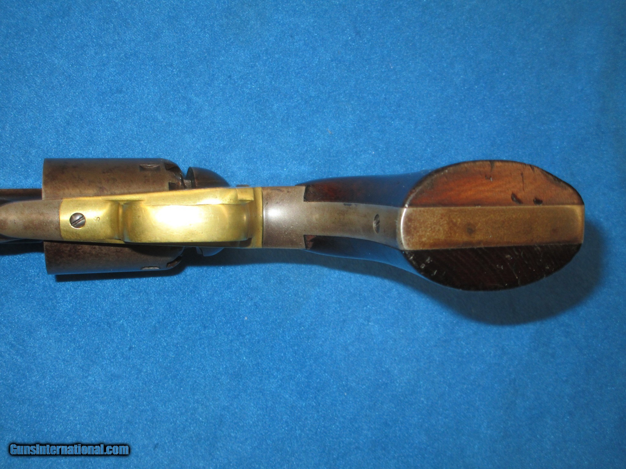 Description: AN EARLY U.S. CIVIL WAR MILITARY ISSUED REMINGTON OLD MODEL 1861 PERCUSSION ARMY REVOLVER IN NICE UNTOUCHED CONDITION. SERIAL #2,295, ALL MATCHING NUMBERS. ALL ORIGINAL & COMPLETE. ONLY 6,000 MADE IN 1862. IT HAS FINE METAL, MARKINGS, & CRISP EDGES. IT IS FULLY U.S. SUB INSPECTED. THE BARREL HAS A MIX OF NATURAL PATINA WITH ORIGINAL FACTORY BLUE RUNNING ALL THROUGH IT. THE REST OF THE GUN HAS THE SAME PATINA WITH NO BLUE SHOWING. ALL SCREWS ARE FINE. THE BRASS TRIGGER GUARD IS FINE & UNTOUCHED. IT HAS FINE PLUS ORIGINAL GRIPS WITH A VERY CRISP & CLEAR U.S. INSPECTORS CARTOUCHE ON THE LEFT SIDE. IT HAS AN EXCELLENT BORE & ACTION. THIS IS A VERY FINE LOOKING EXAMPLE OF A U.S CIVIL WAR OLD MODEL REMINGTON MODEL 1861 ARMY REVOLVER. THESE EARLY U.S ISSUED REMINGTON ARMY REVOLVERS ARE VERY DIFFICULT TO COME BY! SOLD Antique: Yes Manufacturer: REMINGTON Model: U.S. MARTIAL REMINGTON OLD MODEL 1861 ARMY REVOLVER Serial Number: 2,295 Caliber Info: .44 |