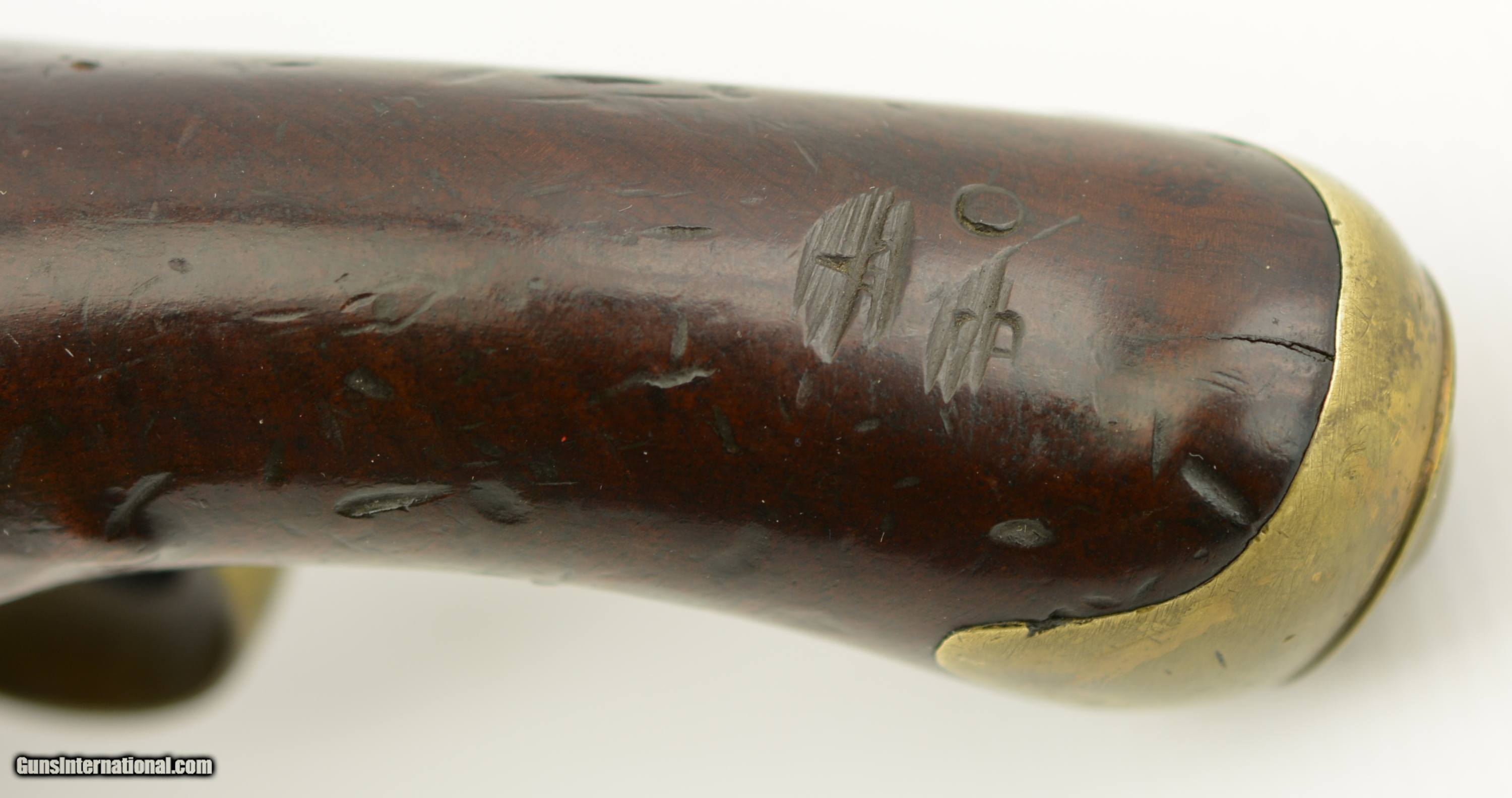 Description: NSN, .65 Caliber, 9" barrel with a fine, lightly freckled bore. This is a handsome pistol that has an overall pewter gray patina with dark brown freckling along the barrel, and further plum-brown freckling on the cock and frizzen. The lock is marked “(Crown) / GR" with “TOWER" at the rear, and has a matching gray-brown patina. The walnut stock has numerous small handling marks and blemishes, as well as purposefully defaced Broad Arrow and “BO" markings on the heel of the grip. The brass furniture has a mild ochre tarnish, and there are some parallel scratch marks on the exterior of the trigger guard bow. The pistol originally had a brass-tipped wooden ramrod, however a late pattern metal rod (with Crown stamp) is included instead. The rod is shortened at the base, and no longer has the bullet worm. This is a very nice example of a 1799 Pattern Light Dragoon pistol, and rates fine condition overall. Antique SOLD Antique: Yes Manufacturer: British Model: Dragoon Caliber Info: .65 Gauge Info: .65 |