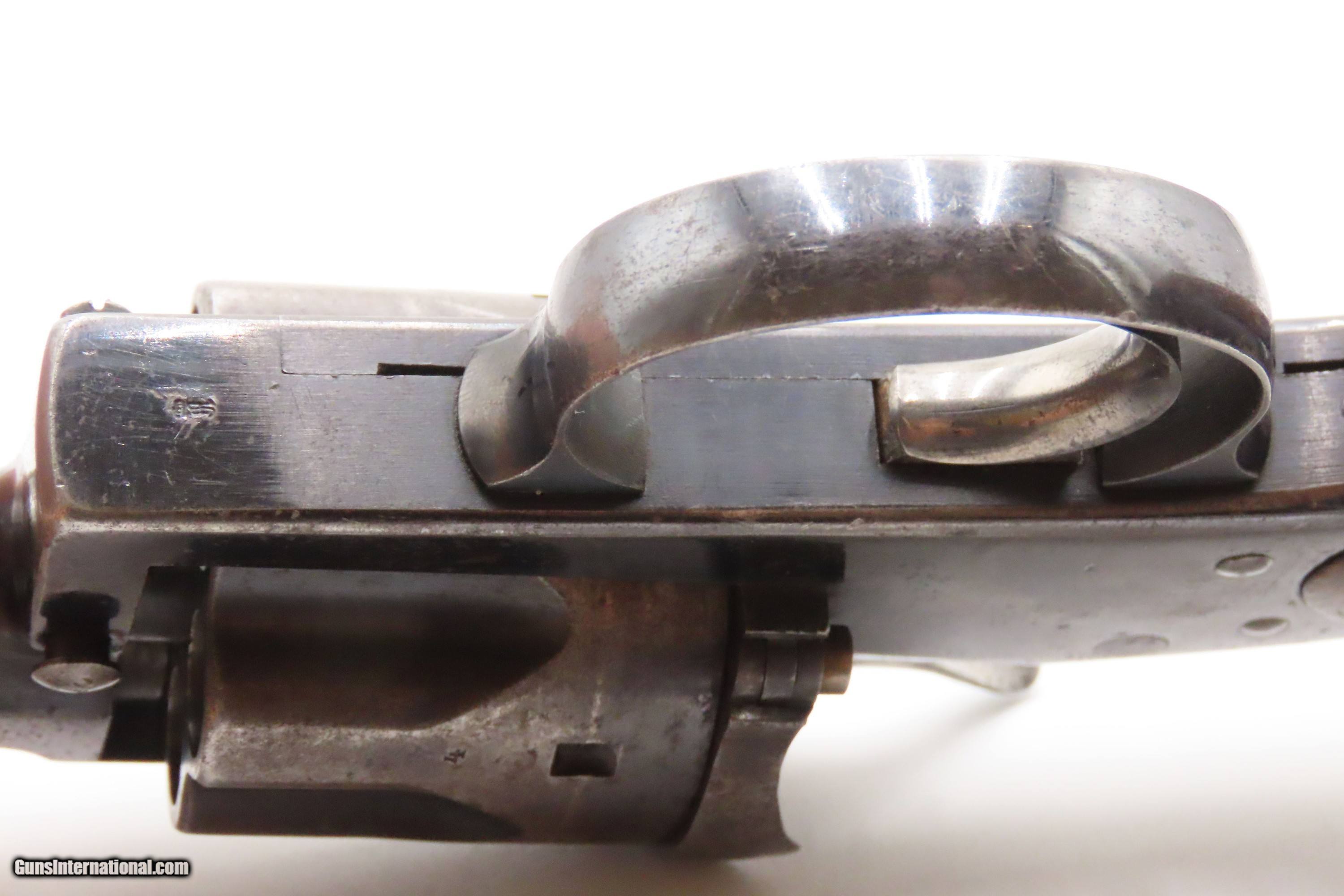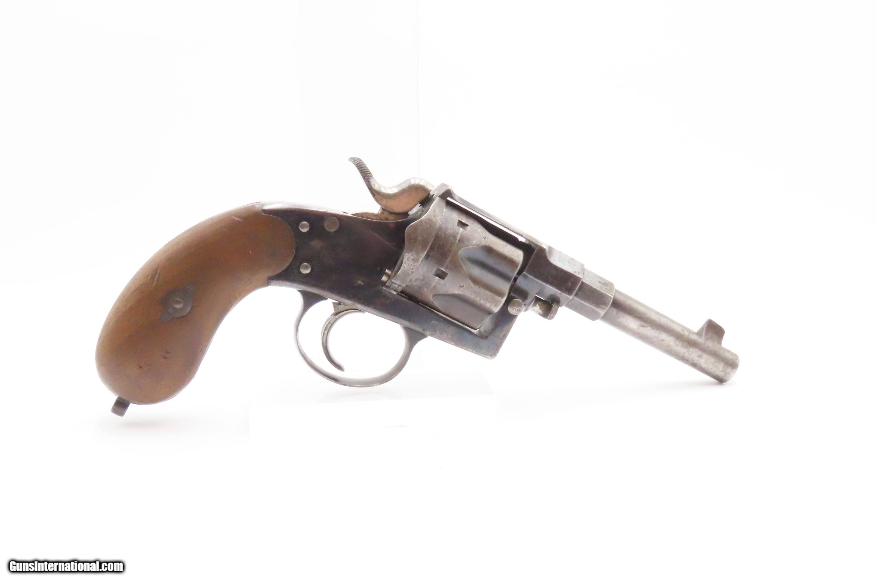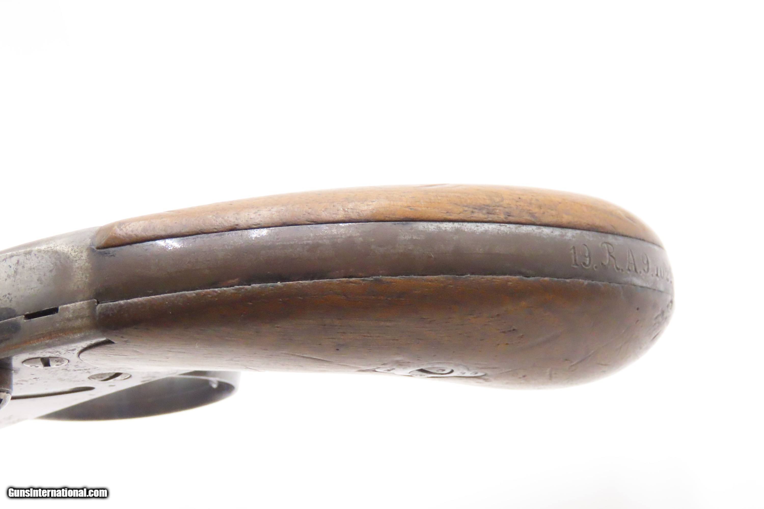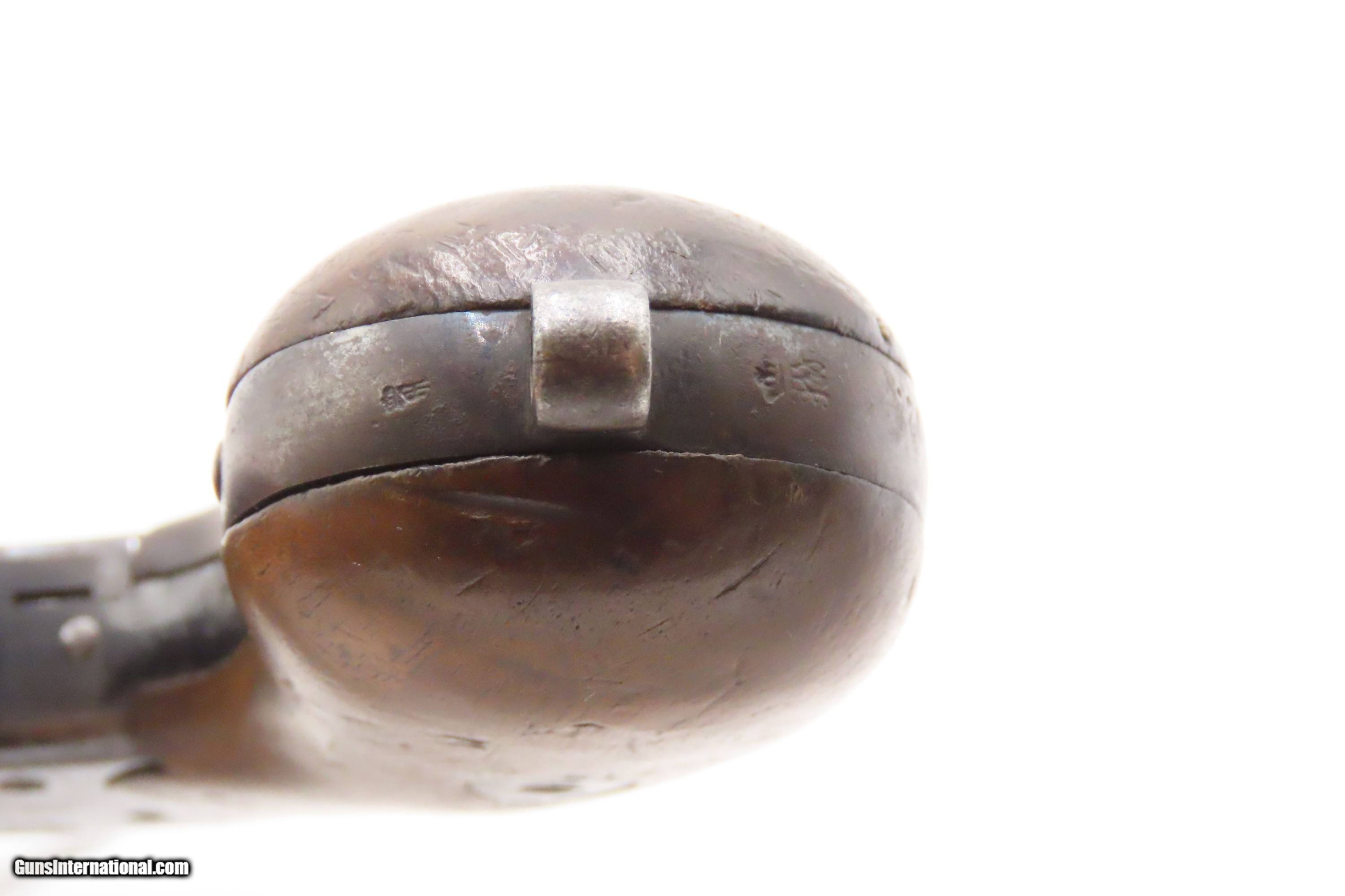 Description: c1893 UNIT MARKED Antique German ERFURT M1883 REICHS Revolver WWI & WWII Officer’s Sidearm Used in Both World Wars Here we present an antique Unit Marked German Erfurt Arsenal Model 1883 “Reichsrevolver” Single Action Revolver chambered in 10.55mm, made in 1893 at the Erfurt Arsenal in Erfurt, Germany. The Model 1879 Reichsrevolver, or Reichs Commission Revolver Model 1879 and the Model 1883 were both service revolvers used by the Imperial German Army from 1879 to 1908, when they were superseded by the classic Luger 9mm semi-automatic. They were both hefty, solid frame single action revolvers. It was the first centerfire revolver adopted by the fledgling German Empire, which was a simple design in line with similar European revolvers of the period. Besides Erfurt, various arsenals produced these guns, including Mauser and F. von Dreyse. This six-shot gun was loaded via a gate on the right side similar to a conventional single action such as Colt’s. Aside from the World Wars, it also saw action in the Boxer Rebellion and various colonial skirmishes. The overall condition is fine. Original finish. Matching numbers. Excellent action. Very good, bright, well-rifled bore. The grips are solid and show use. This example has an “1893” dated frame and a “19.R.A.9.102.” unit marking on the backstrap, which we believe is for the 19th Artillery Regiment. Own the original! This is a legitimate antique and not a reproduction. Barrel is 4-5/8 inches. Caliber: 10.55mm Overall condition as seen in photos. Very Fast. Very Safe. FREE SHIPPING WORLDWIDE. Delivered directly to your door by express mail! Guaranteed AUTHENTIC & Includes CERTIFICATE OF AUTHENTICITY. ancestryguns $2000 #247444 SOLD Antique: Yes |