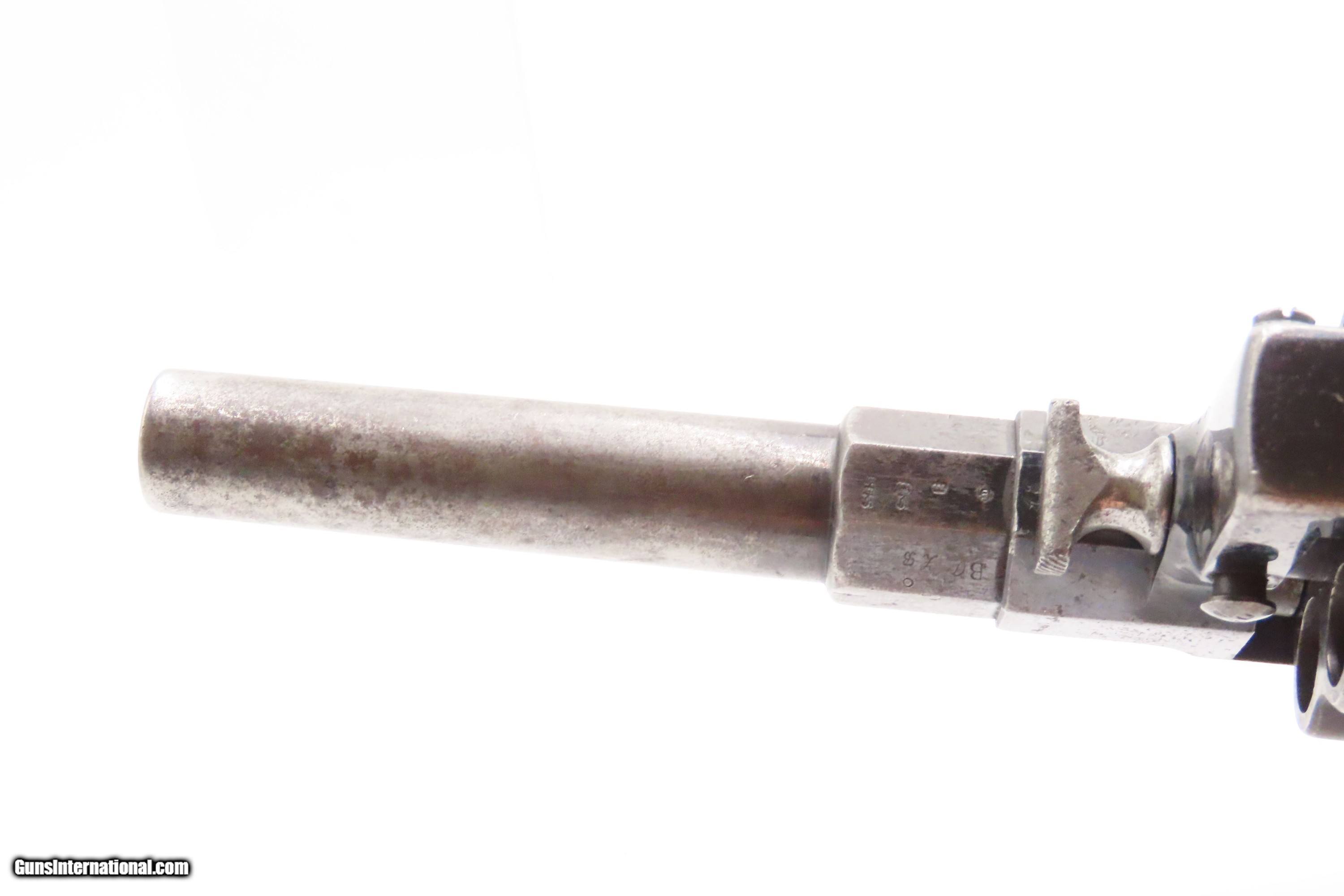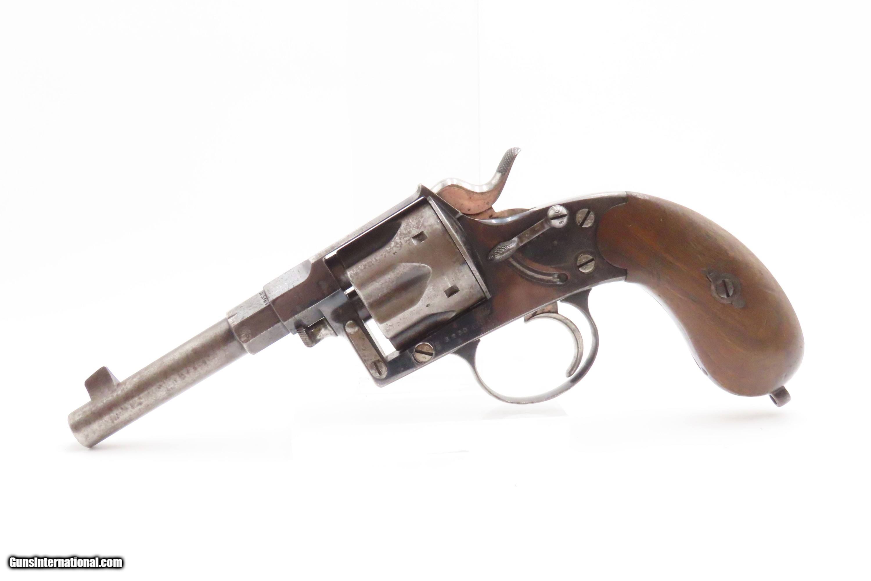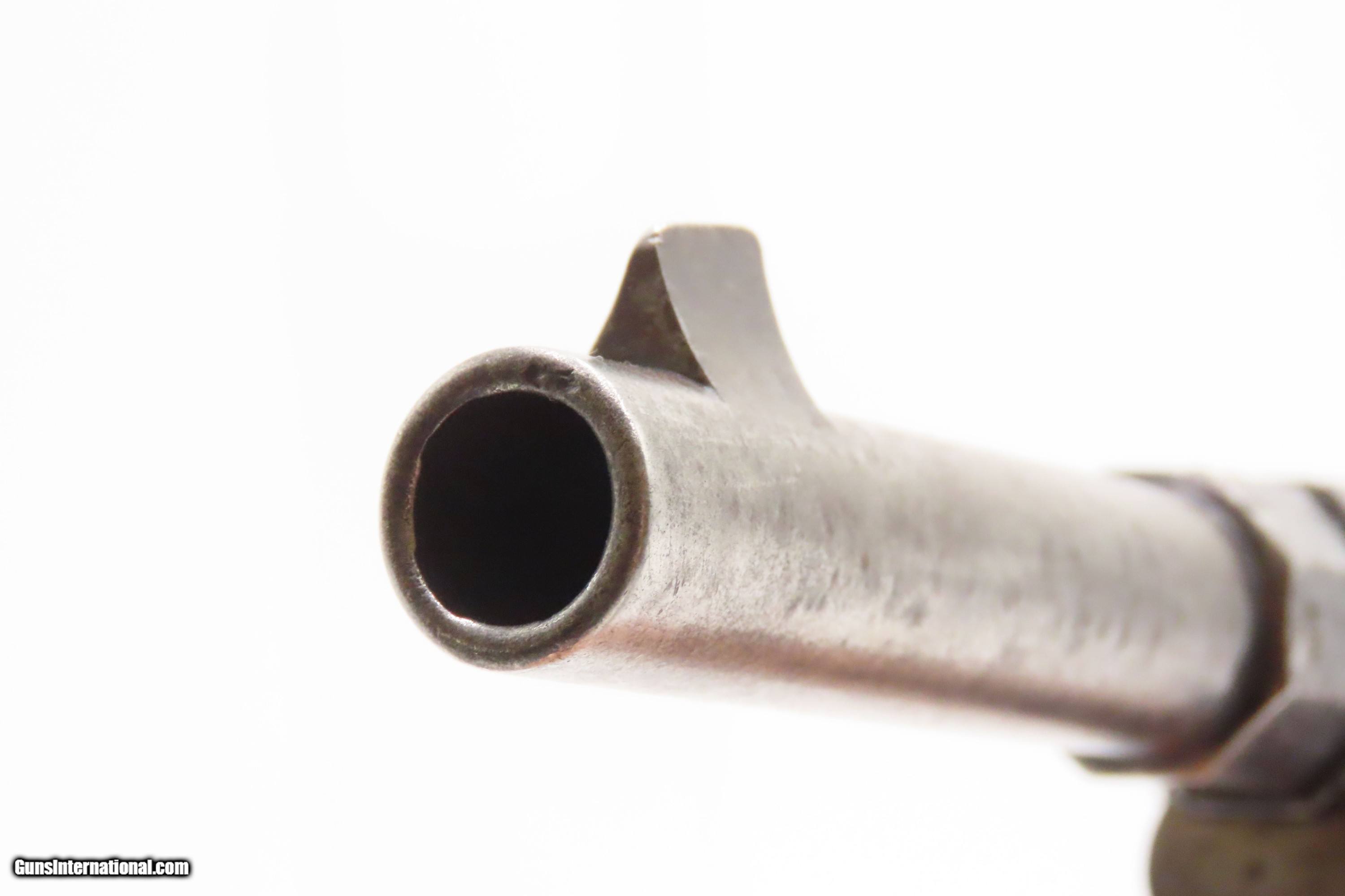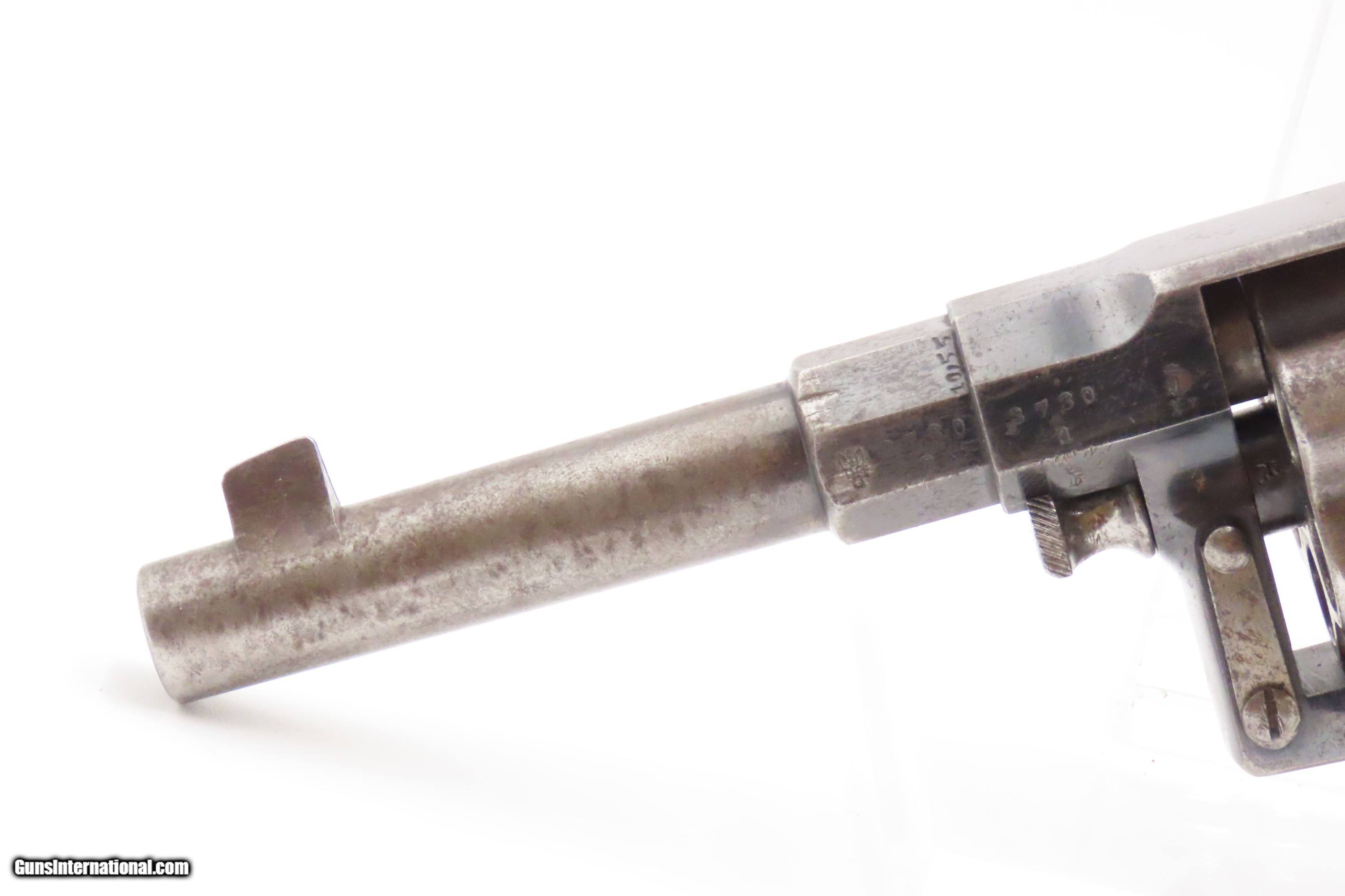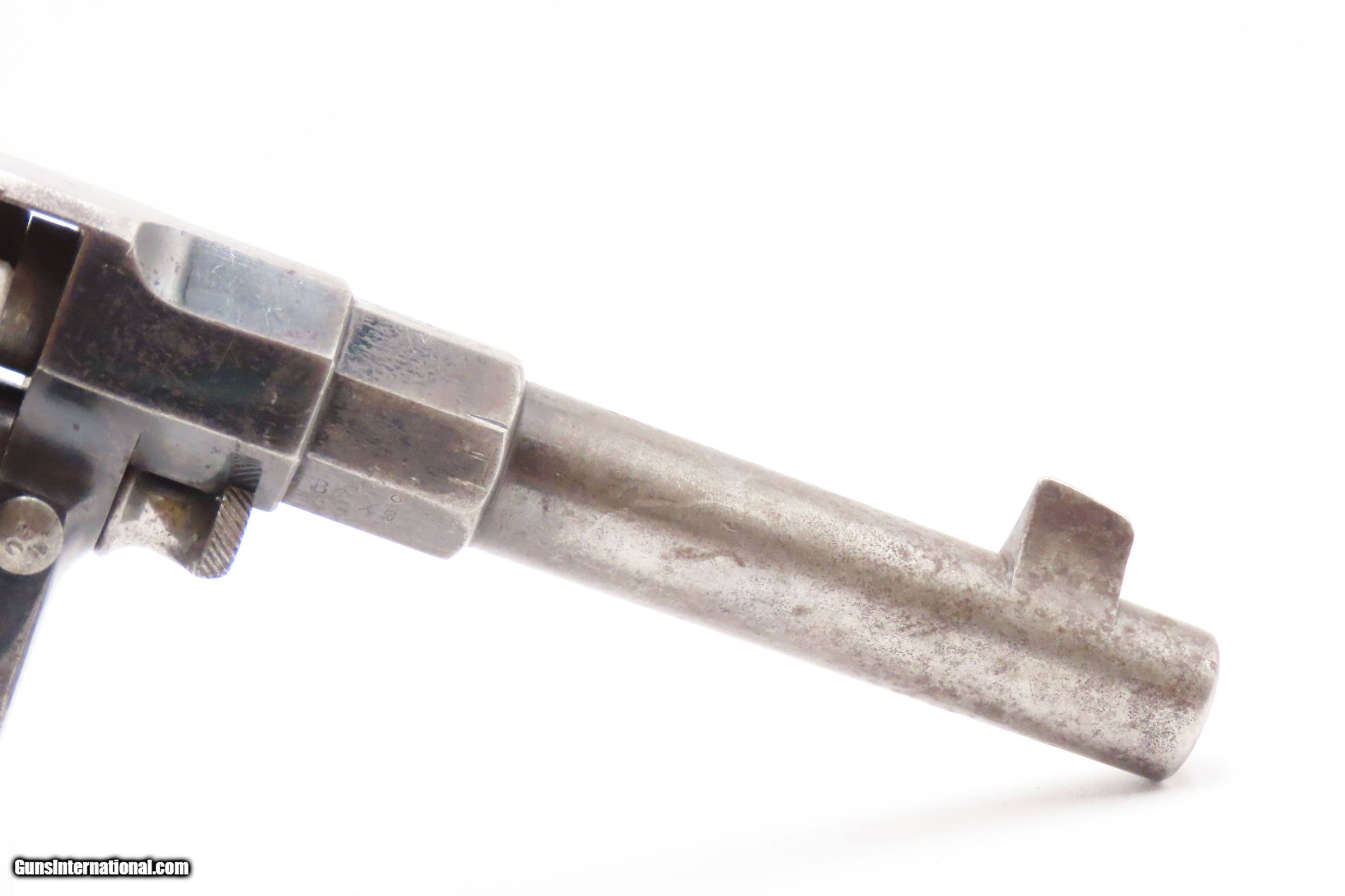 Description: c1893 UNIT MARKED Antique German ERFURT M1883 REICHS Revolver WWI & WWII Officer’s Sidearm Used in Both World Wars Here we present an antique Unit Marked German Erfurt Arsenal Model 1883 “Reichsrevolver” Single Action Revolver chambered in 10.55mm, made in 1893 at the Erfurt Arsenal in Erfurt, Germany. The Model 1879 Reichsrevolver, or Reichs Commission Revolver Model 1879 and the Model 1883 were both service revolvers used by the Imperial German Army from 1879 to 1908, when they were superseded by the classic Luger 9mm semi-automatic. They were both hefty, solid frame single action revolvers. It was the first centerfire revolver adopted by the fledgling German Empire, which was a simple design in line with similar European revolvers of the period. Besides Erfurt, various arsenals produced these guns, including Mauser and F. von Dreyse. This six-shot gun was loaded via a gate on the right side similar to a conventional single action such as Colt’s. Aside from the World Wars, it also saw action in the Boxer Rebellion and various colonial skirmishes. The overall condition is fine. Original finish. Matching numbers. Excellent action. Very good, bright, well-rifled bore. The grips are solid and show use. This example has an “1893” dated frame and a “19.R.A.9.102.” unit marking on the backstrap, which we believe is for the 19th Artillery Regiment. Own the original! This is a legitimate antique and not a reproduction. Barrel is 4-5/8 inches. Caliber: 10.55mm Overall condition as seen in photos. Very Fast. Very Safe. FREE SHIPPING WORLDWIDE. Delivered directly to your door by express mail! Guaranteed AUTHENTIC & Includes CERTIFICATE OF AUTHENTICITY. ancestryguns $2000 #247444 SOLD Antique: Yes |