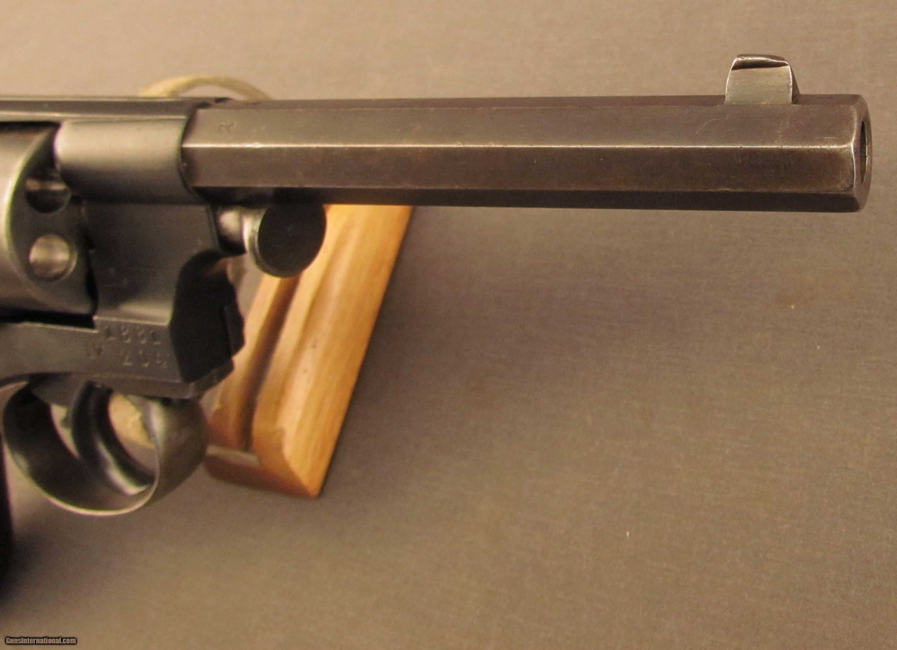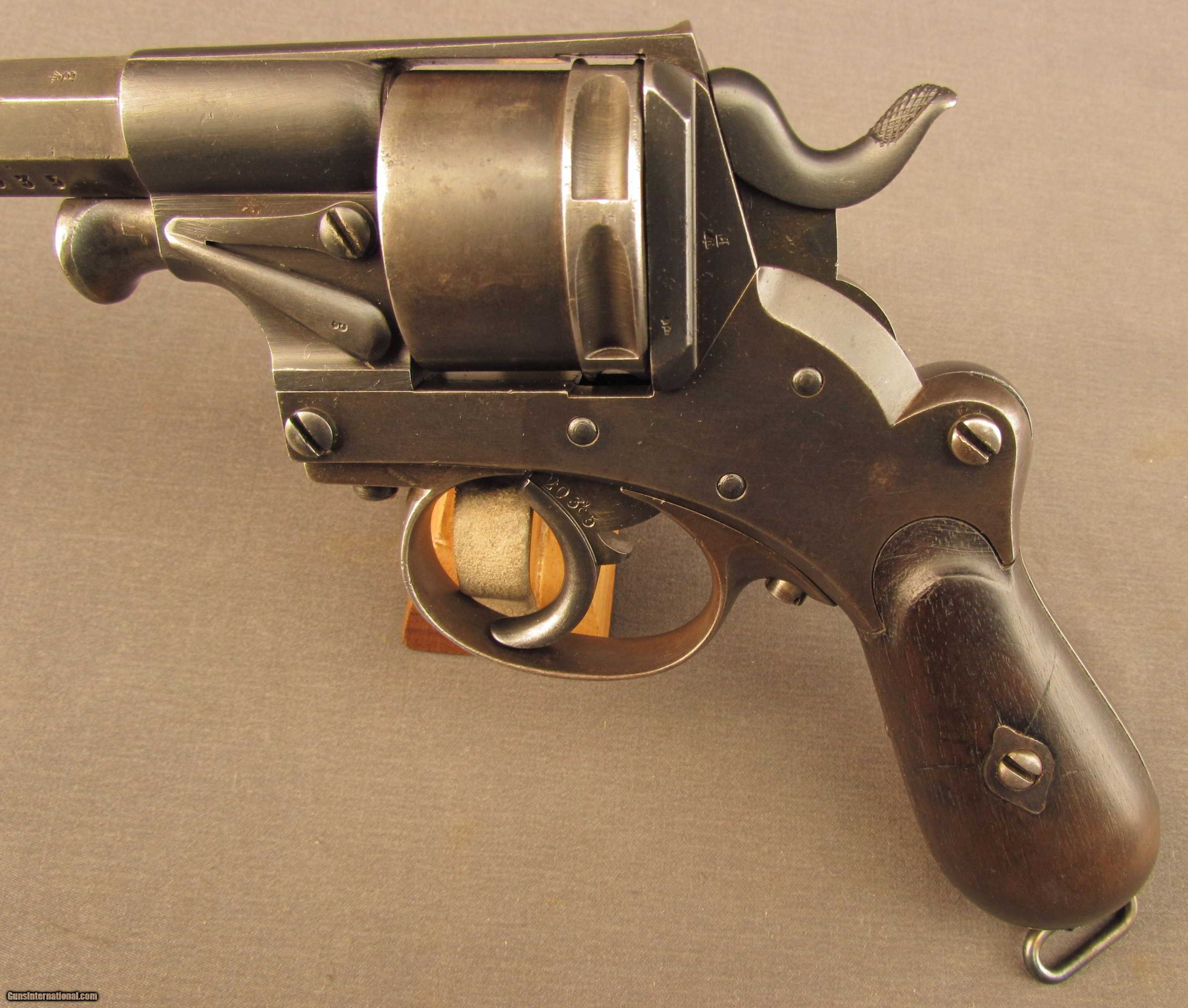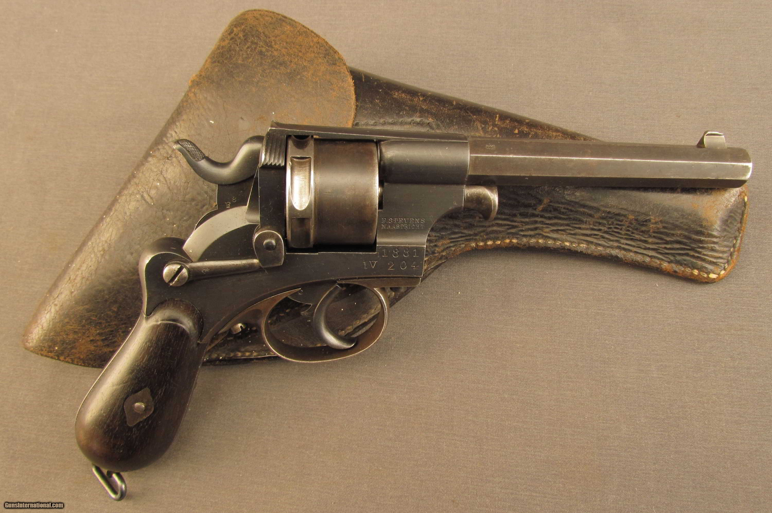Description: SN 2035 built by P. Stevens (1876 to 1878). These revolvers started life as a pin fire model 1868 and were modified to take the 9.4mm center-fire cartridge for reference see page 13-14 of the Dutch Luger by Martens and DeVries. These solid frame revolvers have a loading gate and no ejector. This piece were hand made by a number of Dutch makers. There were a few thousand built in the first years followed by an annual production of approx. 400 per year. This piece shows a bright excellent 9.4 mm bore., all matching numbers and an 1881 issue date and a unit or issue marking IV 204. Excellent original finish on the metal and wood. The grips are matching and show traces of the external proofs. This piece rides in an original Dutch holster. The interior of the flap show a 08 over B756. The reverse of the body shows a modified belt loop. The front shows the stiching marks where the combination ejection rod/screw driver was previously mounted. A scarce Dutch military revolver. Antique SOLD Antique: Yes Manufacturer: Dutch Model: 1873 Serial Number: 2035 Caliber Info: 9.4MM Gauge Info: 9.4MM |