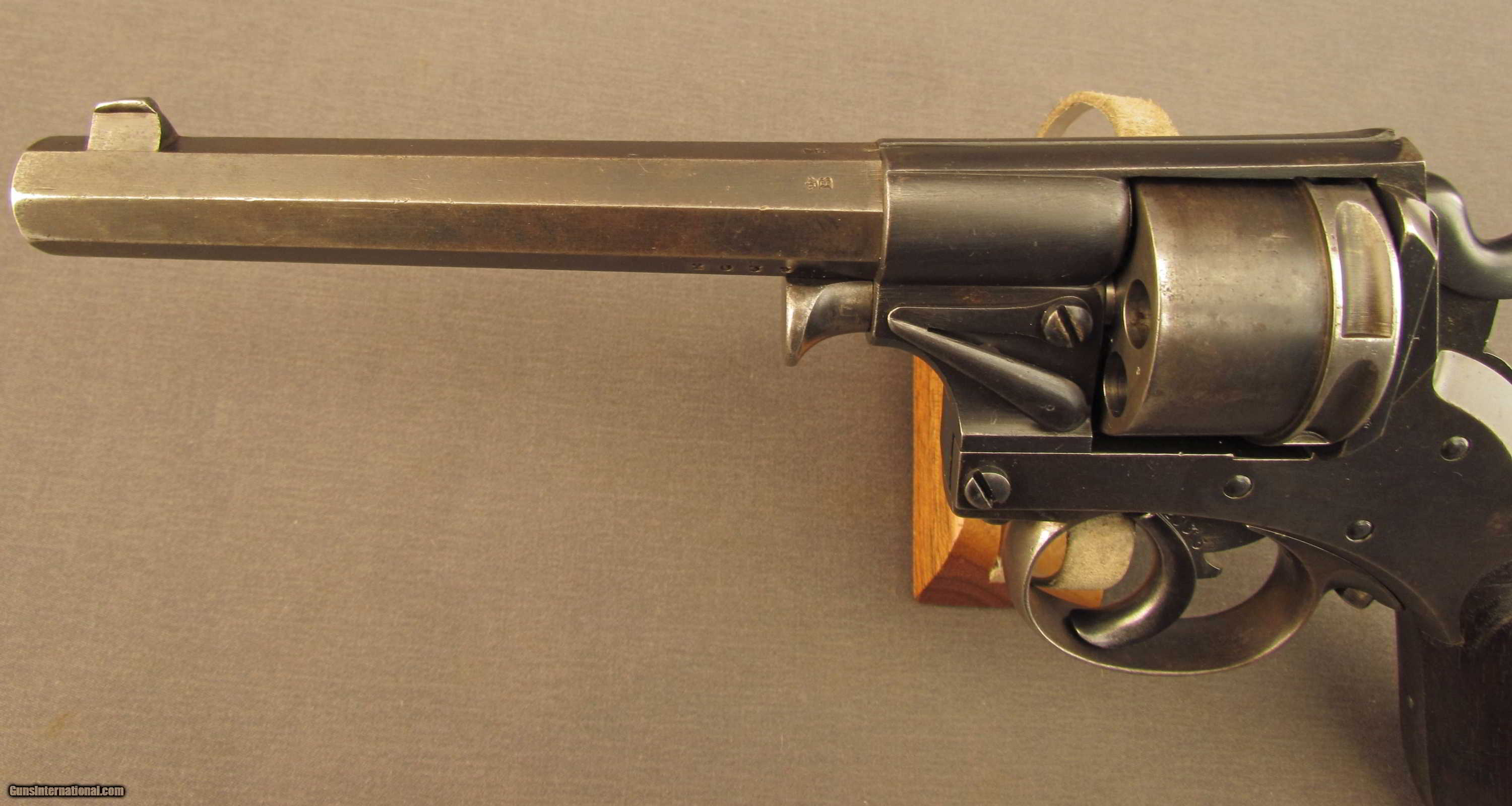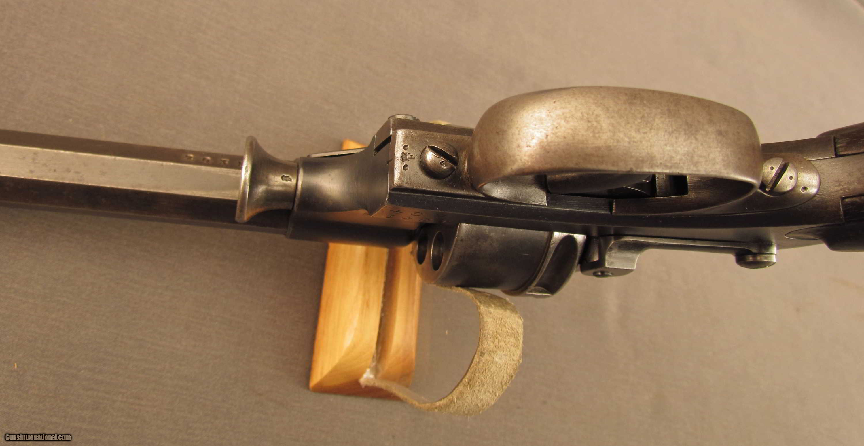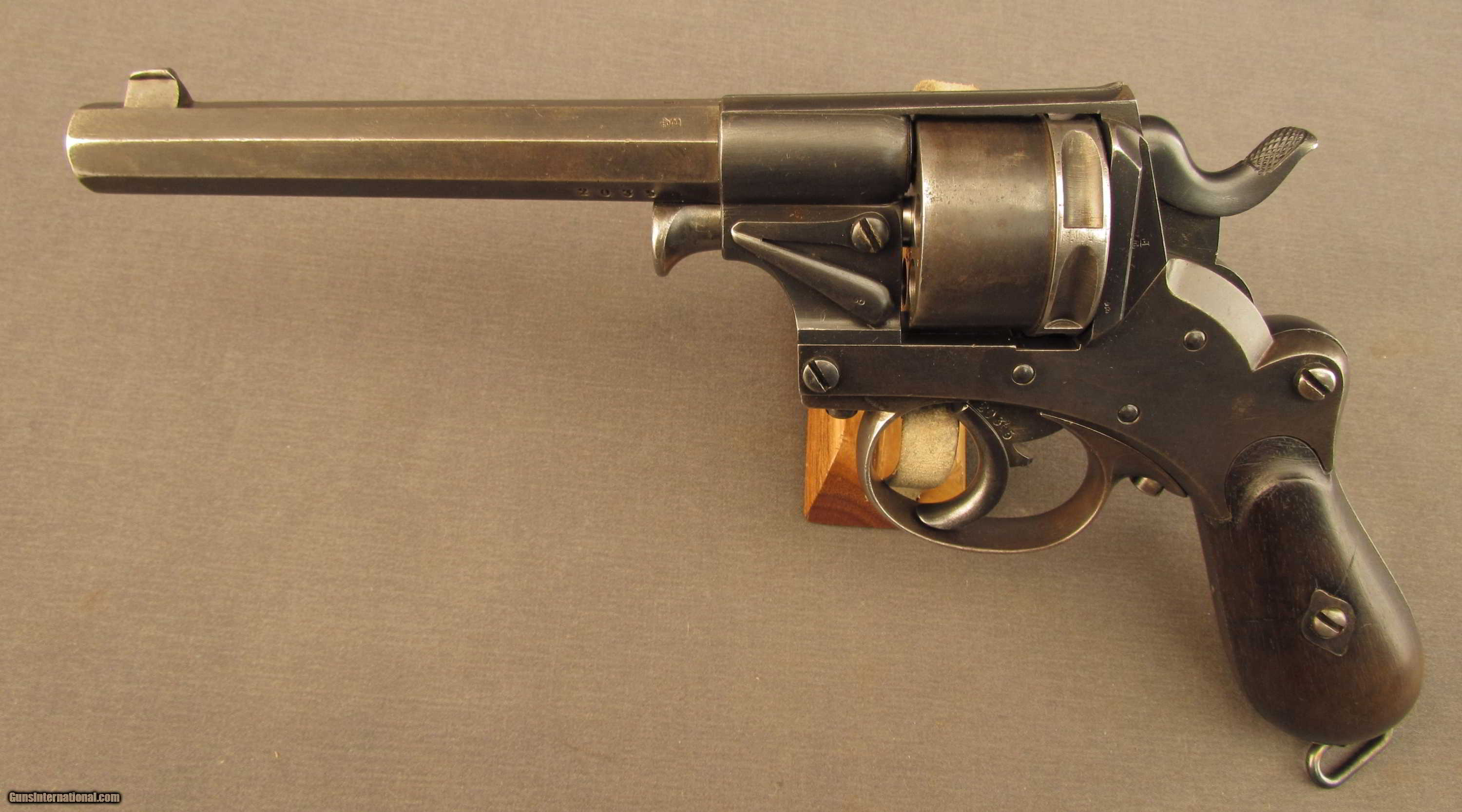 Description: SN 2035 built by P. Stevens (1876 to 1878). These revolvers started life as a pin fire model 1868 and were modified to take the 9.4mm center-fire cartridge for reference see page 13-14 of the Dutch Luger by Martens and DeVries. These solid frame revolvers have a loading gate and no ejector. This piece were hand made by a number of Dutch makers. There were a few thousand built in the first years followed by an annual production of approx. 400 per year. This piece shows a bright excellent 9.4 mm bore., all matching numbers and an 1881 issue date and a unit or issue marking IV 204. Excellent original finish on the metal and wood. The grips are matching and show traces of the external proofs. This piece rides in an original Dutch holster. The interior of the flap show a 08 over B756. The reverse of the body shows a modified belt loop. The front shows the stiching marks where the combination ejection rod/screw driver was previously mounted. A scarce Dutch military revolver. Antique SOLD Antique: Yes Manufacturer: Dutch Model: 1873 Serial Number: 2035 Caliber Info: 9.4MM Gauge Info: 9.4MM |