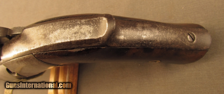 Description: NSN, .36 cal., 7? octagon barrel with a fine, bright bore that has some dark spots of mild pitting along its length. This is one of about 100 iron frame 2nd Model revolvers produced (out of a total production run of approximately 500 pieces for all models and variations). The metal has an overall mottled pewter gray patina throughout with patches of dark plum-brown freckling scattered about and some patches of deeper pitting on the cylinder walls and at the breech of the barrel where it meets the frame. This darker pitting carries over onto the grip frame as well as the rear of the cylinder. The walnut grips are in fine shape with minor handling marks and surface scratches in the original oil finish as well as a sliver missing from the rear knuckle of the left panel. The mechanism is still robust and fully functional, however the cylinder tends to over-rotate on a few of the chambers. This is an extremely rare American revolver, made just prior to the Civil War, and would make a fabulous addition to any collection. Antique SOLD Antique: Yes Manufacturer: Savage Model: Navy Caliber Info: .36 Cal Gauge Info: .36 Cal |