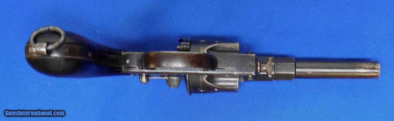 Description: On Hold Pending Funds / German Model 1883 Reichsrevolver, made by Suhl Consortium with Unit Marking and dated .92 on the lower left frame, serial # 7155 s, cal. 11mm German Ordnance, 4 1/2" barrel with a good plus bore that shows scattered pitting but strong rifling. The metal surfaces of this revolver retain 83% original blue with scattered light peppery pitting but nothing drastic or alarming, fading to brown with some oxidation staining. The smooth walnut grips rate very good with an added coat of varnish, a few dings and handling marks. All visible serial numbers are matching including the grips and there is a unit marking on the backstrap that reads "28.A.3.43.". The hammer operates a bit stiffly but overall this is a fine example of a late model Reichsrevolver with its overall condition as described and photographed is good plus - very good. Inv.: # 12-142 SOLD Antique: Yes |