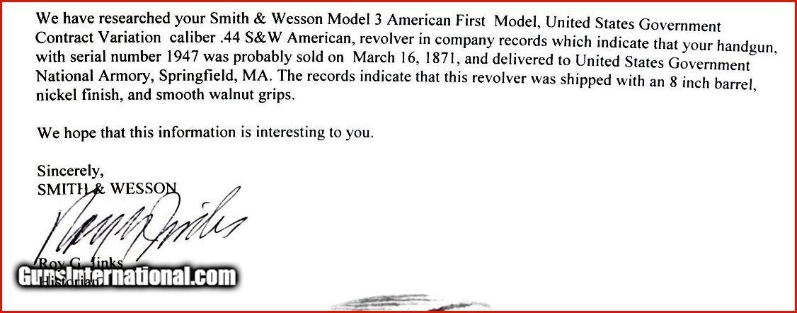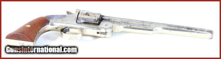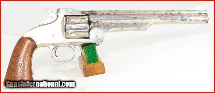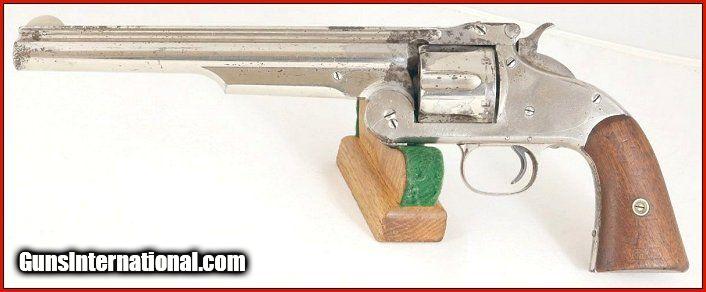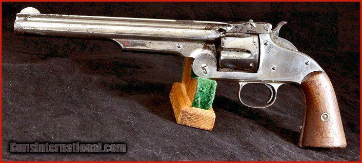 Description: A rare Surviving example of a Documented, Colorful, Calvary Issued, Scarce, U.S. Contract Smith & Wesson Model 3, American First Model Revolver.. One of "200 Nickle" scarce and highly desirable in any condition... this example would rate in the top 70%. It is listed by its serial number "1947" in the STANDARD CATALOG OF SMITH & WESSON by Jim Supica & Richard Nahas as a Model 3 that was purchased by the U.S. government. It is also lettered and Documented by Smith & Wesson Historian Roy Jinx. A small "A" ordnance sub-inspection mark is present on the left side of the frame, on top and under the cylinder, and in a cylinder flute. The American Revolver was the first cartridge revolver adopted by the U.S. military and saw usage throughout the Indian Wars. All Original Nickle Finish that has not been cleaned or refinished. An extremely rare Martial revolver. SOLD Antique: Yes |