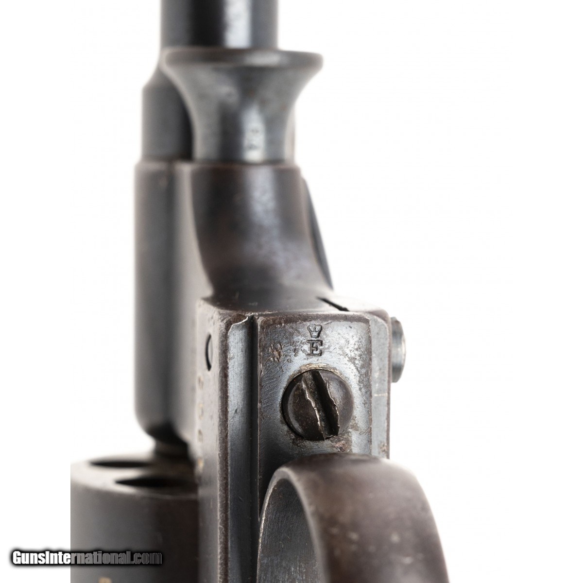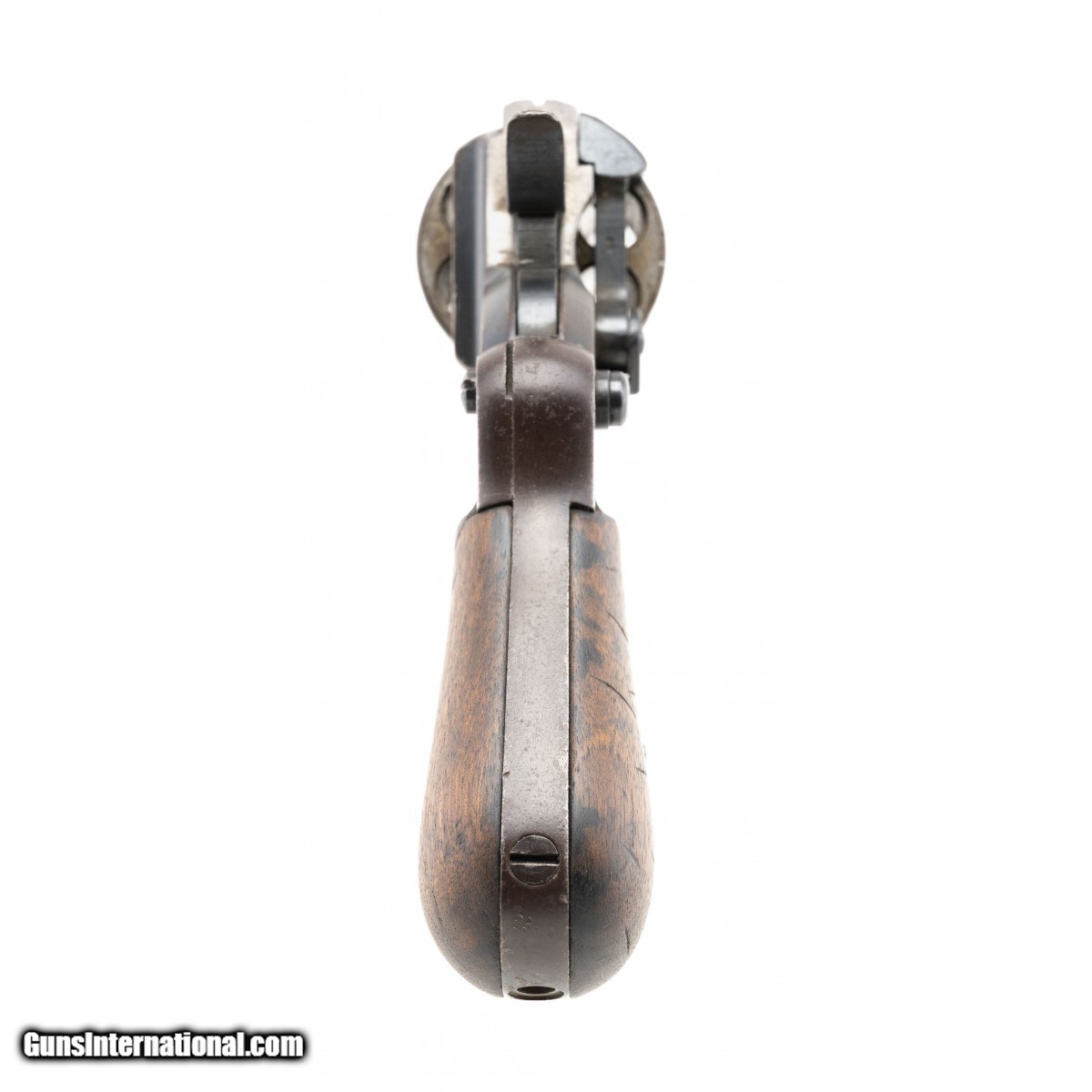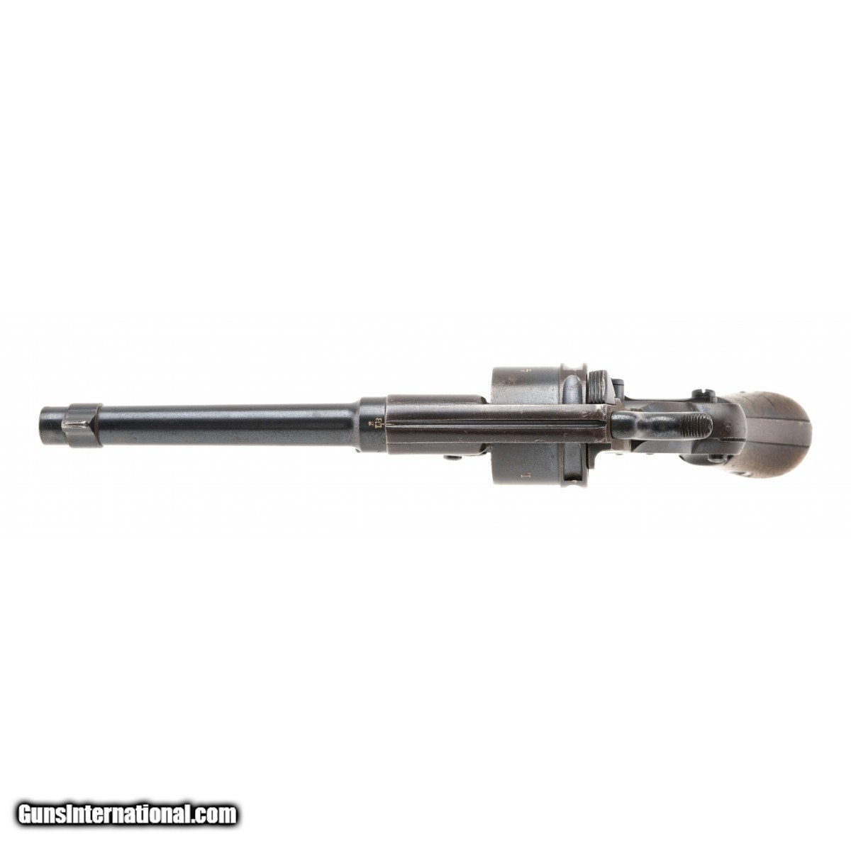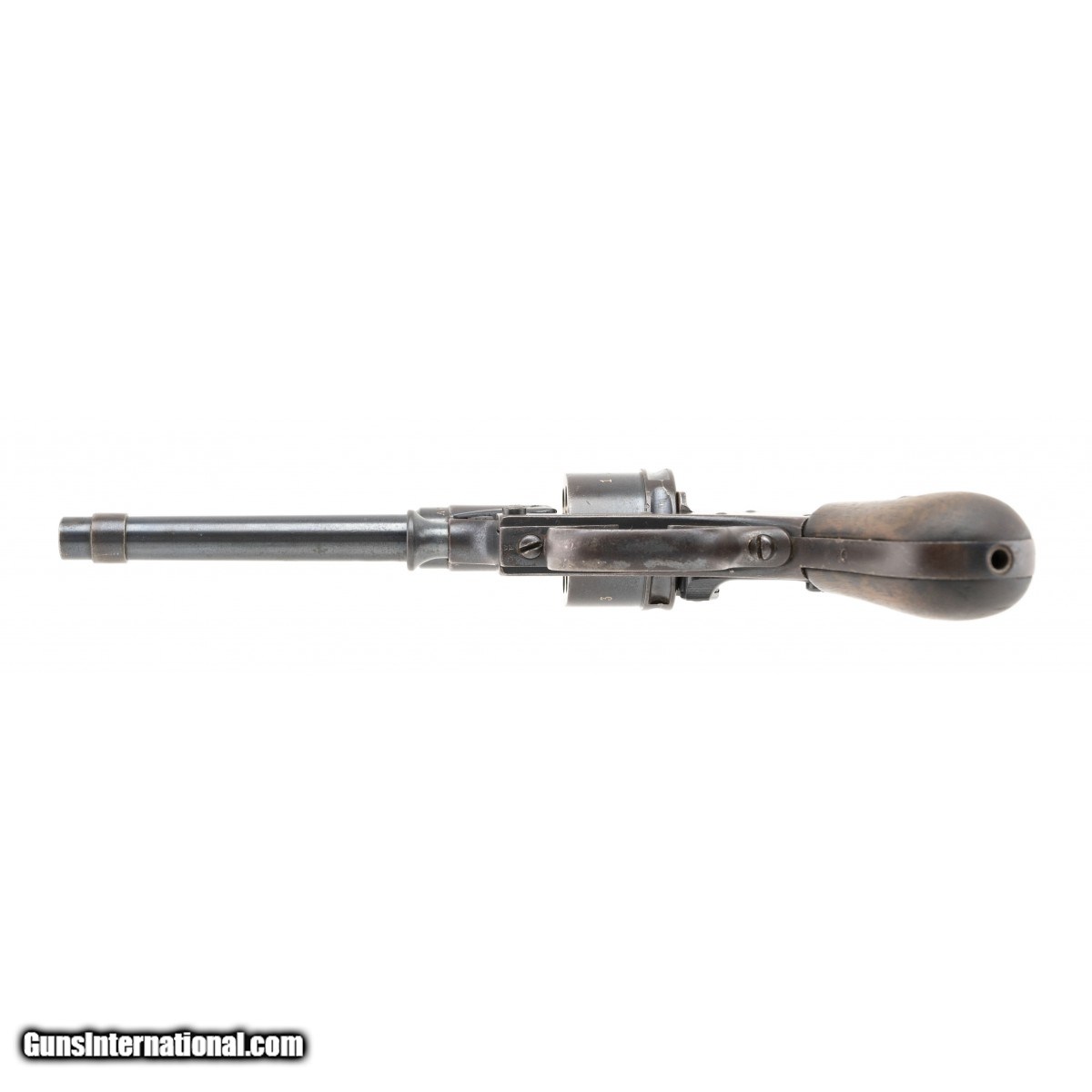 Description: " The 9.4mm Dutch Model 1873 revolver was used from 1873 to 1945. This revolver is a New Model 1873 withits 6.3"" round barrel instead of the original octagon barrel. The first New Models were issued in 1909 and this one is so dated. The bore is excellent with bright, strong rifling. The overall gun rertains approx. 90% blue with the remainder turning a smooth blue brown. The right side of the frame in front of the cylinder is marked HEMBERG and below that is on the lower frame is the1909 date. The cylinder chambers are numbered 1 through 4 with the last two being marked L (LOAD NOW!??). The smoogh wood grips are very good with no cracks or chips. The laynsrd ring is absent. The action functions correctly. This nice big Dutch revolver is ready for your European military pistol collection. SOLD Curio/Relic: Yes |