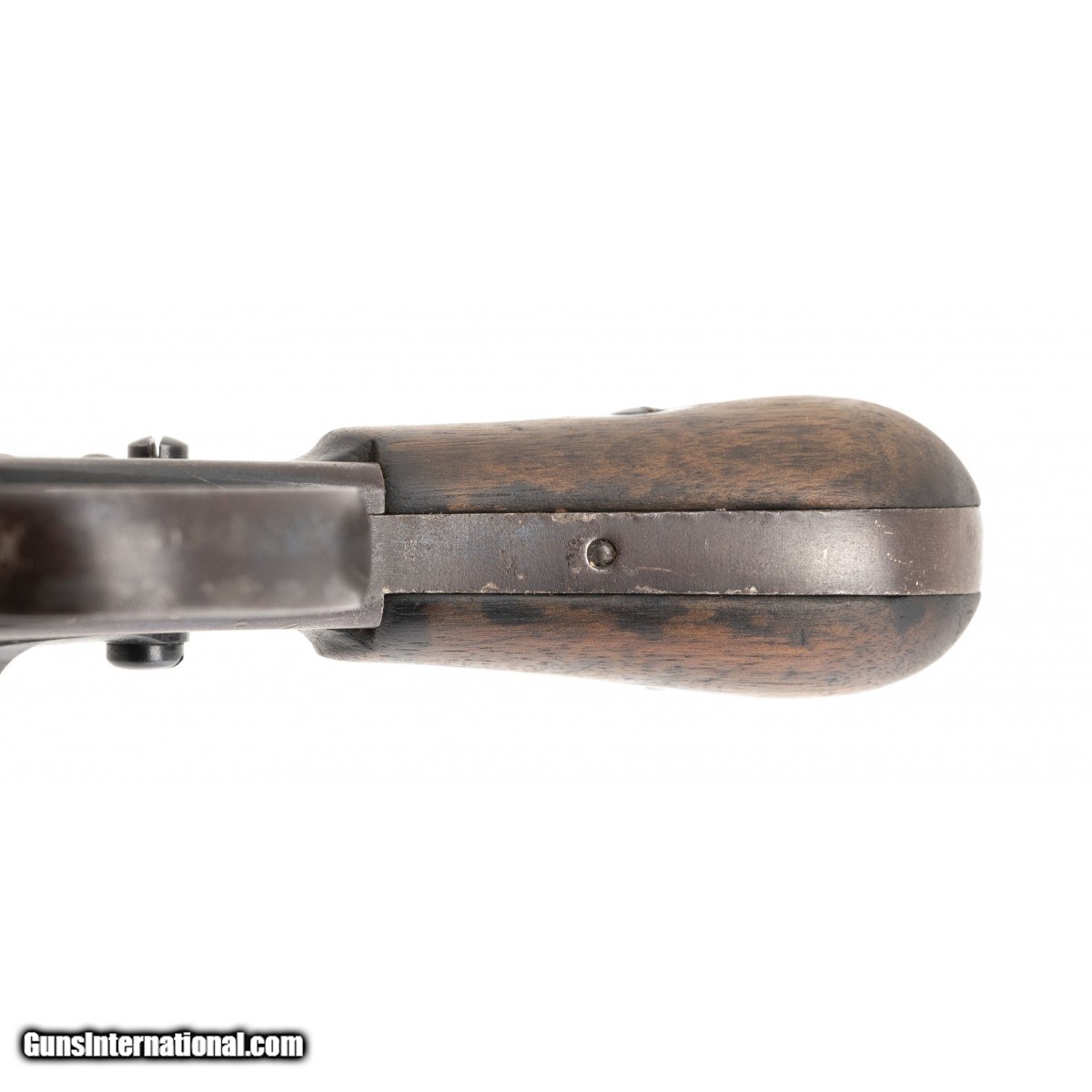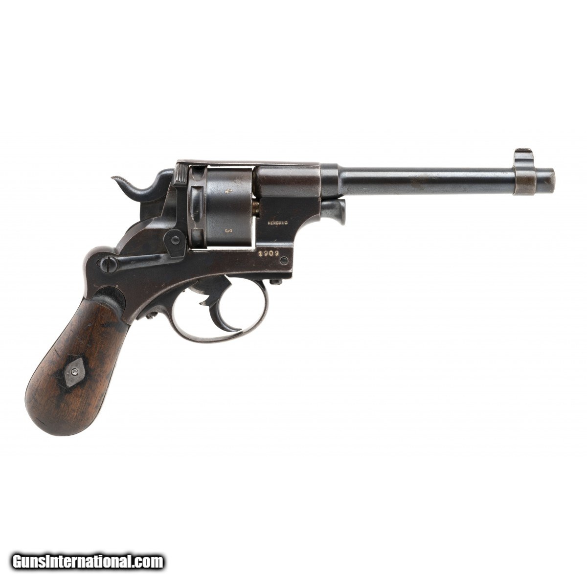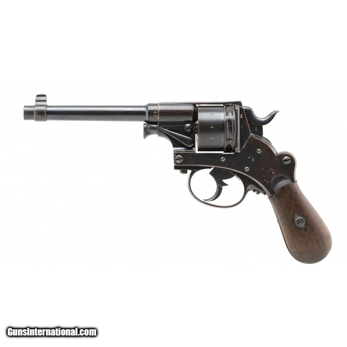Description: " The 9.4mm Dutch Model 1873 revolver was used from 1873 to 1945. This revolver is a New Model 1873 withits 6.3"" round barrel instead of the original octagon barrel. The first New Models were issued in 1909 and this one is so dated. The bore is excellent with bright, strong rifling. The overall gun rertains approx. 90% blue with the remainder turning a smooth blue brown. The right side of the frame in front of the cylinder is marked HEMBERG and below that is on the lower frame is the1909 date. The cylinder chambers are numbered 1 through 4 with the last two being marked L (LOAD NOW!??). The smoogh wood grips are very good with no cracks or chips. The laynsrd ring is absent. The action functions correctly. This nice big Dutch revolver is ready for your European military pistol collection. SOLD Curio/Relic: Yes |