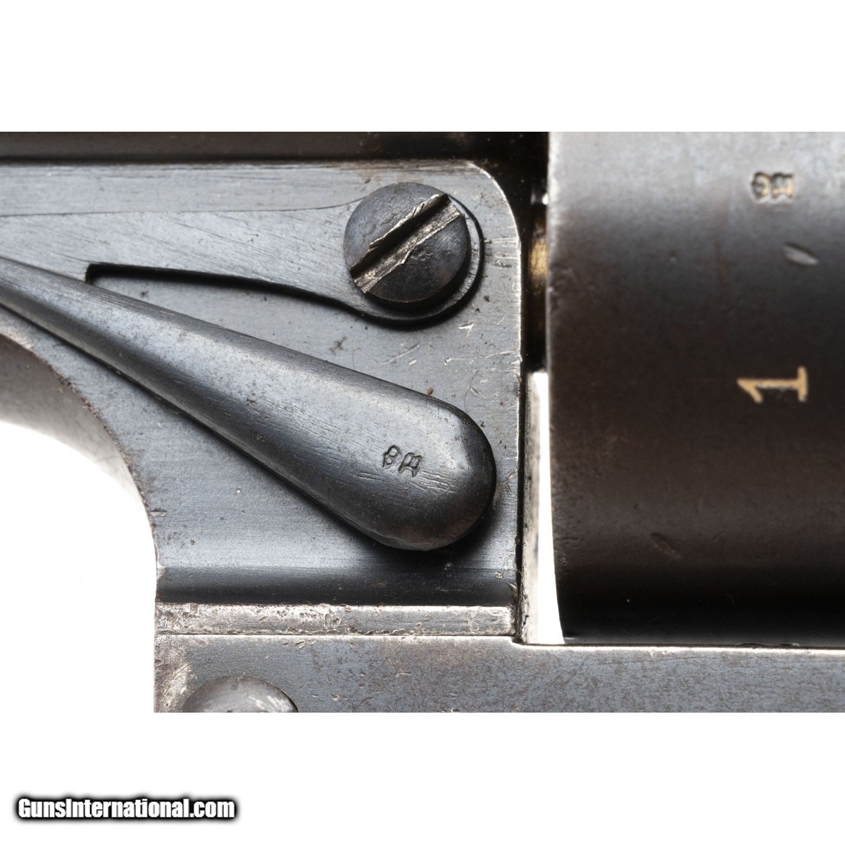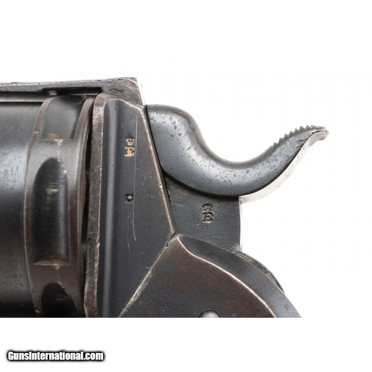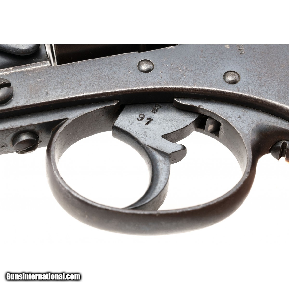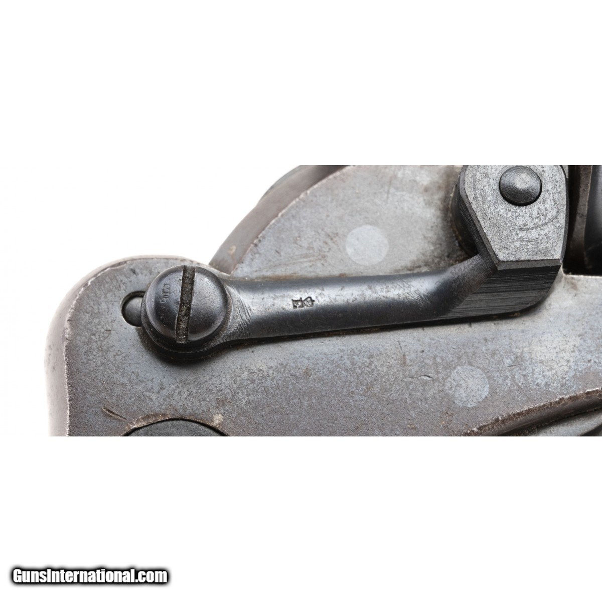 Description: " The 9.4mm Dutch Model 1873 revolver was used from 1873 to 1945. This revolver is a New Model 1873 withits 6.3"" round barrel instead of the original octagon barrel. The first New Models were issued in 1909 and this one is so dated. The bore is excellent with bright, strong rifling. The overall gun rertains approx. 90% blue with the remainder turning a smooth blue brown. The right side of the frame in front of the cylinder is marked HEMBERG and below that is on the lower frame is the1909 date. The cylinder chambers are numbered 1 through 4 with the last two being marked L (LOAD NOW!??). The smoogh wood grips are very good with no cracks or chips. The laynsrd ring is absent. The action functions correctly. This nice big Dutch revolver is ready for your European military pistol collection. SOLD Curio/Relic: Yes |