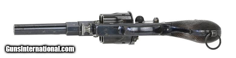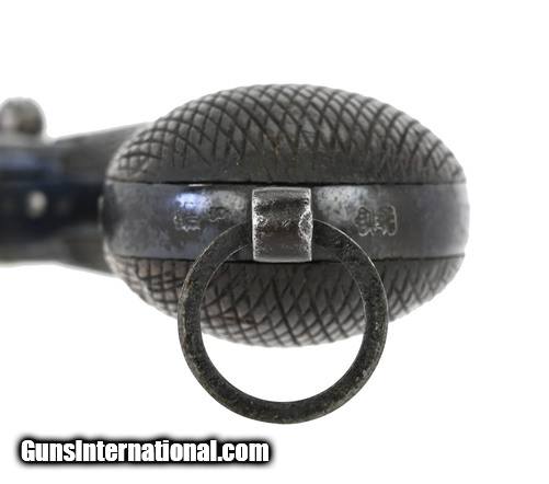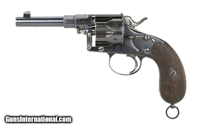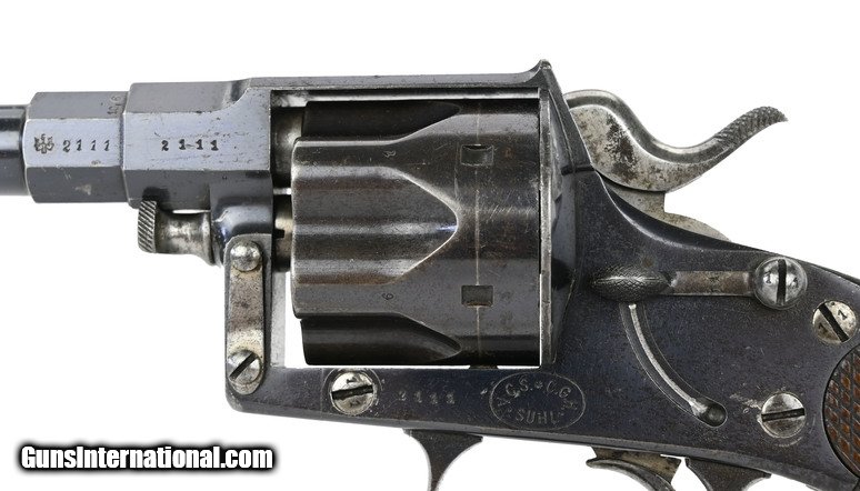 Description: " German Model 1883 Reichs 10.55 caliber revolver. This is a beautiful high polish blue revolver with checkered wood grips. The refinish is original to the revolver, not a later reblue! Manufactured by V.C.S. (V. Charles Shilling & Co.) No unit markings on the grip straps. Frame has Imperial Acceptance markings. Bore is bright and perfect. Action works perfectly. Probably made for an officer or official, as the blue deluxe and checkered grips put this revolver above others. SOLD Curio/Relic: Yes |