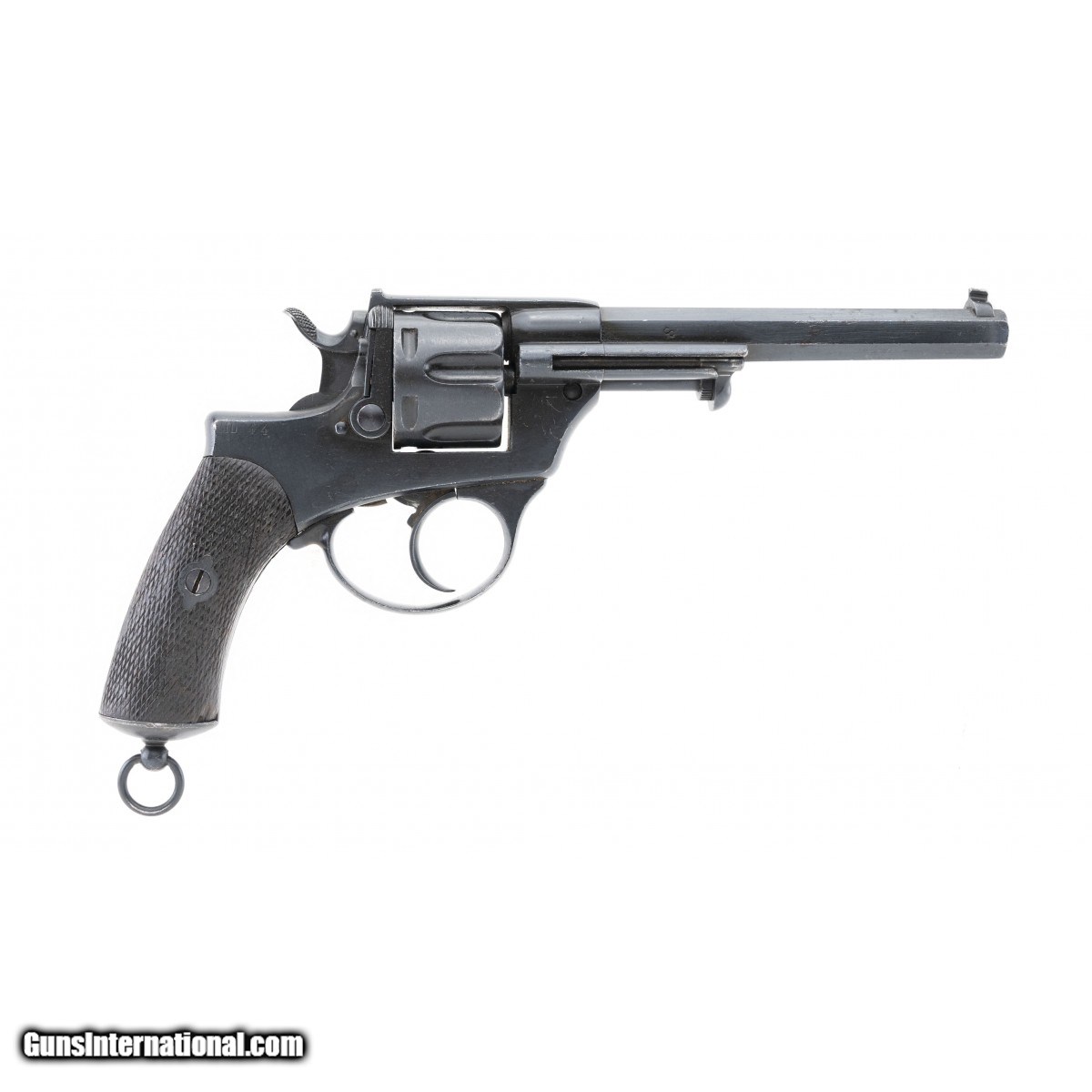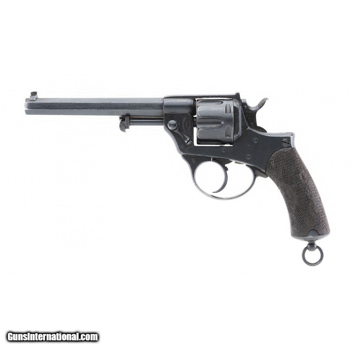 Description: " The Modello 1874 was the first handgun adopted by the Kingdom of Italy's armed forces. The overall length is approx. 11.5"". The 6.3"" octagon 10.35mm caliber barrel has an excellent bore with bright, strong rifling. It has a blade front sight with the block rear sight at the rear of the top strap. The left receiver is marked in an arc R'FABB.D'ARMI over BRESCIA (fabricated by the Brescia arsenal) in an opposing arc below with 1887 in the center. The right barrel flat is stamped with an S. The top rear of the right frame is stamped MU 44. This revolver retains approx. 95% of its original dull military blue finish. The checkered grips are very good with scattered light bruising. The lanyard ring and swivel are present. The action functions correctly. This fine Modello 1874 is fit for the finest Italian or European revolver collection. SOLD Antique: Yes |