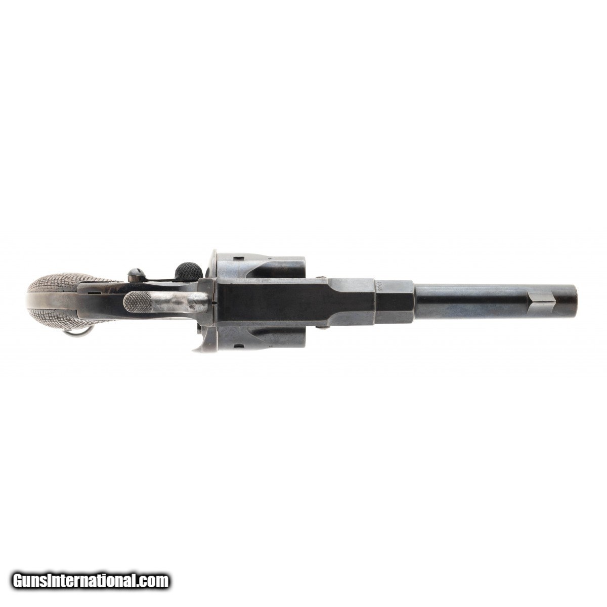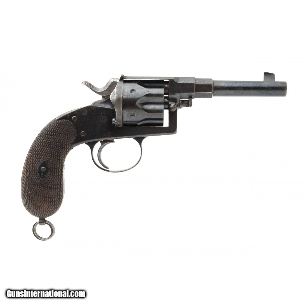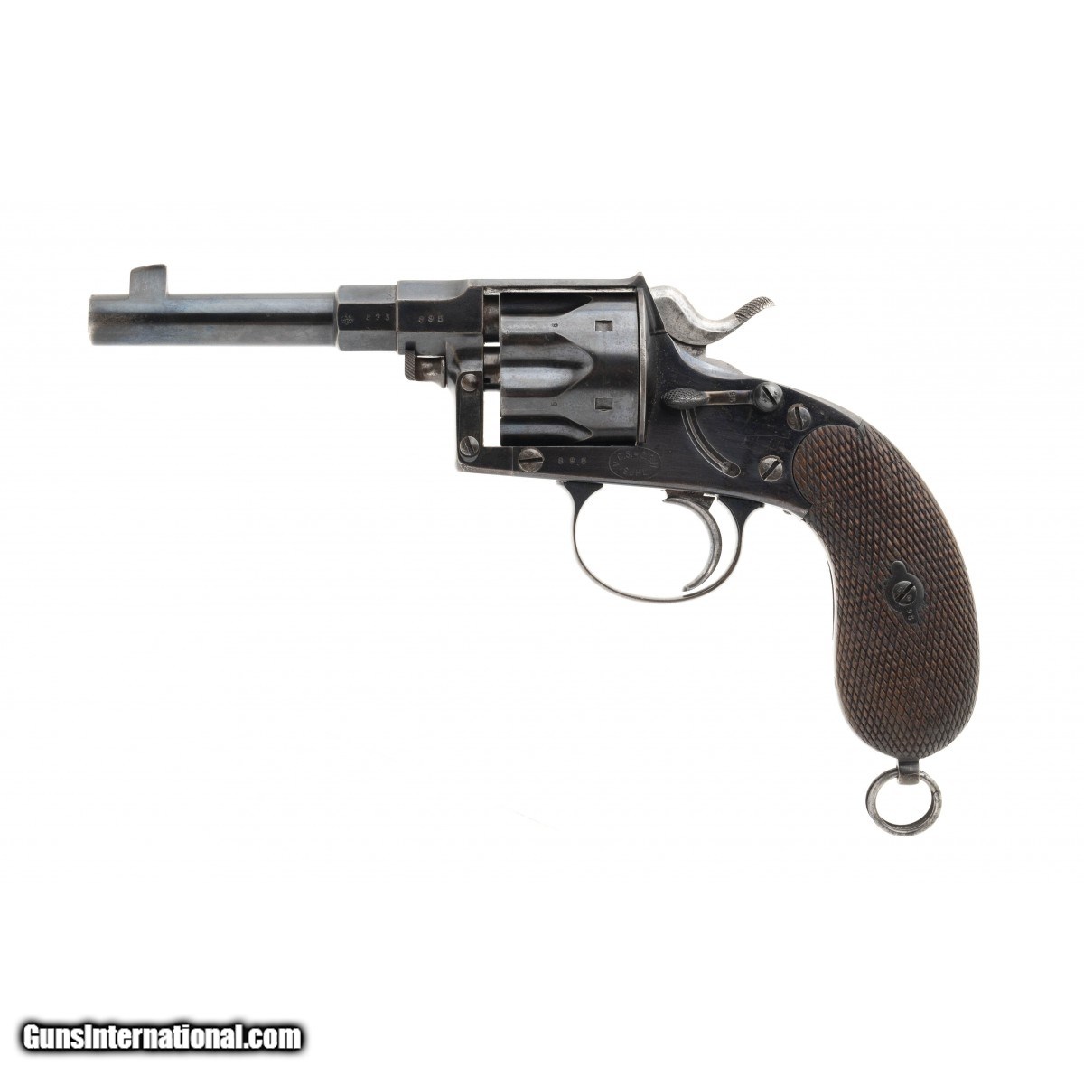 This Officer's Model 1883 Reichsrevolver was in use until 1919. The overall length is approx. 9.75"". The 4 5/8"" octagon to round 10.6mm caliber barrel has a good bore with firing wear and light pitting. The gun retains approx. 92% blue and 40% straw finish. The left side of the frame has a safety lever below the hammer. The serial number, 895, or the last two digits, is found on msot parts inclucing the screws. The left isde of the frame has an oval marking of V.C.S. * C.G.H. SUHL. This stands for the V.C. Shilling and C.G. Hanel consortium in Suhl. The bottom of the barrel knox form is marked S,S, and I. The Army acceptance eagle stamp is on the left side of the barrel and rear of the cylinder. The bottom of the frame is marked with a crown over a Gothic W and the bottom bo the grip frame is marked with a crown over II and crown over FW (Friderick Wilhelm). The checkered wood grips are excellent with no cracks or chips. The action functions correctly. This fine example of a Prussian used officers model 1883 Reichsrevolver is ready for your German or European military pistol collection.