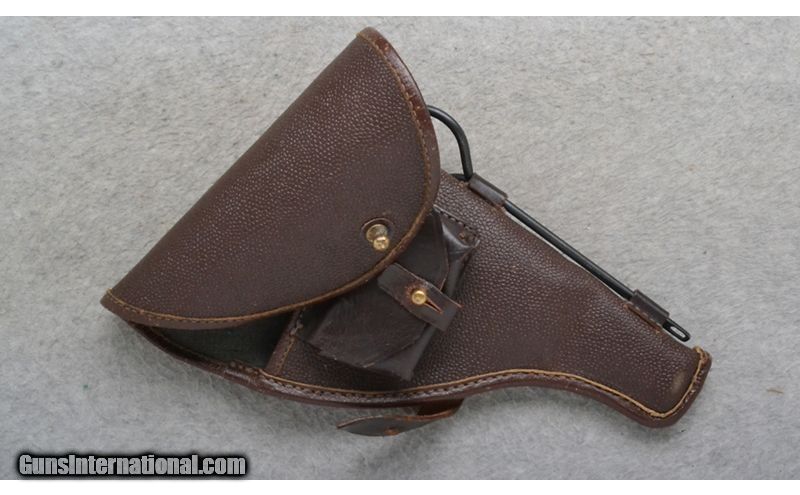 Description: This 1895 Nagant Double Action Model 7 shot Revolver is in 7.62x38R Cal. It has a 4.5 inch barrel. A blade front sight and an integral notch rear sight. The grip is a diamond checkered hardwood. The Tula Arsenal Mark on the left side of the frame has the Star with a Hammer inside it and 1944 under it. Comes with a holster. 7.62x38R SOLD Chambers: 7 round. Metal Condition: Good. Wood Condition: Good. Minor wear. Bore Condition: Good. Barrels: 4.5 inch. Triggers: SA/DA Weight: 30 Oz. Sights: Blade front. Integral notch rear. Item Location: Springfield, MO |