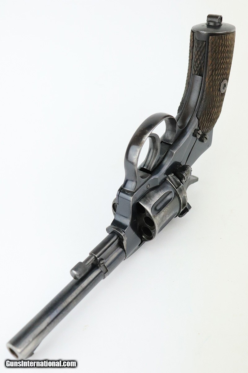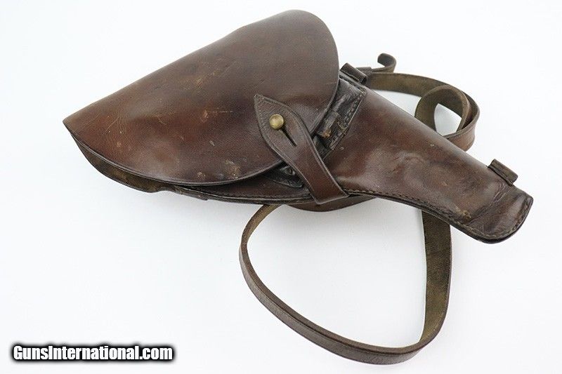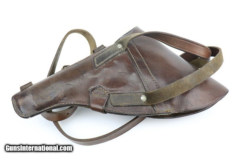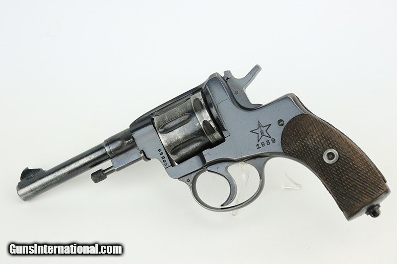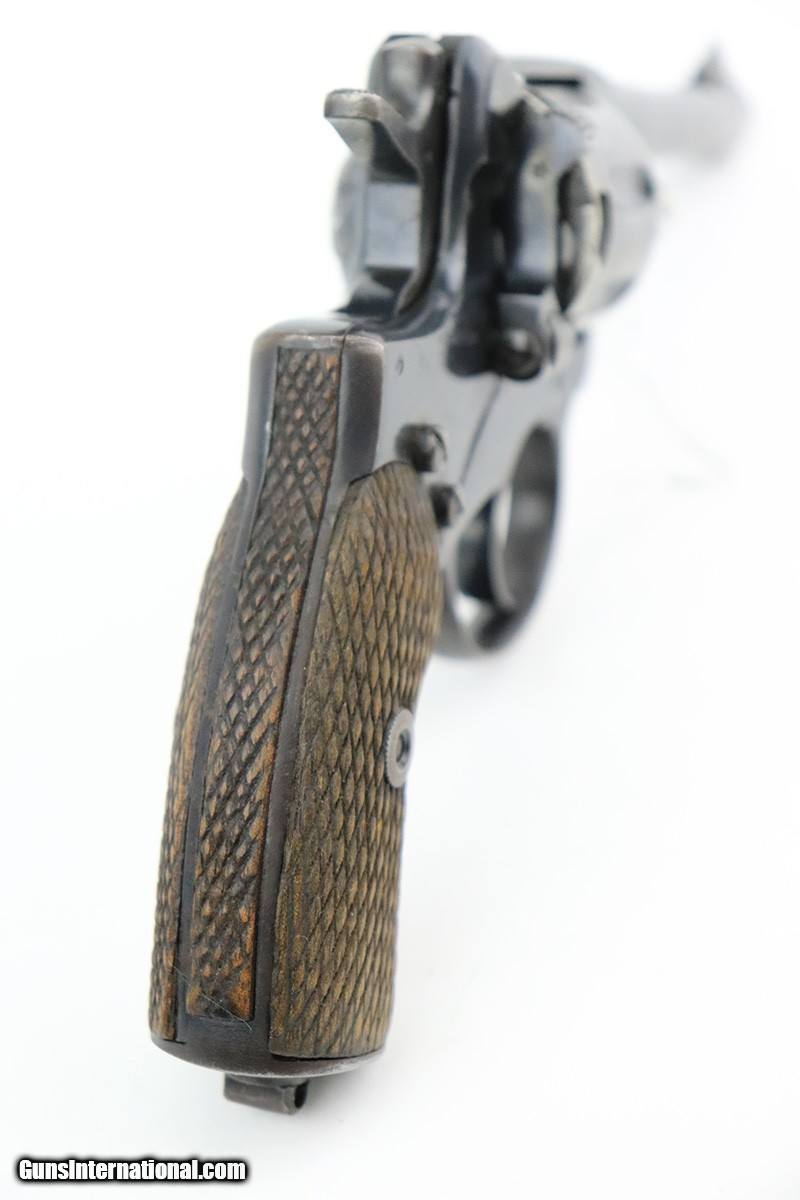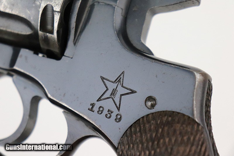 Description: This is a nice example of a Nagant Model 1895 revolver issued to the Russian military in 1939. It is all matching and has no import marks. The lanyard ring and firing pin are missing. It comes as a rig with a nice leather shoulder holster. The gun itself has retained roughly 75% of its original bluing. The majority of the finish loss is along the barrel and one the cylinder. Comes with nice period-correct wood grips. The rifling in the bore is worn with noticeable pitting and light surface rust throughout. We rate the bore as 2/10 overall. C&R eligible. SOLD Curio/Relic: Yes Handgun Caliber: 7.62x38mmR (7.62x38mm Nagant) Manufacturer: Mosin-Nagant Model: M1895 Serial Number: C556 Bore Condition: 2/10 |