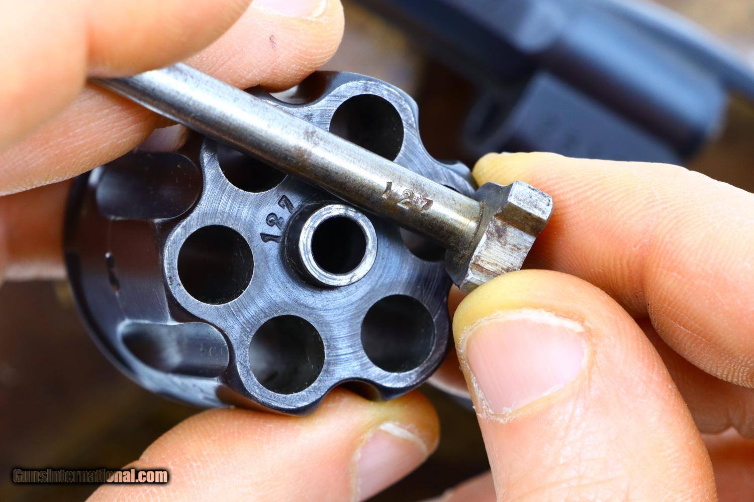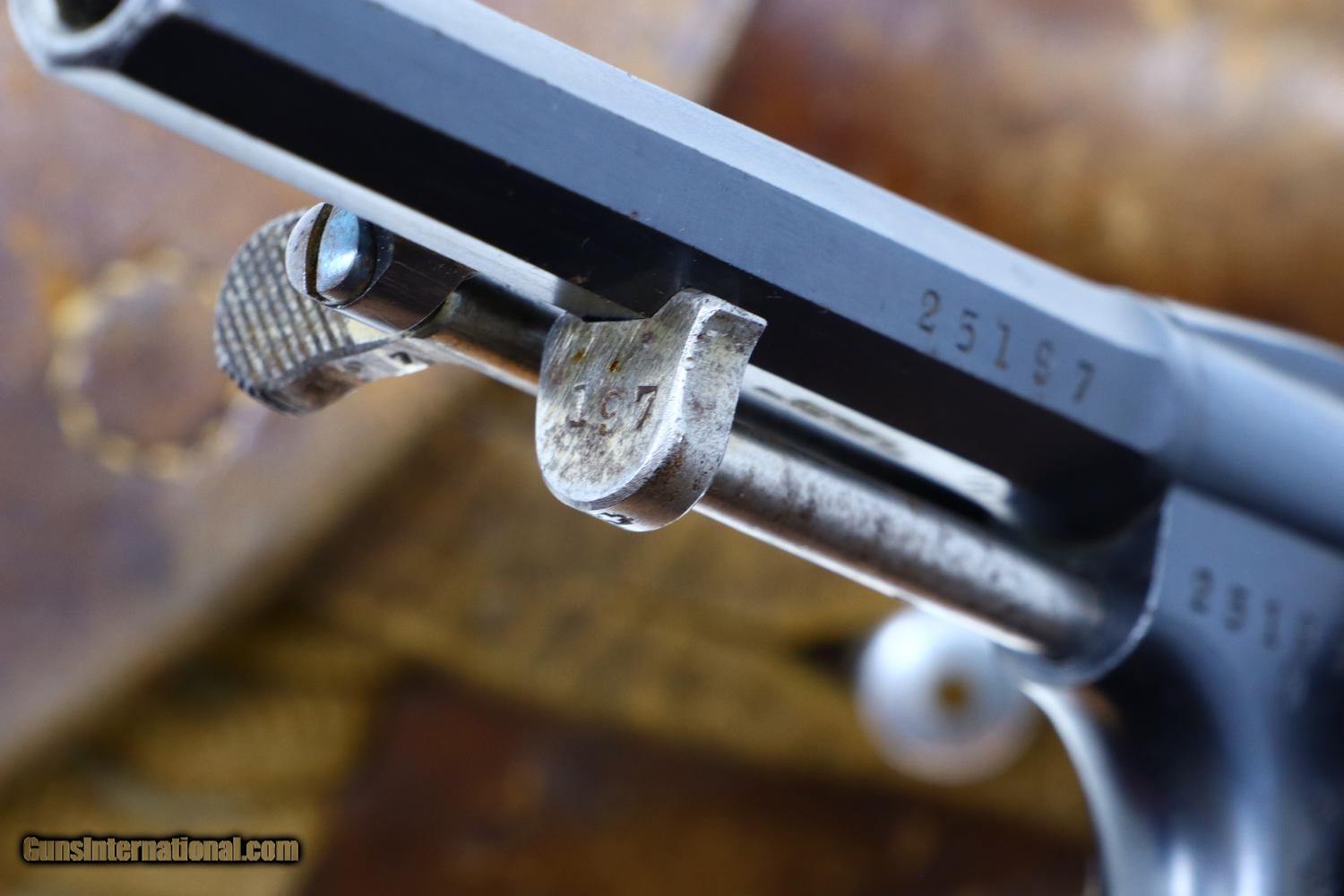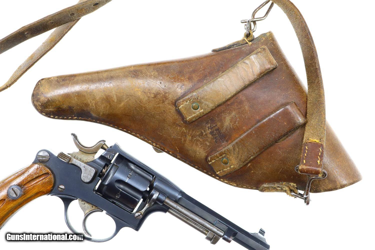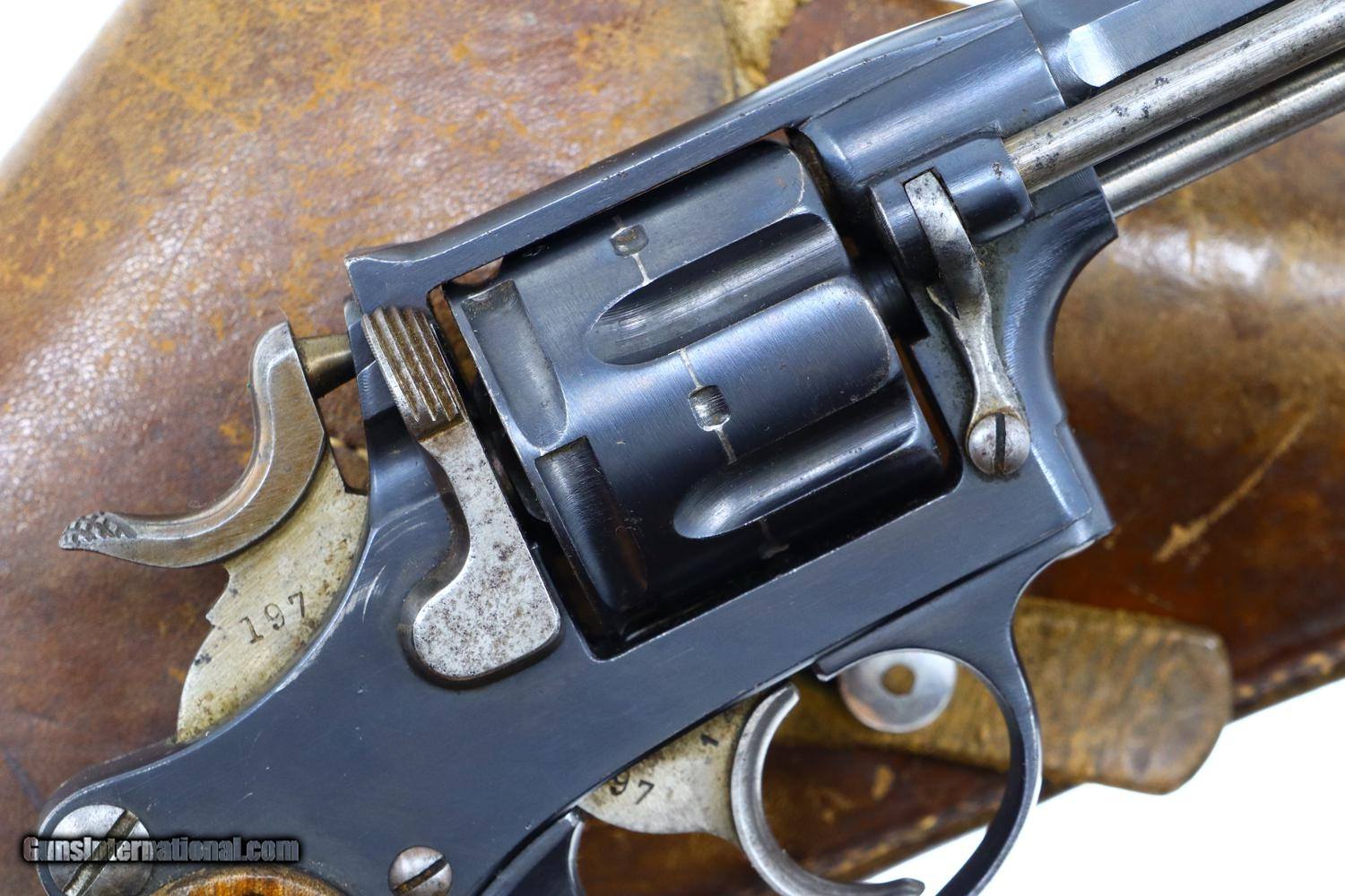 Description: Standard configuration M1882 SA/DA revolver with 4.5” barrel having fixed front and rear sights. Matching parts include barrel, frame, cylinder, hammer, trigger, loading gate and ejector. Most of these also marked with assembly number “127”. Major parts are rust blued with strawed small parts. Wood fluted grips. Butt with rotateable lanyard ring. Leather holster with strap dated “18” Synopsis: Swiss M1882 Military Revolver, original condition, all matching, rig, 7.5mm Condition: Near excellent original condition; the strawed parts with fading and oxidative staining as photographed. Comparable condition grips and butt cap. Bright bore with sharp rifling. Perfect manual mechanics. A very nice condition, mid-production, no excuse, original finish M1882 Swiss military revolver with holster and strap. ~~Insured shipping fee of $55; most packages shipped using FedEx 2nd Day.~~ SOLD Manufacturer: Bern Serial Number: 25197 Caliber Info: 7.5mm |