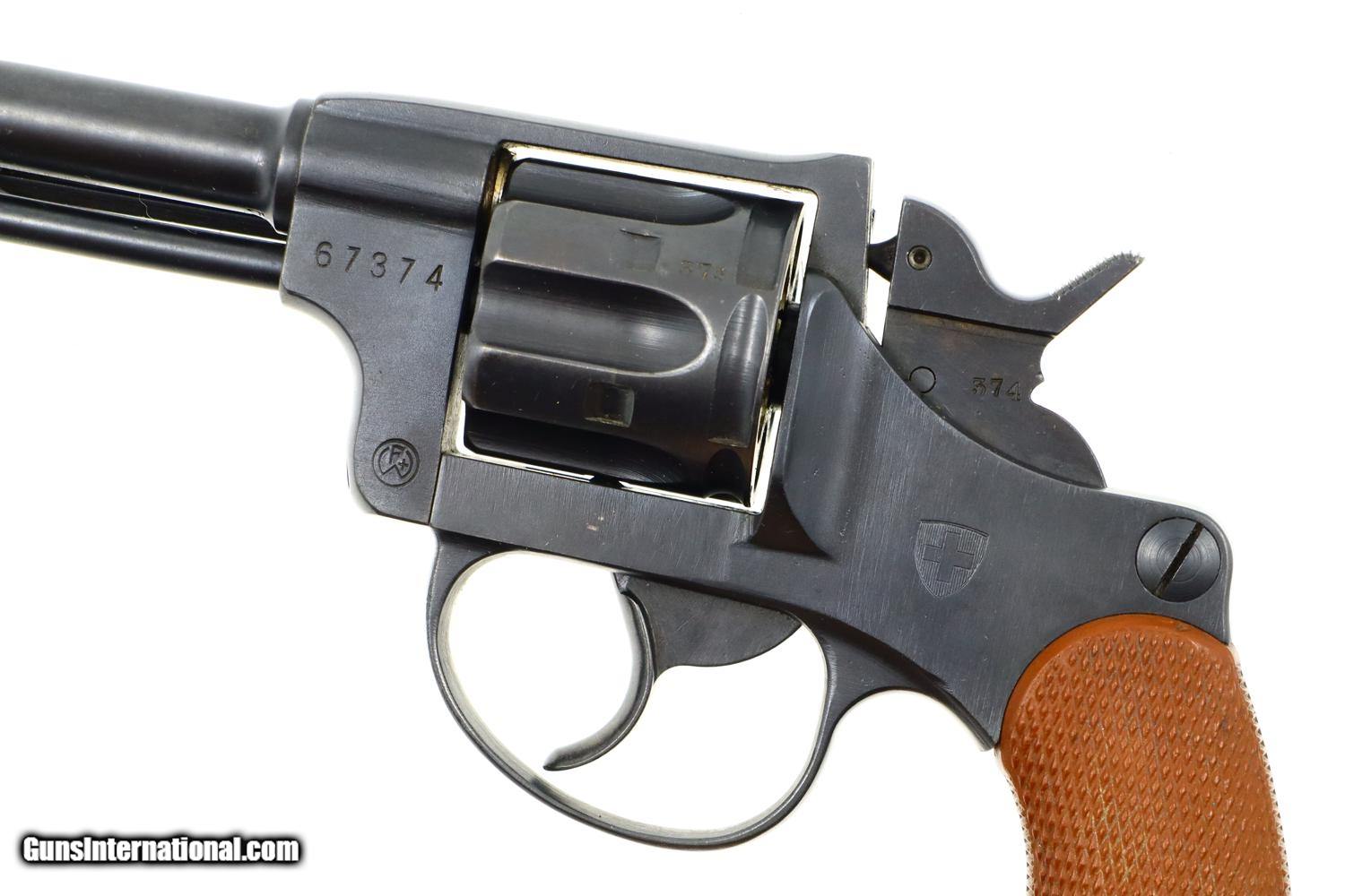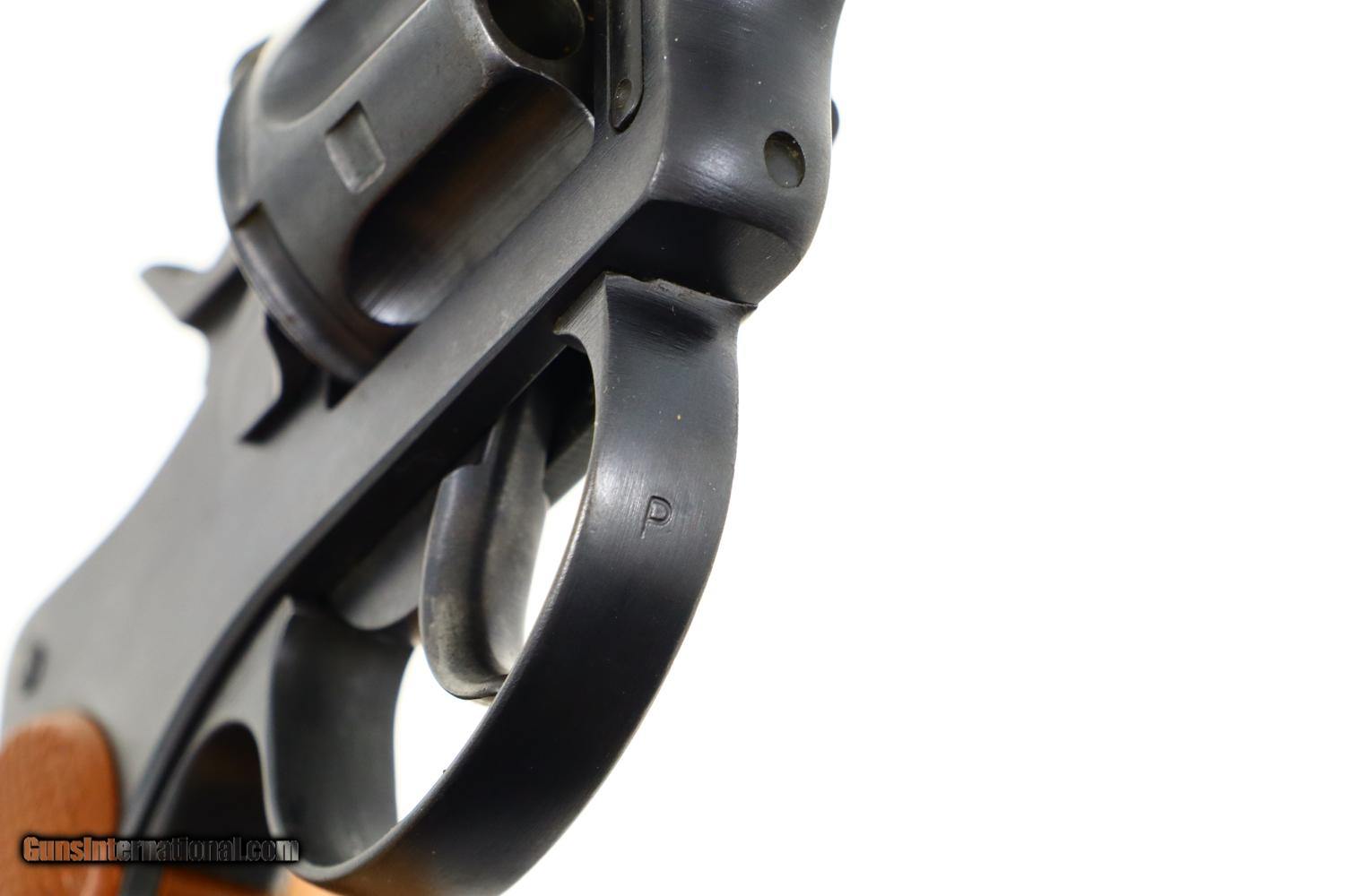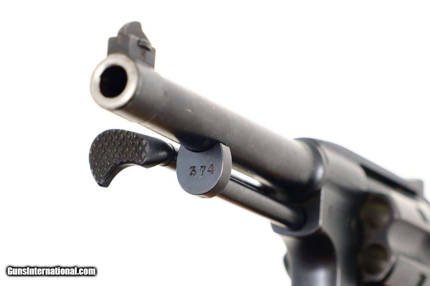 Description: Synopsis: Bern, 1929, Swiss Military Revolver, #67374, I-352 Description: Standard configuration 1929 Military revolver with 4.5” barrel having a drift adjustable front sight and a fixed rear sight. “W/F” logo on left frame in front of trigger guard. Prominent cross in shield just above the grip. “P” release on front of trigger guard. Salt blue finish, all matching parts including the cylinder, cylinder pin, hammer and loading gate. Checkered red grips. Lanyard ring present. Condition: Excellent, 98-99+% original salt blue with minimal holster wear. Mirror bore. Perfect manual mechanics, each cylinder indexing properly with tight lock-up. SOLD Manufacturer: Bern Model: 1929 Serial Number: 67374 Caliber Info: 7.5mm Condition: EXC |