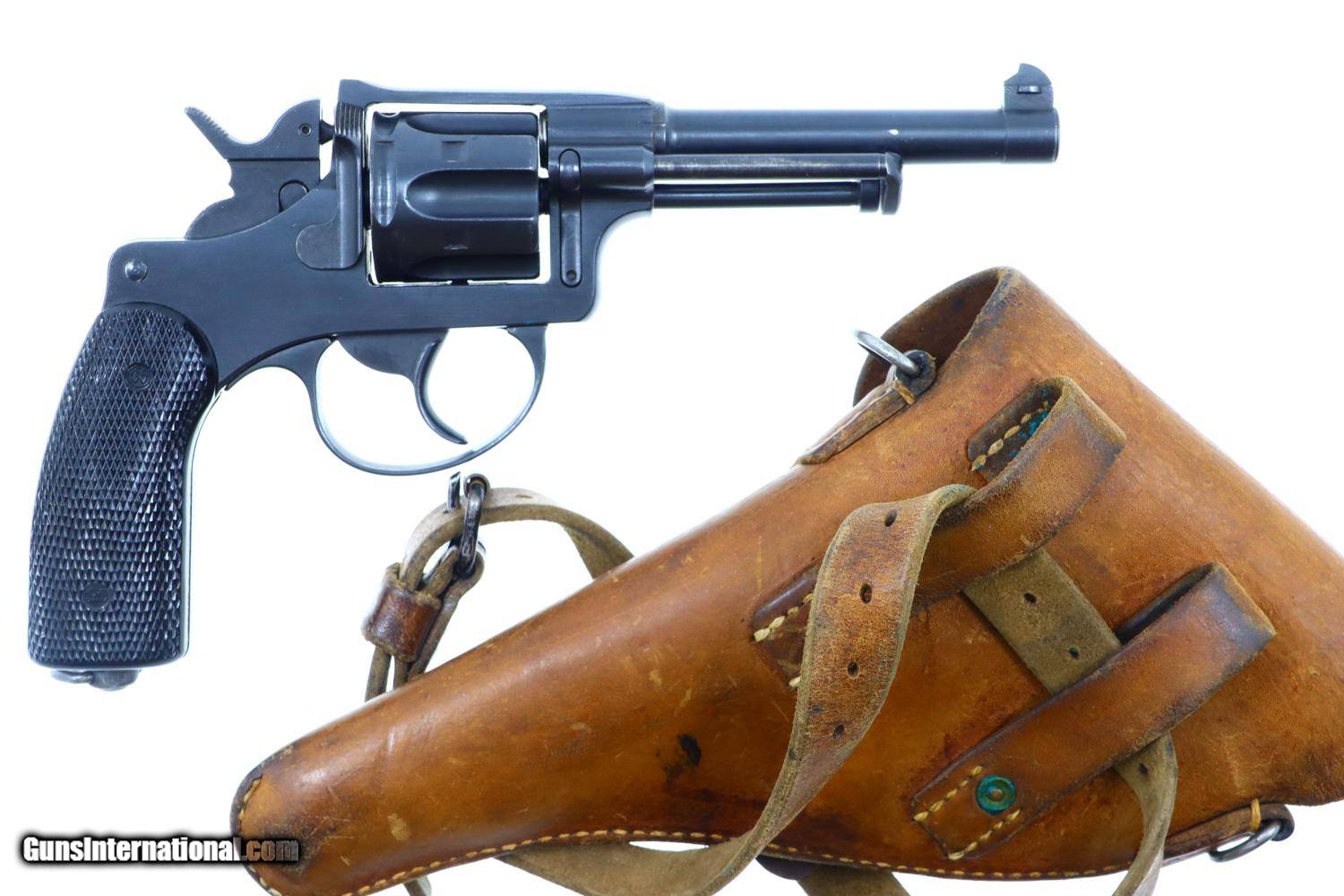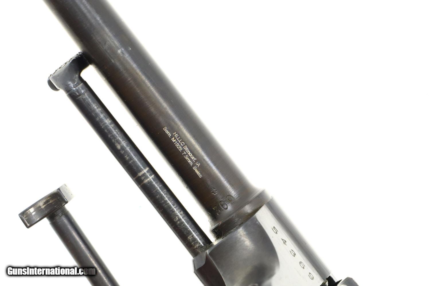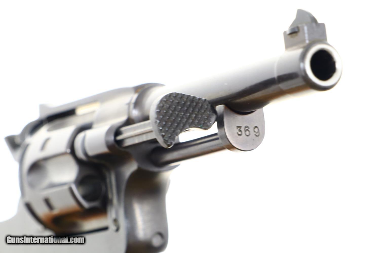 Description: Standard configuration 1929 Military revolver with 4.5” barrel having a drift adjustable front sight and a fixed rear sight. “W/F” logo on left frame in front of trigger guard. Prominent cross in shield just above the grip. “P” release on front of trigger guard. Salt blue finish, all matching parts including the cylinder, cylinder pin, hammer and loading gate. Checkered red grips. Lanyard ring present. Synopsis: Swiss Bern 1929 early military revolver, red grips. Condition: Excellent, near 99% original salt blue with minimal holster wear. Mirror bore. Perfect manual mechanics, each cylinder indexing properly with tight lock-up. A wonderful example of this early red grip military revolver. ~~Insured shipping fee of $45; most packages shipped using FedEx 2nd Day.~~ SOLD Curio/Relic: Yes Manufacturer: Bern Serial Number: 54369 Caliber Info: 7.5 mm |