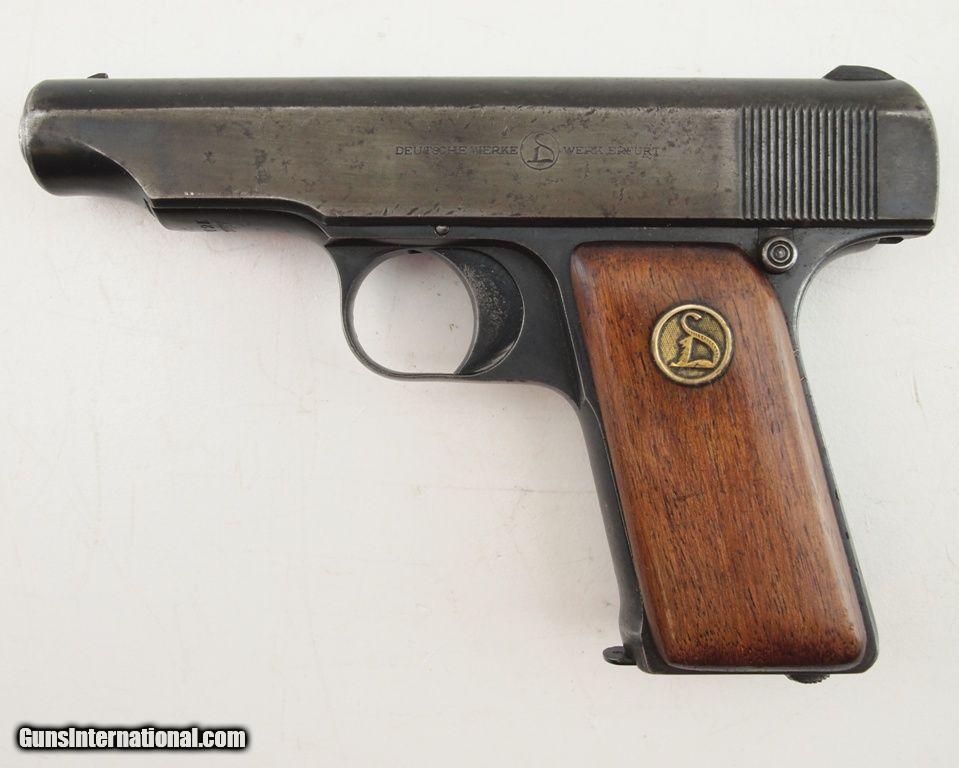 Description: Duetche-Werke Pocket Auto .32 ACP, 3 1/4" bbl, good bore, iron sights, blued finish, grip safety, overall good mechanical condition, one 7 shot after market magazine, and nice smooth hardwood grips with inset medallions. During test fire we had one cycling instance. Add 3% for Credit Card Shipping 25.00 SOLD |