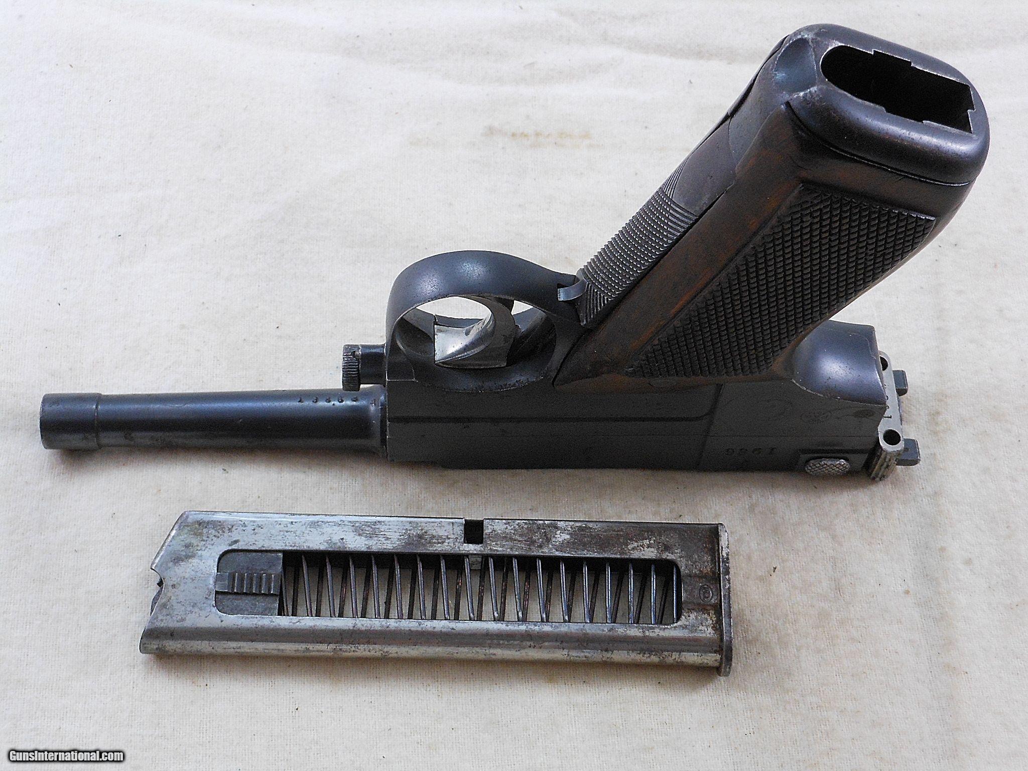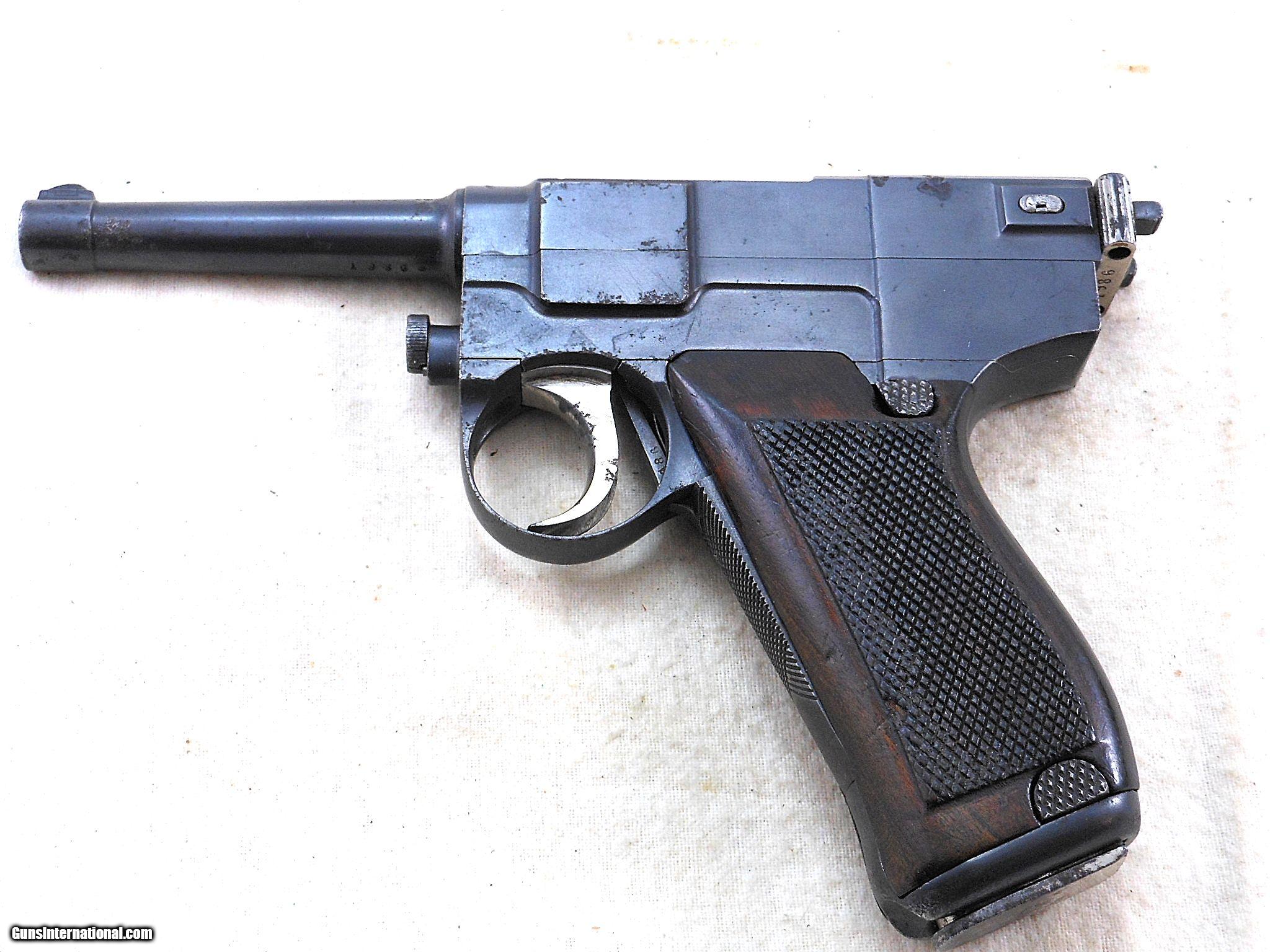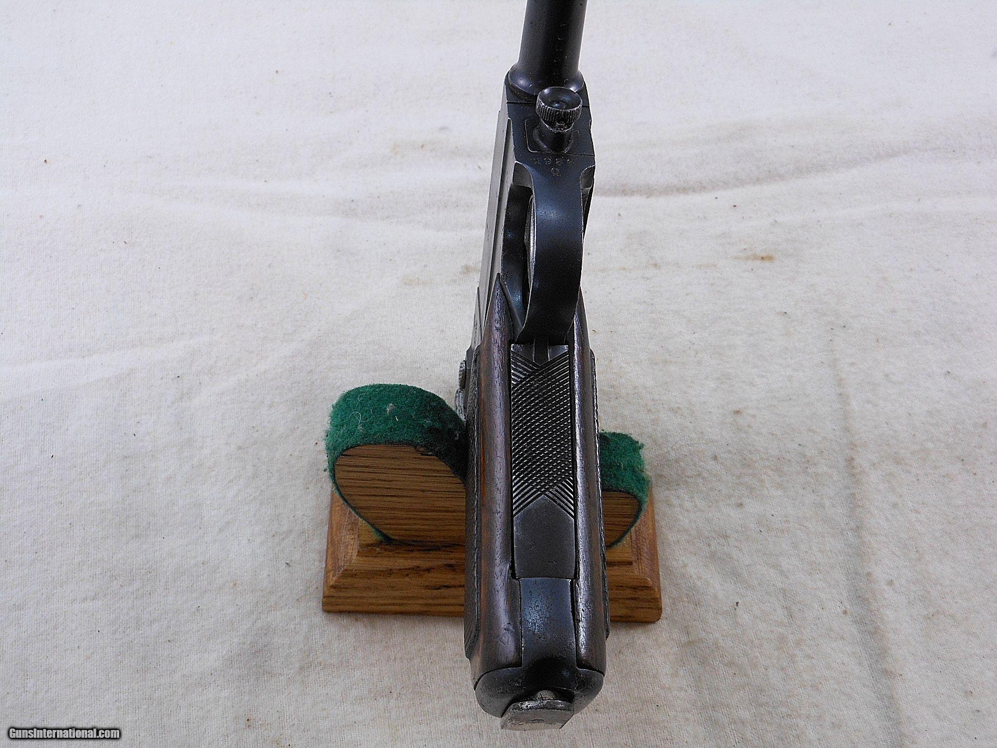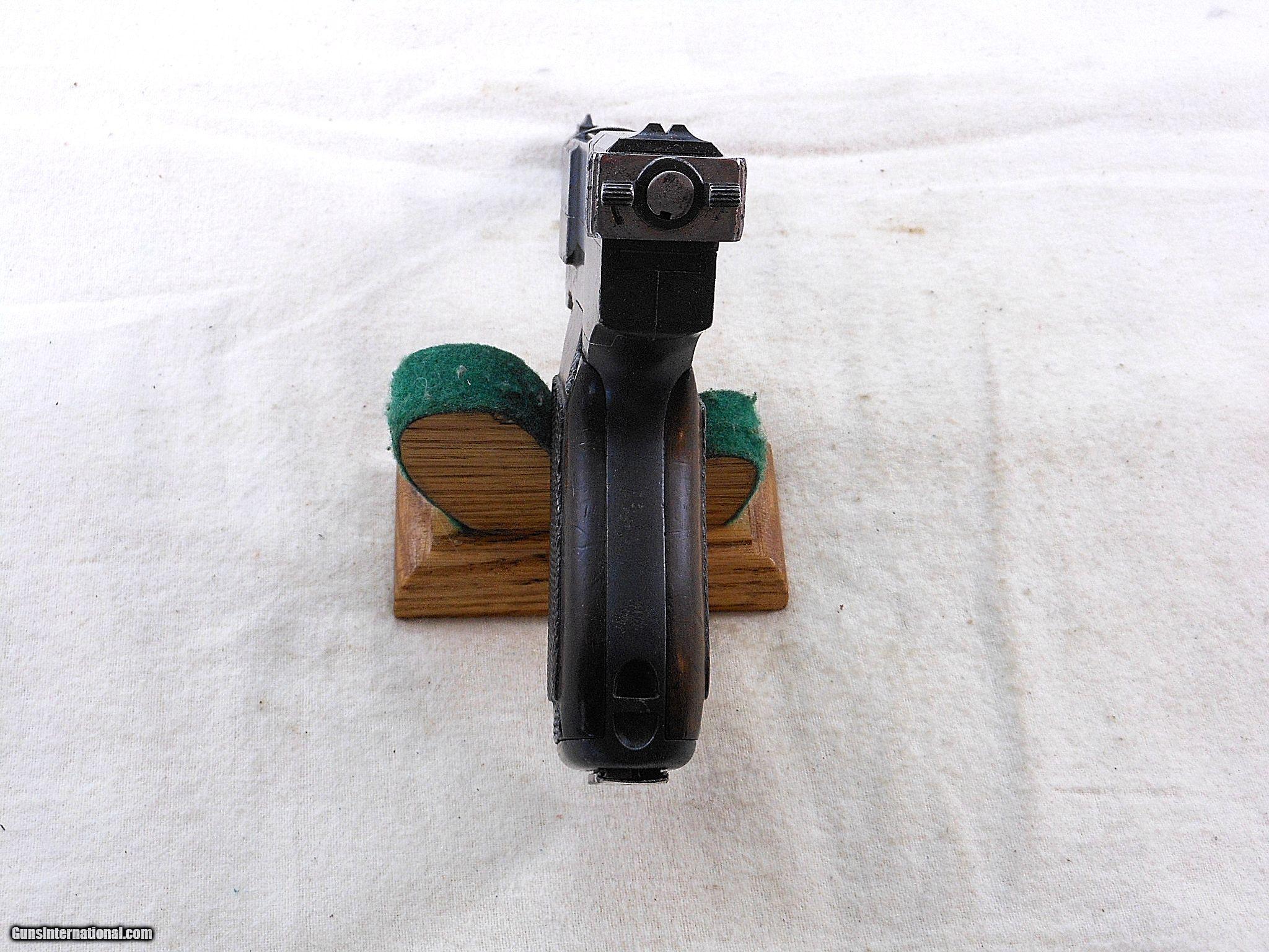 Description: This automatic pistol's serial number is Q-1986. It is all matched serial numbers. The cartridge is the same as the 9 M/M Luger, however it is loaded to much lower pressure. The wood grips are in fine condition. There are no cracks or chips. The pistols finish shows some light scattered pitting especially around the barrel area. The rust blue finish is otherwise strong on this pistol. The action works correctly. The bore is in good condition. The magazine is the correct original magazine. This is a seldom seen Italian pistol today. This pistol would rate a 90% overall condition. This is certainly a very collectable pistol for the military collector. Curio&Relic C.A.C. Consn. F. No. 255 -16 SOLD Curio/Relic: Yes Serial Number: Q1986 |