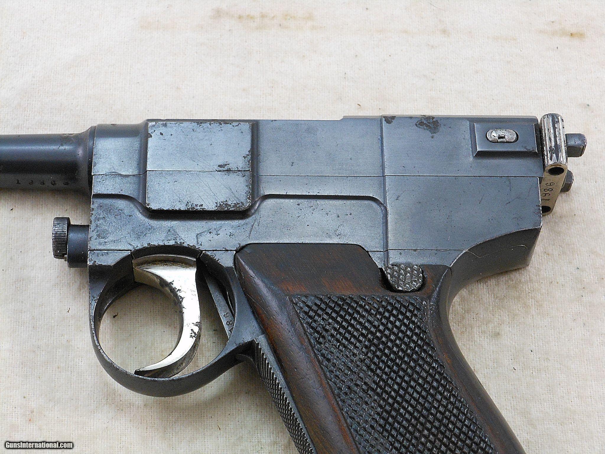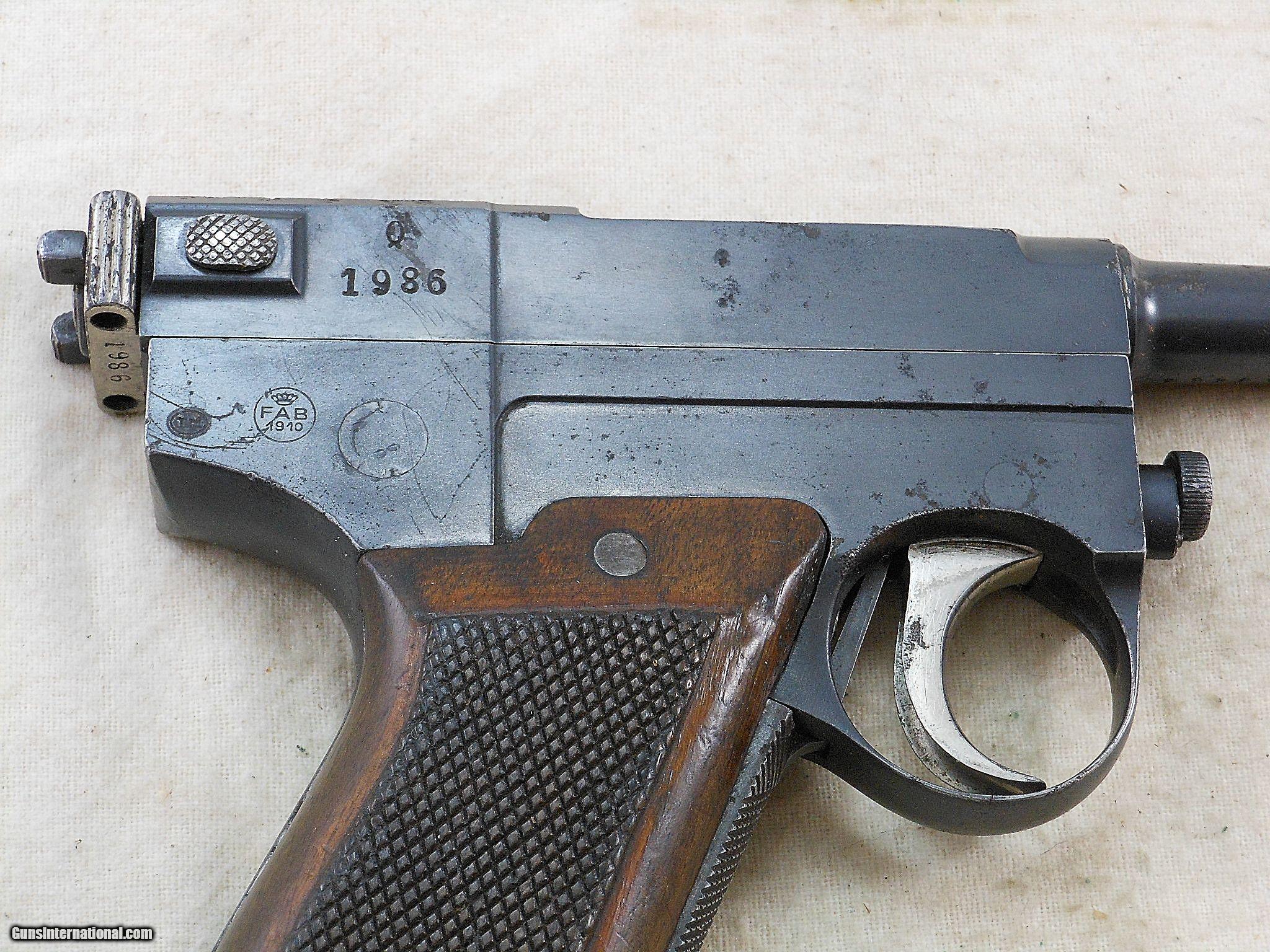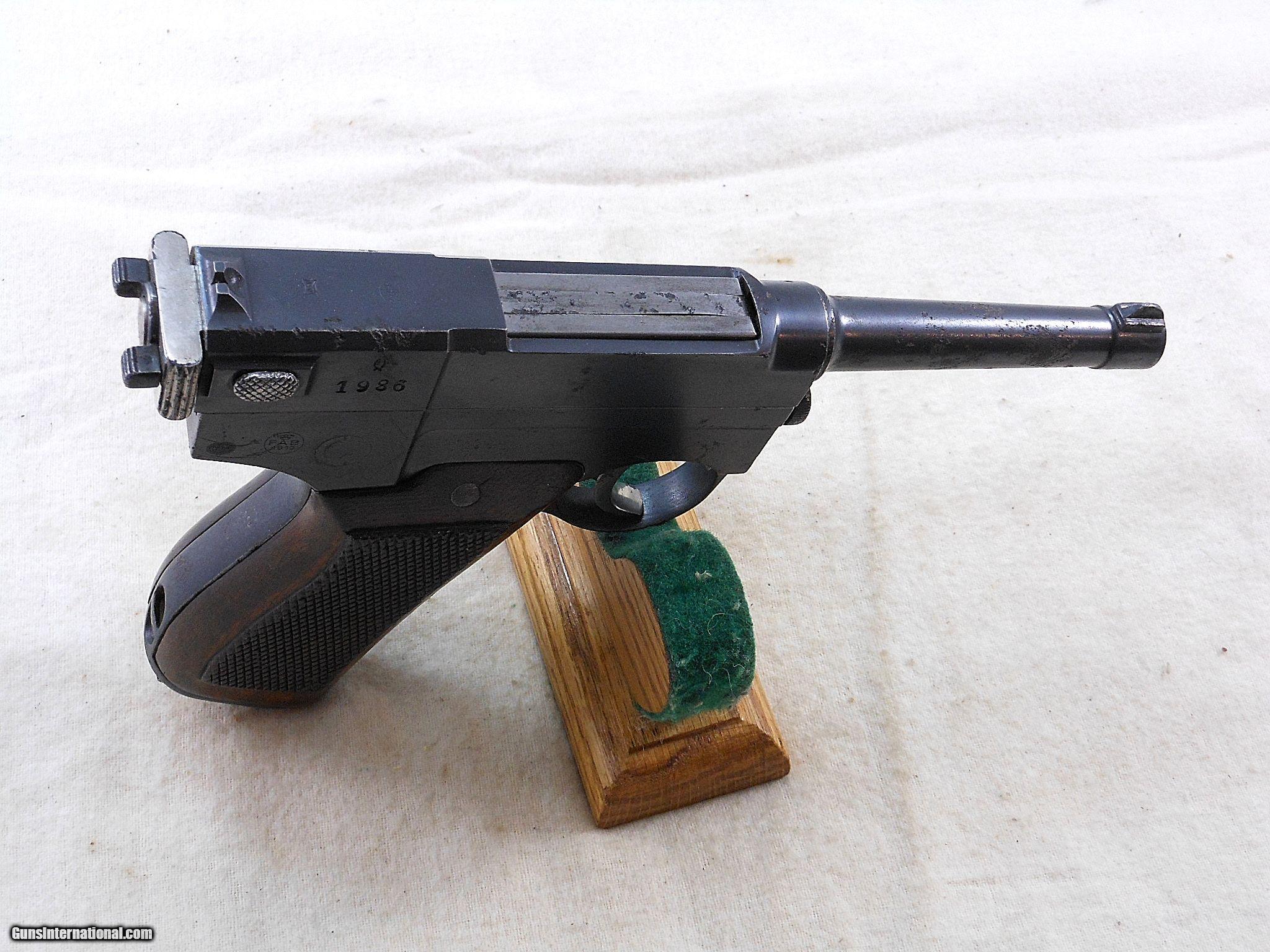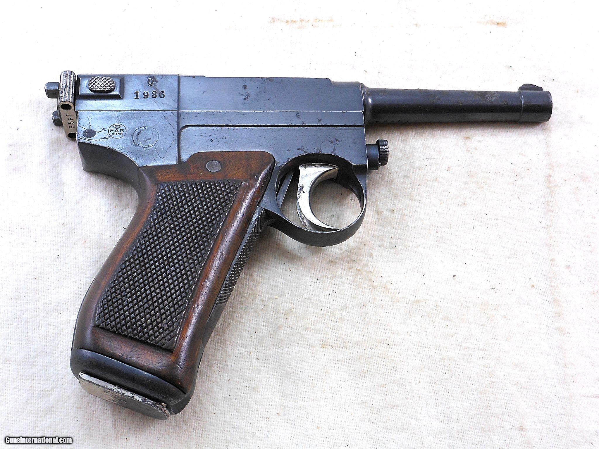 Description: This automatic pistol's serial number is Q-1986. It is all matched serial numbers. The cartridge is the same as the 9 M/M Luger, however it is loaded to much lower pressure. The wood grips are in fine condition. There are no cracks or chips. The pistols finish shows some light scattered pitting especially around the barrel area. The rust blue finish is otherwise strong on this pistol. The action works correctly. The bore is in good condition. The magazine is the correct original magazine. This is a seldom seen Italian pistol today. This pistol would rate a 90% overall condition. This is certainly a very collectable pistol for the military collector. Curio&Relic C.A.C. Consn. F. No. 255 -16 SOLD Curio/Relic: Yes Serial Number: Q1986 |