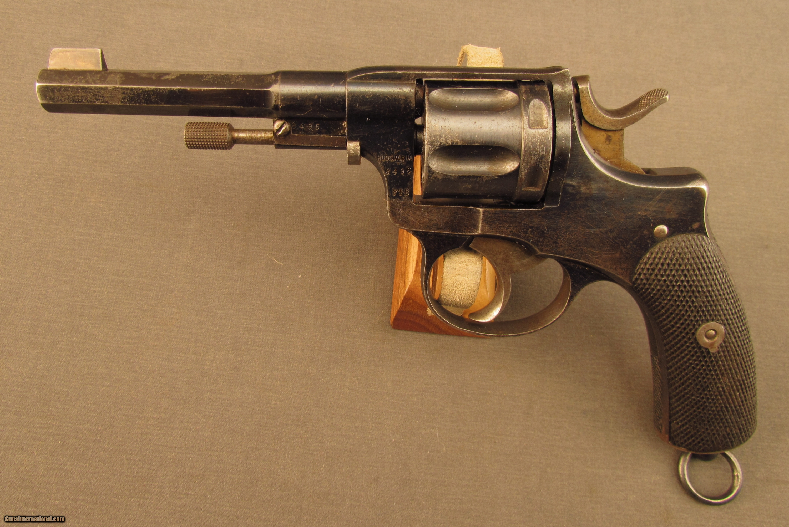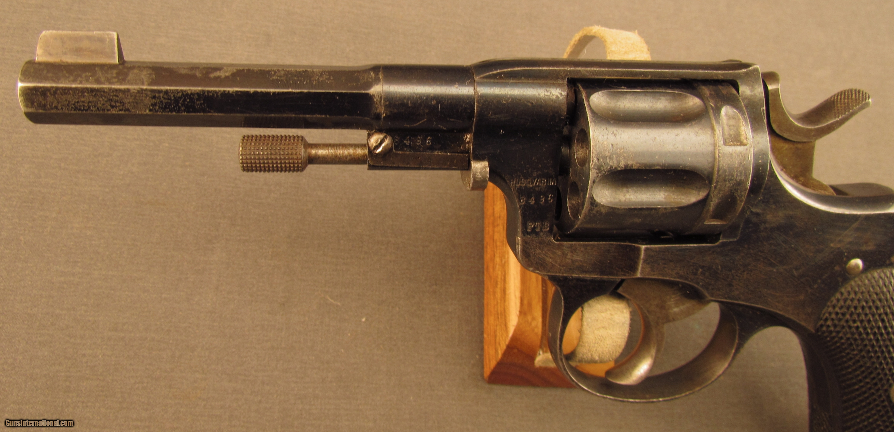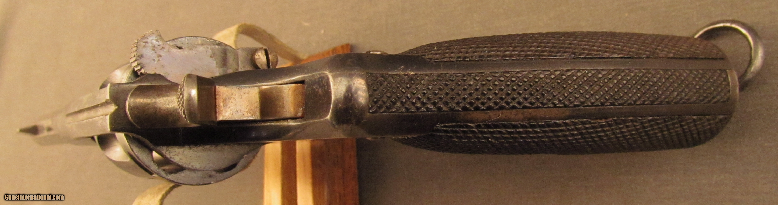 Description: Serial #8496, 7.5mm Swedish, 4 1/2” octagon barrel with an excellent, bright bore. This is a handsome revolver, made circa 1900, that has 85-90% of its original bright rust-blued finish remaining with some light fading and silvering along the edges of the barrel and unit marked frame (“L No. 3724”). Additionally, there are some small areas of freckling and pinprick pitting visible on the trigger, hammer, and loading gate spring which retain much of their original dark but brilliant straw color and the cylinder, which has a light turn-ring and mild fading at the edges. The checkered wooden grips are in very good-fine condition and exhibit some minor flattening of the points with light handling marks at the butt on either side. The revolver locks up tightly and the mechanism functions flawlessly and is housed in an original dark brown leather flap holster with double belt loops and black enameled snap fastener. This is a great “Husky” in fine overall condition that would make a nice addition to any collection. FFL or C&R SOLD Curio/Relic: Yes Manufacturer: Swedish Model: 1887 Serial Number: 633 Caliber Info: 7.5mm Gauge Info: 7.5mm |