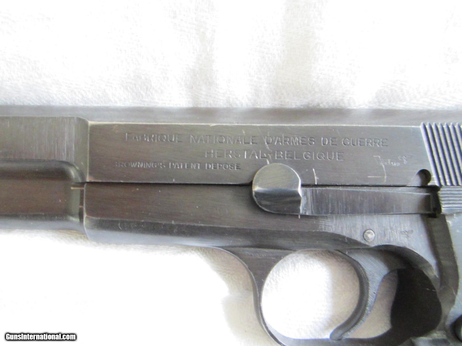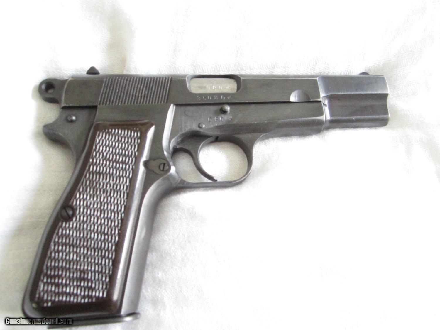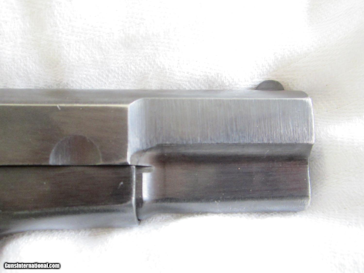 Description: A beautiful German World War 2 Browning Hi Power Model 1935 made by Fabrique Nationale D'Armes De Guerre type 3. This pistol is in about 97-98% condition with a late war production brown type finish. It has seen very little use. The bakelite grips are in mint condition. The bore is bright and shiney with sharp rifling. The serial number is 35080. The number "080" appears on the frame and also on the barrel.. There is an "W8140 over an Eagle" and an " Eagle carrying a Nazi Swastika" on both the slide and on the frame. On the bottom of the grip there is a "75 over a letter J". There is a small crack near a screw on the left side grip , some minor marks and production machine marks here and there.There is no number on the magazine. The action is strong. The sights are fixed and the grip is not cut for a shoulder stock. There is no apparant wear on either the front or rear grip straps. They don't come much better than this one! SOLD Curio/Relic: Yes Manufacturer: Fabrique Nationale Model: Hi Power Serial Number: 35080 Caliber Info: 9mm Metal Condition: 98% Wood Condition: 99% Bore Condition: Bright Action: semi-auto Stock: Bakelite Sights: Fixed Manufacture Date: 1944 est. |