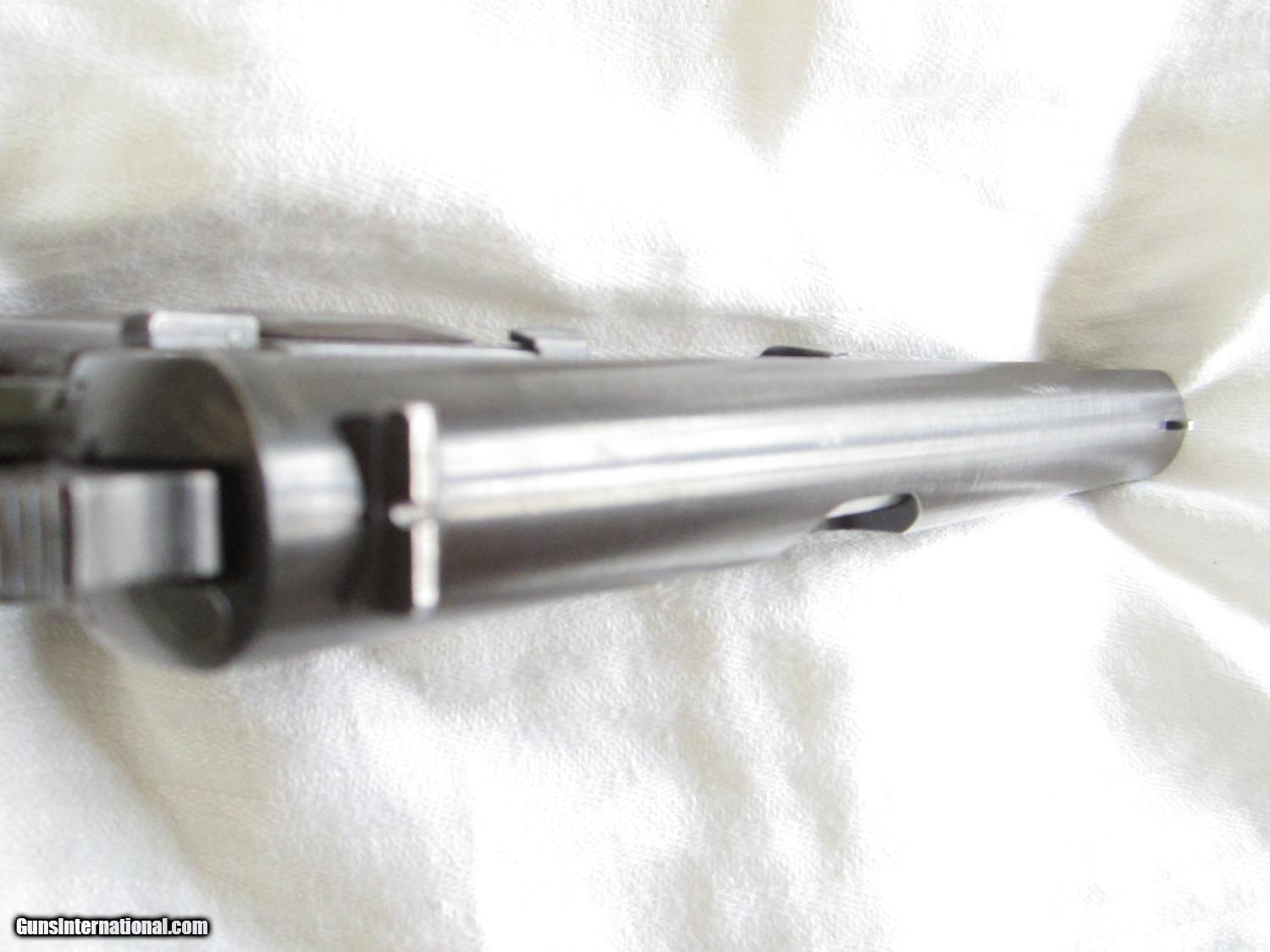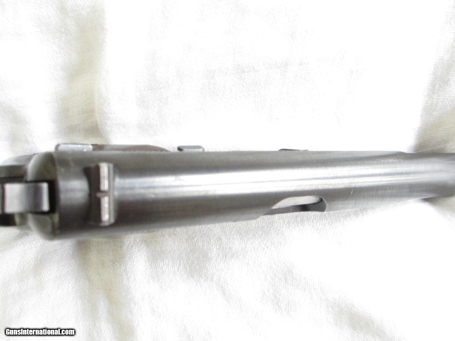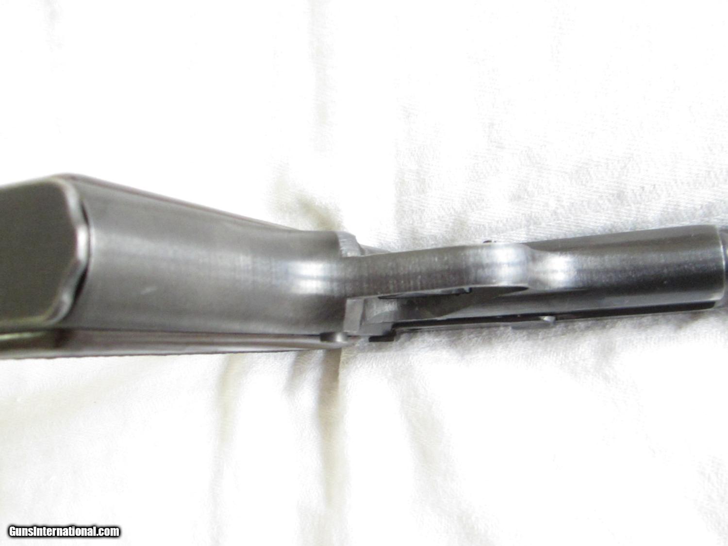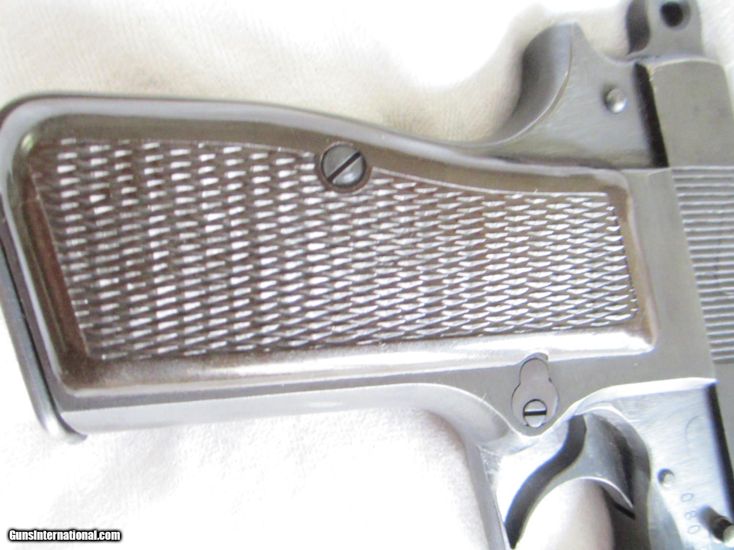 Description: A beautiful German World War 2 Browning Hi Power Model 1935 made by Fabrique Nationale D'Armes De Guerre type 3. This pistol is in about 97-98% condition with a late war production brown type finish. It has seen very little use. The bakelite grips are in mint condition. The bore is bright and shiney with sharp rifling. The serial number is 35080. The number "080" appears on the frame and also on the barrel.. There is an "W8140 over an Eagle" and an " Eagle carrying a Nazi Swastika" on both the slide and on the frame. On the bottom of the grip there is a "75 over a letter J". There is a small crack near a screw on the left side grip , some minor marks and production machine marks here and there.There is no number on the magazine. The action is strong. The sights are fixed and the grip is not cut for a shoulder stock. There is no apparant wear on either the front or rear grip straps. They don't come much better than this one! SOLD Curio/Relic: Yes Manufacturer: Fabrique Nationale Model: Hi Power Serial Number: 35080 Caliber Info: 9mm Metal Condition: 98% Wood Condition: 99% Bore Condition: Bright Action: semi-auto Stock: Bakelite Sights: Fixed Manufacture Date: 1944 est. |