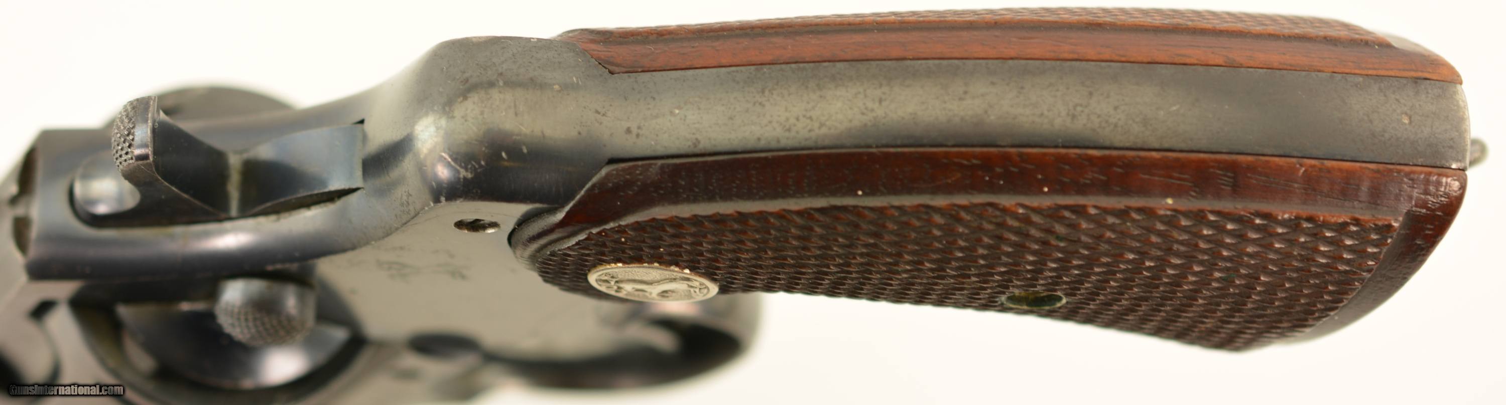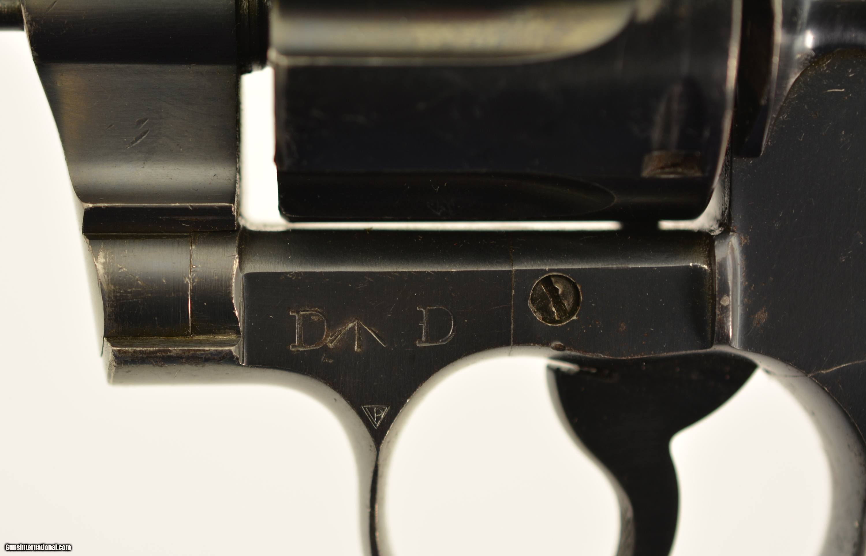 Description: Serial #683012, .38 S&W, 5 inch barrel with an excellent, bright bore. This is a handsome revolver that retains 95-97% of the original blue finish with silvering along the high edges and projections, some small scratches and handling marks (especially around a few of the cylinder flutes) and some mild fading along the backstrap. The cylinder has a mild turn-ring, the hammer has some minor freckling on the sides of the spur, and the mechanism is fully functional, although the slightly difficult to close, and the cylinder release has scratches on the face from forced closure. The left side of the frame has a deeply struck “D^D" Australian property stamp, with some further issue numbers stamped on the right side: “3 / 2485". The checkered walnut Colt medallion grips are in excellent, nearly new condition having very few handling marks and almost no flattening of the points. This is a very good-fine example of a WW2 Australian-issued Colt, and would make a great addition to any collection. FFL or C&R SOLD Curio/Relic: Yes Manufacturer: Colt Model: Official Police Serial Number: 683012 Caliber Info: .38 S&W Gauge Info: .38 S&W |