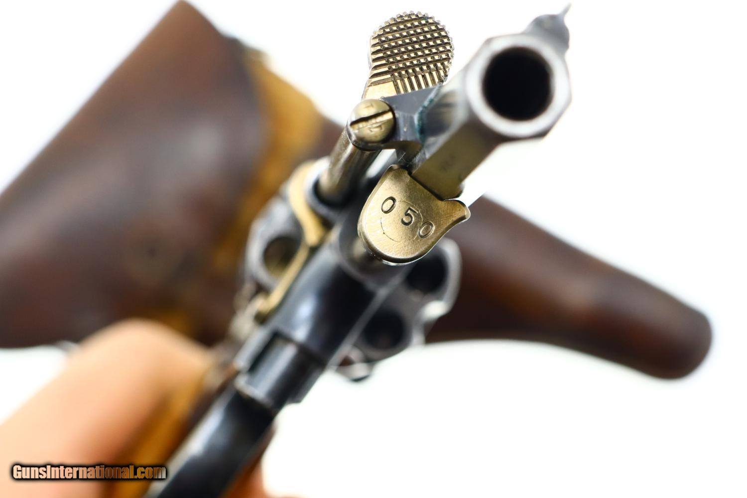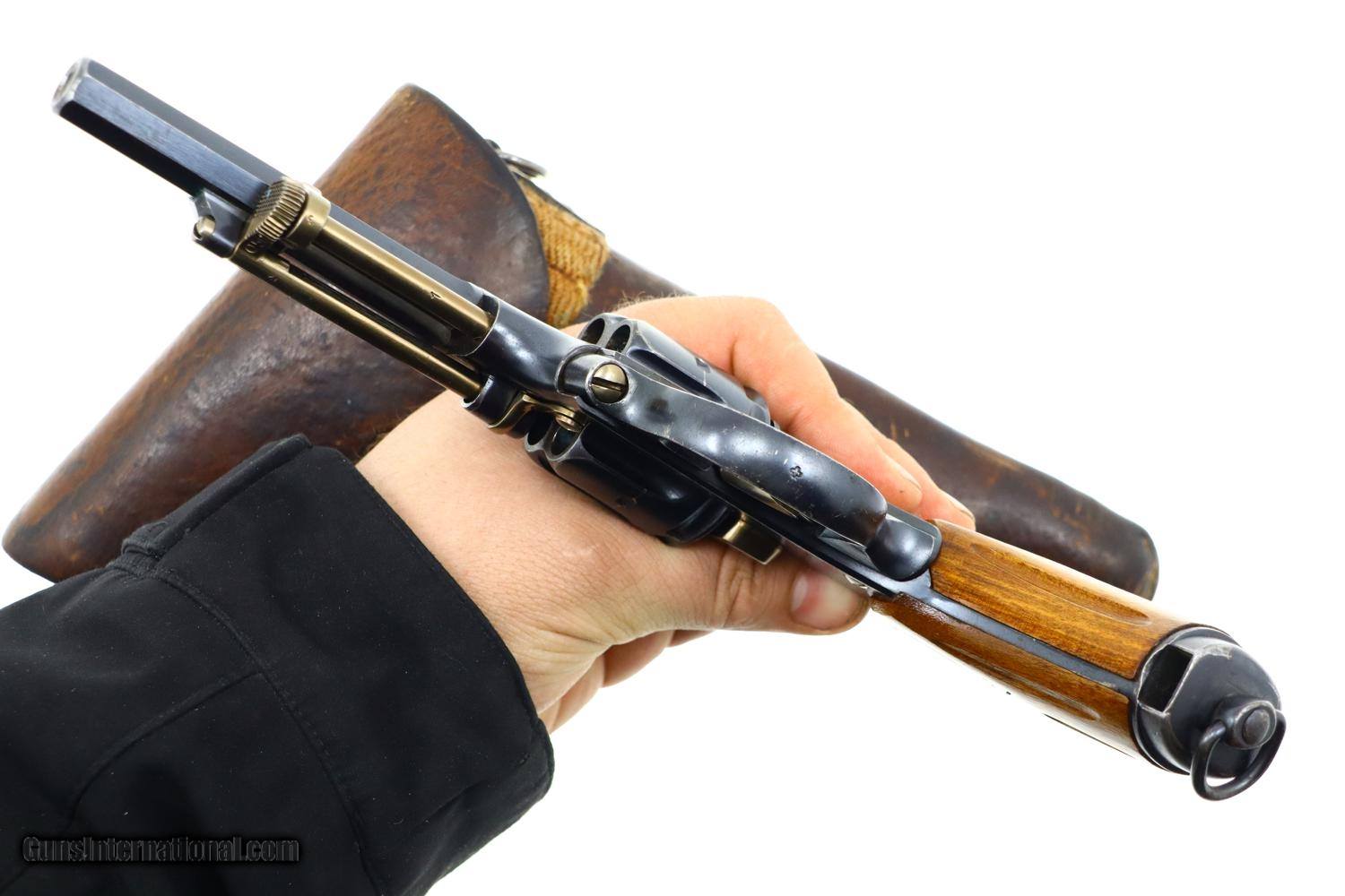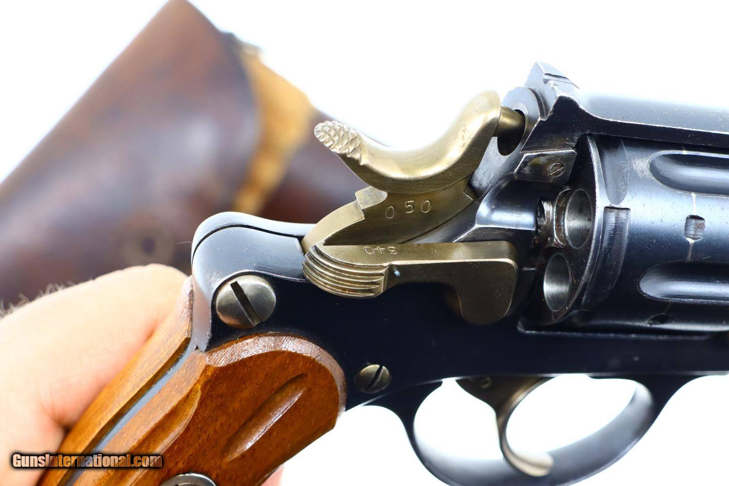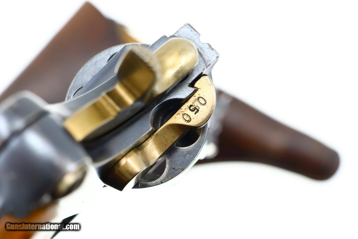 Description: Standard configuration 1882 SA/DA revolver, cal 7.5mm, with 4.5” barrel having fixed front and rear sights. Release dated “37”. Matching parts include barrel, frame, cylinder, cylinder axle, hammer, trigger, loading gate and ejector. Most of these also marked with assembly number “340”. Major parts are rust blued with strawed small parts. Wood fluted grips. Butt with rotatable lanyard ring. Complete with original holster, dated “45”, for the later Bern 1929 revolver. Synopsis: Attractive Swiss 1882 Military Revolver, original condition, all matching, holster 7.5mm Condition: VG-EXC original rust blued finish with nicely enhanced strawed parts. Crisp comparable condition grips. Bright bore with sharp rifling. Perfect manual mechanics, each cylinder locking up tightly. A very nice condition, mid-production and all matching 1882 Swiss military revolver with a later era holster. ~~Insured shipping fee of $45; most packages shipped using FedEx 2nd Day.~~ SOLD Antique: Yes Manufacturer: Bern Serial Number: 21050 Caliber Info: 7.5mm |