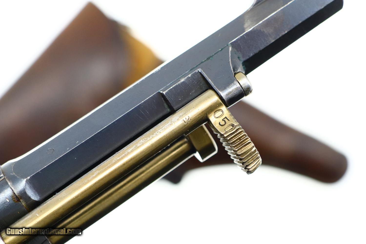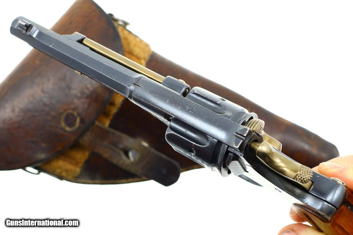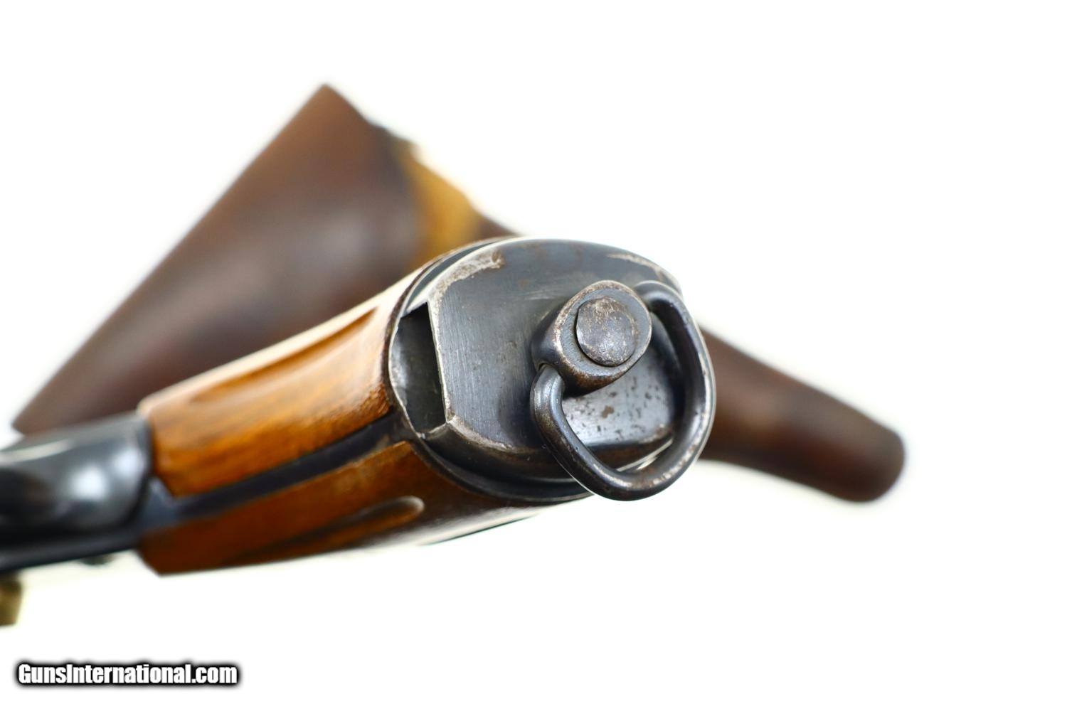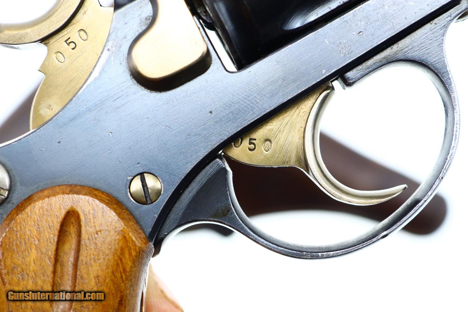 Description: Standard configuration 1882 SA/DA revolver, cal 7.5mm, with 4.5” barrel having fixed front and rear sights. Release dated “37”. Matching parts include barrel, frame, cylinder, cylinder axle, hammer, trigger, loading gate and ejector. Most of these also marked with assembly number “340”. Major parts are rust blued with strawed small parts. Wood fluted grips. Butt with rotatable lanyard ring. Complete with original holster, dated “45”, for the later Bern 1929 revolver. Synopsis: Attractive Swiss 1882 Military Revolver, original condition, all matching, holster 7.5mm Condition: VG-EXC original rust blued finish with nicely enhanced strawed parts. Crisp comparable condition grips. Bright bore with sharp rifling. Perfect manual mechanics, each cylinder locking up tightly. A very nice condition, mid-production and all matching 1882 Swiss military revolver with a later era holster. ~~Insured shipping fee of $45; most packages shipped using FedEx 2nd Day.~~ SOLD Antique: Yes Manufacturer: Bern Serial Number: 21050 Caliber Info: 7.5mm |