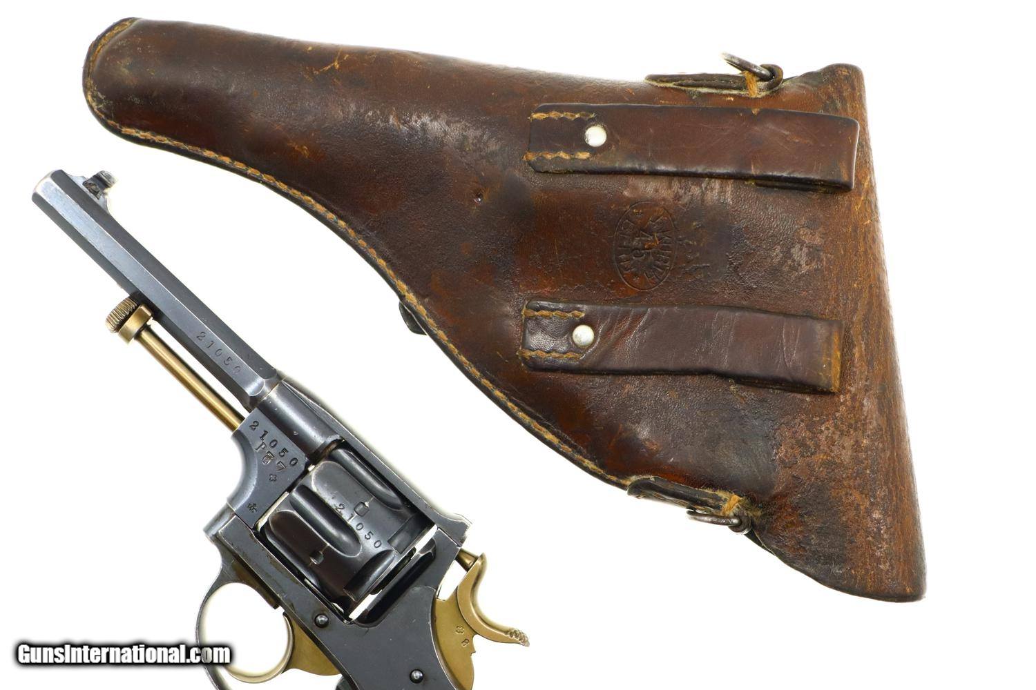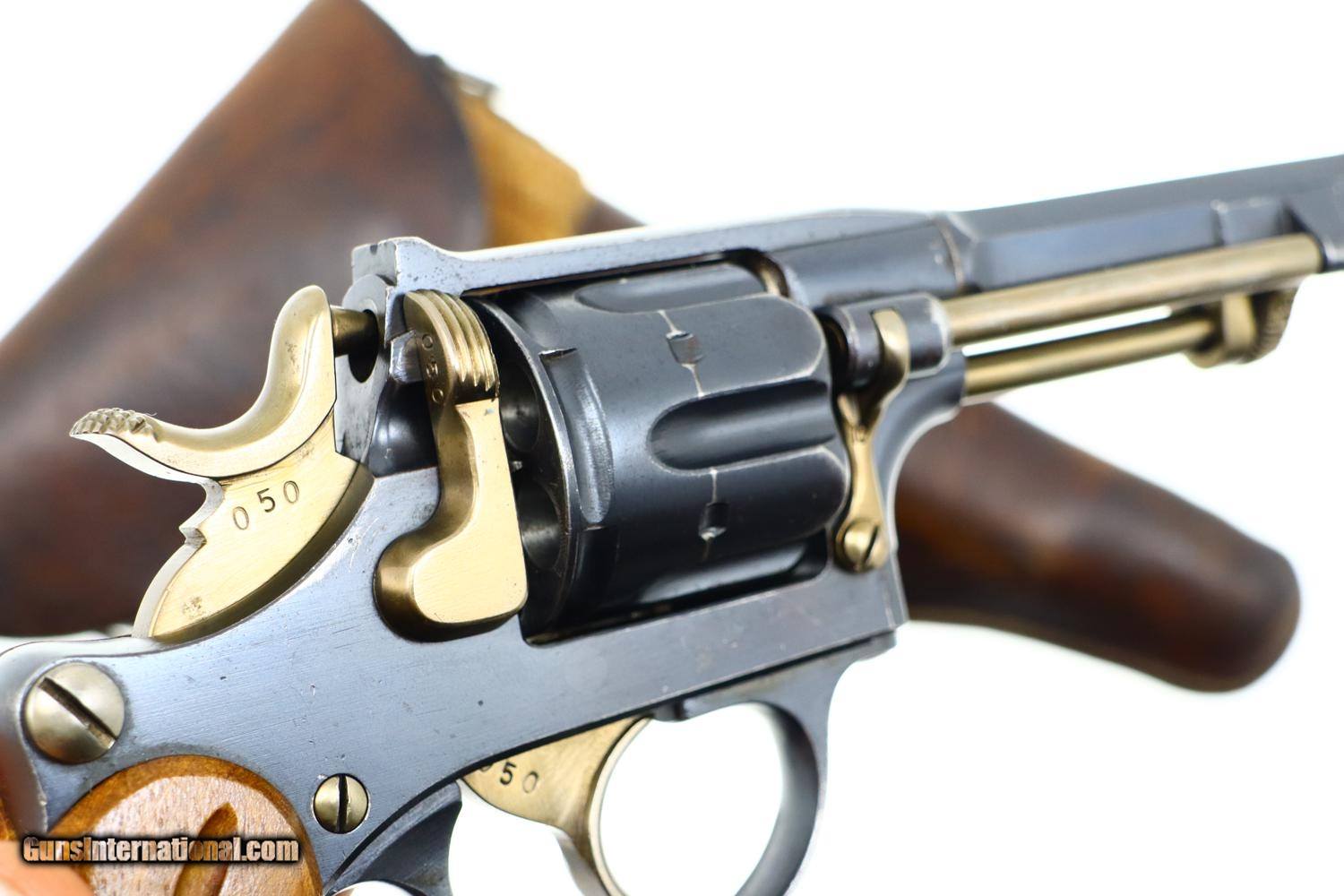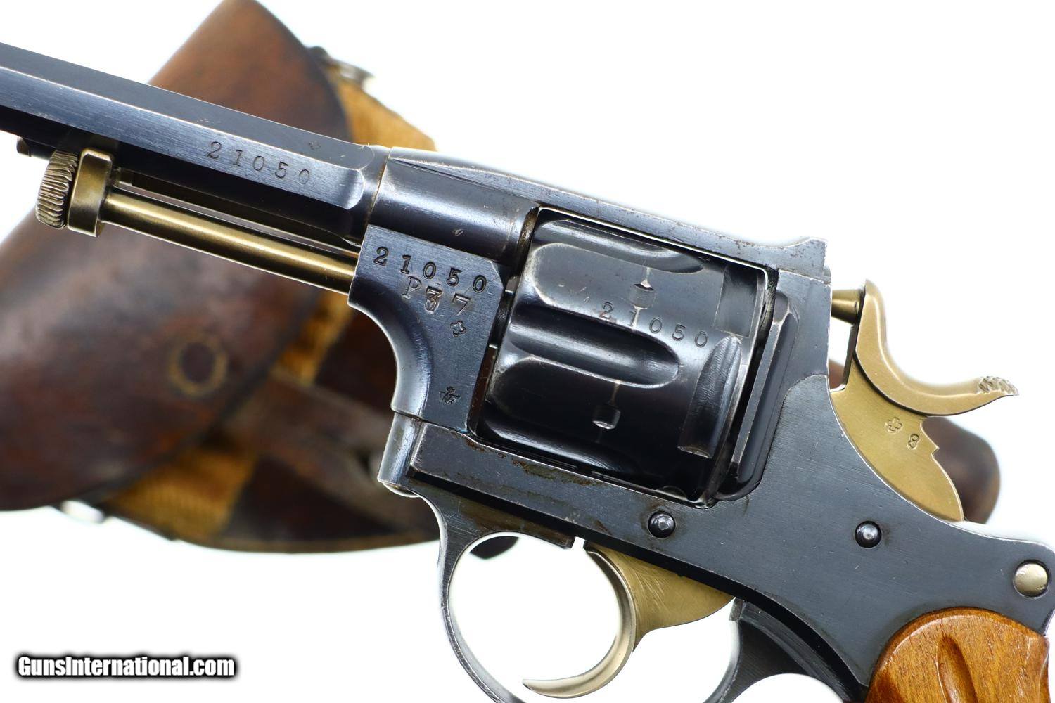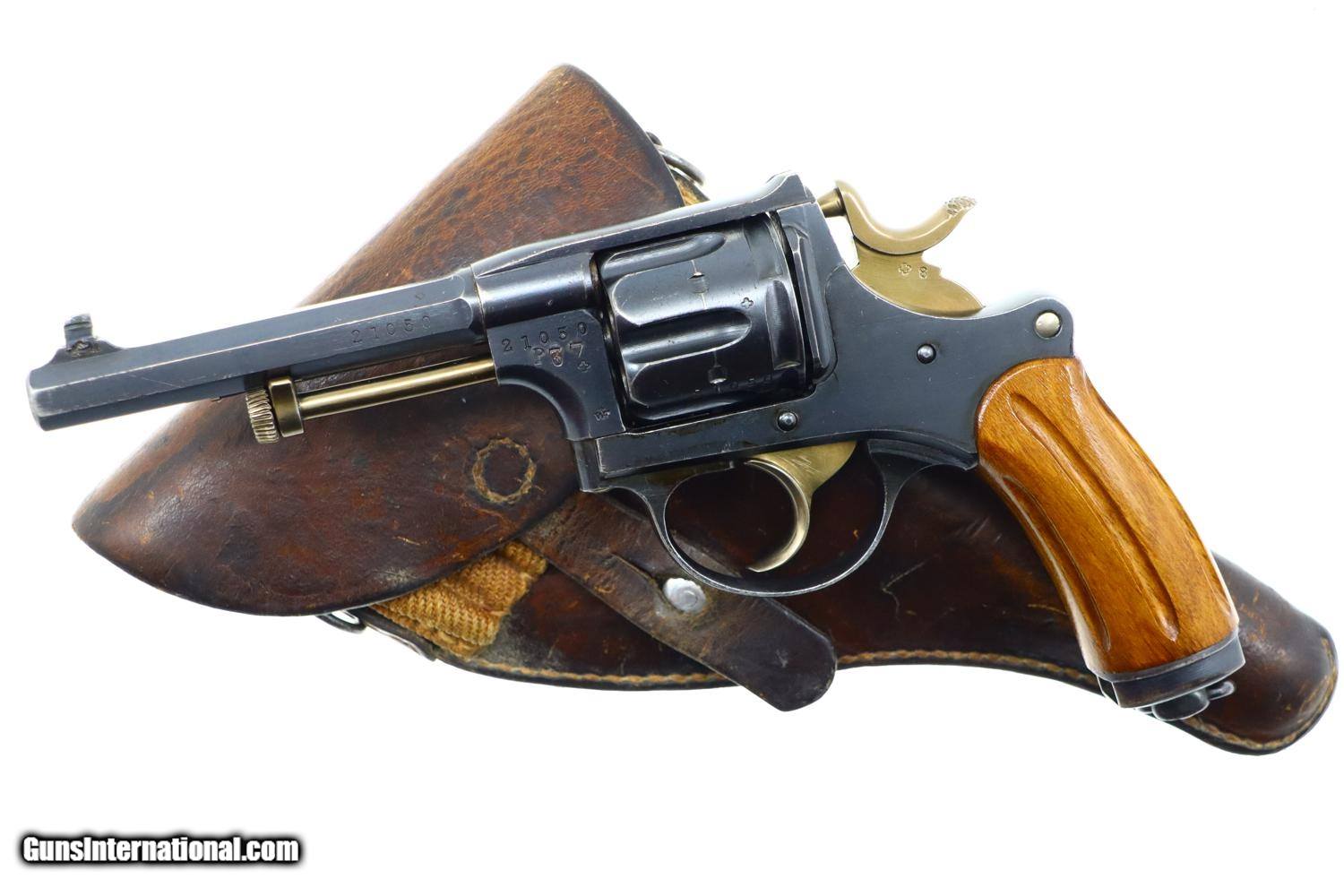 Description: Standard configuration 1882 SA/DA revolver, cal 7.5mm, with 4.5” barrel having fixed front and rear sights. Release dated “37”. Matching parts include barrel, frame, cylinder, cylinder axle, hammer, trigger, loading gate and ejector. Most of these also marked with assembly number “340”. Major parts are rust blued with strawed small parts. Wood fluted grips. Butt with rotatable lanyard ring. Complete with original holster, dated “45”, for the later Bern 1929 revolver. Synopsis: Attractive Swiss 1882 Military Revolver, original condition, all matching, holster 7.5mm Condition: VG-EXC original rust blued finish with nicely enhanced strawed parts. Crisp comparable condition grips. Bright bore with sharp rifling. Perfect manual mechanics, each cylinder locking up tightly. A very nice condition, mid-production and all matching 1882 Swiss military revolver with a later era holster. ~~Insured shipping fee of $45; most packages shipped using FedEx 2nd Day.~~ SOLD Antique: Yes Manufacturer: Bern Serial Number: 21050 Caliber Info: 7.5mm |