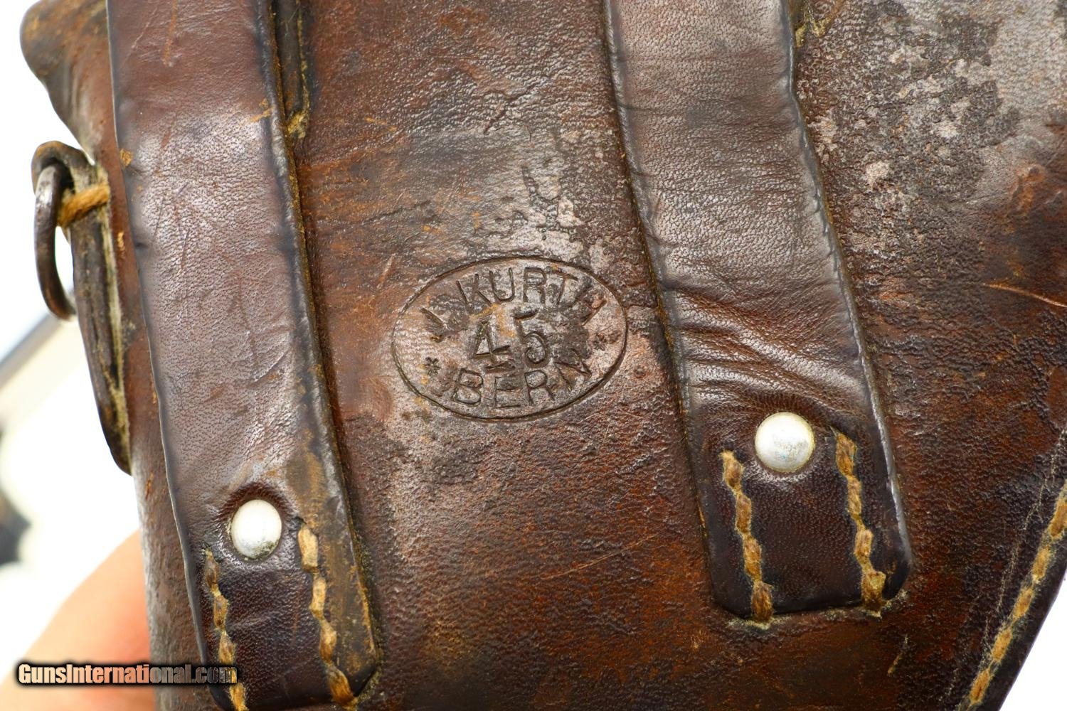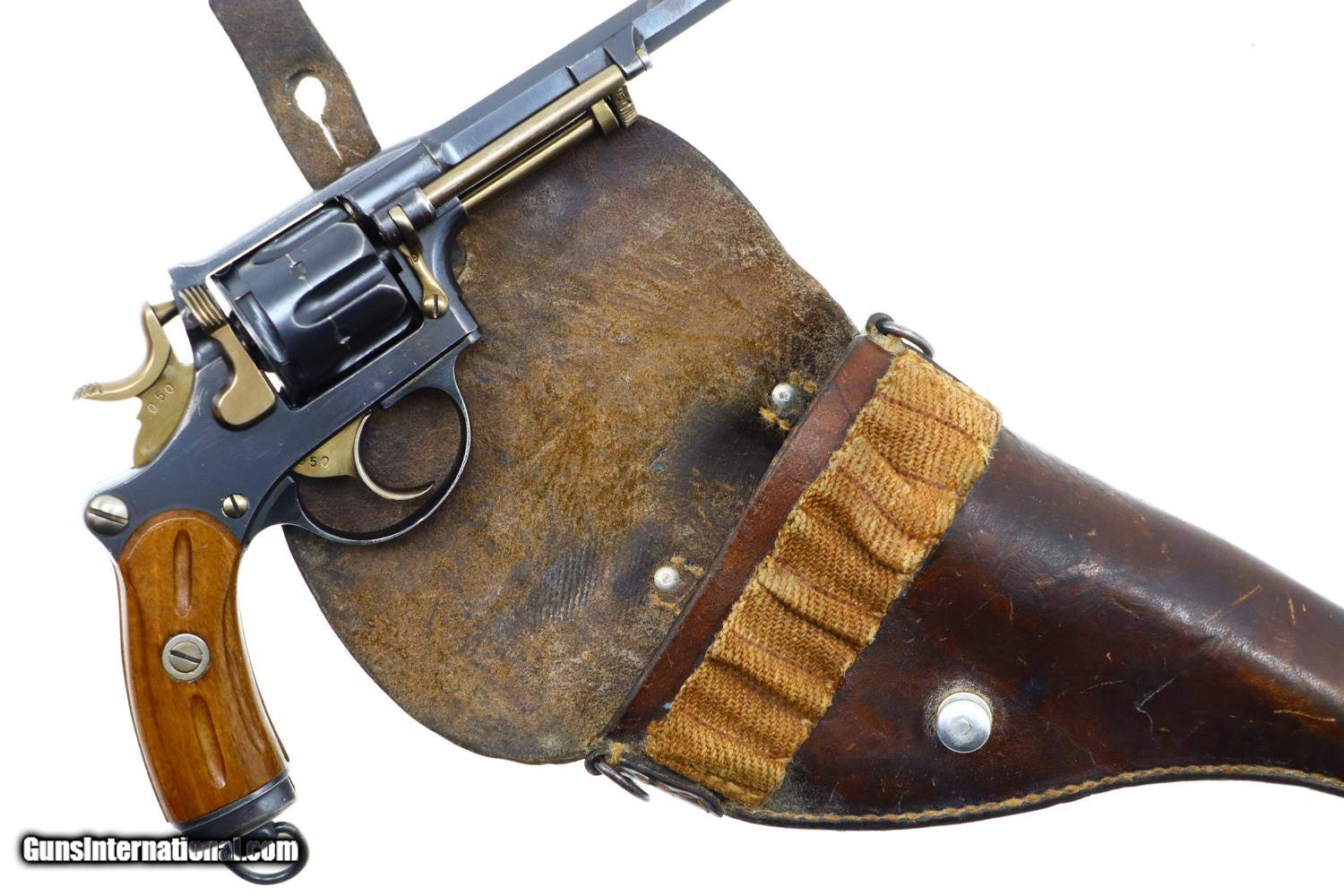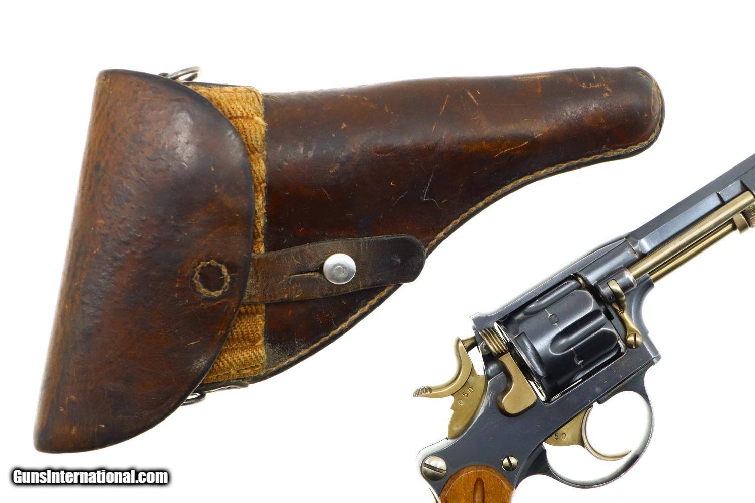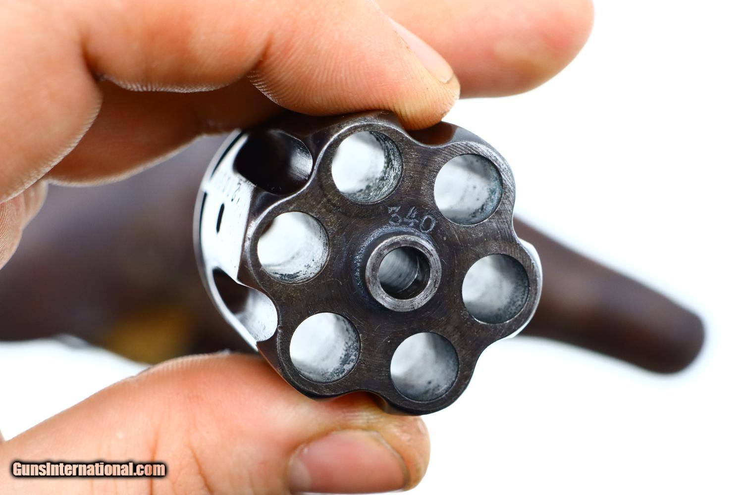 Description: Standard configuration 1882 SA/DA revolver, cal 7.5mm, with 4.5” barrel having fixed front and rear sights. Release dated “37”. Matching parts include barrel, frame, cylinder, cylinder axle, hammer, trigger, loading gate and ejector. Most of these also marked with assembly number “340”. Major parts are rust blued with strawed small parts. Wood fluted grips. Butt with rotatable lanyard ring. Complete with original holster, dated “45”, for the later Bern 1929 revolver. Synopsis: Attractive Swiss 1882 Military Revolver, original condition, all matching, holster 7.5mm Condition: VG-EXC original rust blued finish with nicely enhanced strawed parts. Crisp comparable condition grips. Bright bore with sharp rifling. Perfect manual mechanics, each cylinder locking up tightly. A very nice condition, mid-production and all matching 1882 Swiss military revolver with a later era holster. ~~Insured shipping fee of $45; most packages shipped using FedEx 2nd Day.~~ SOLD Antique: Yes Manufacturer: Bern Serial Number: 21050 Caliber Info: 7.5mm |