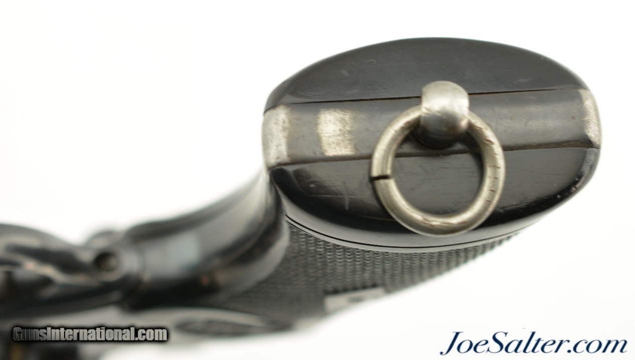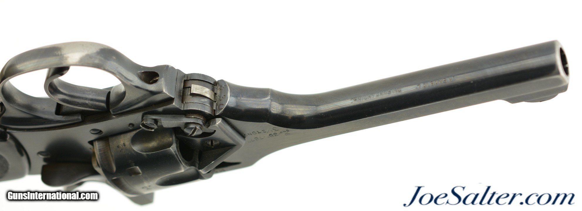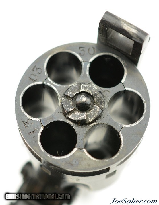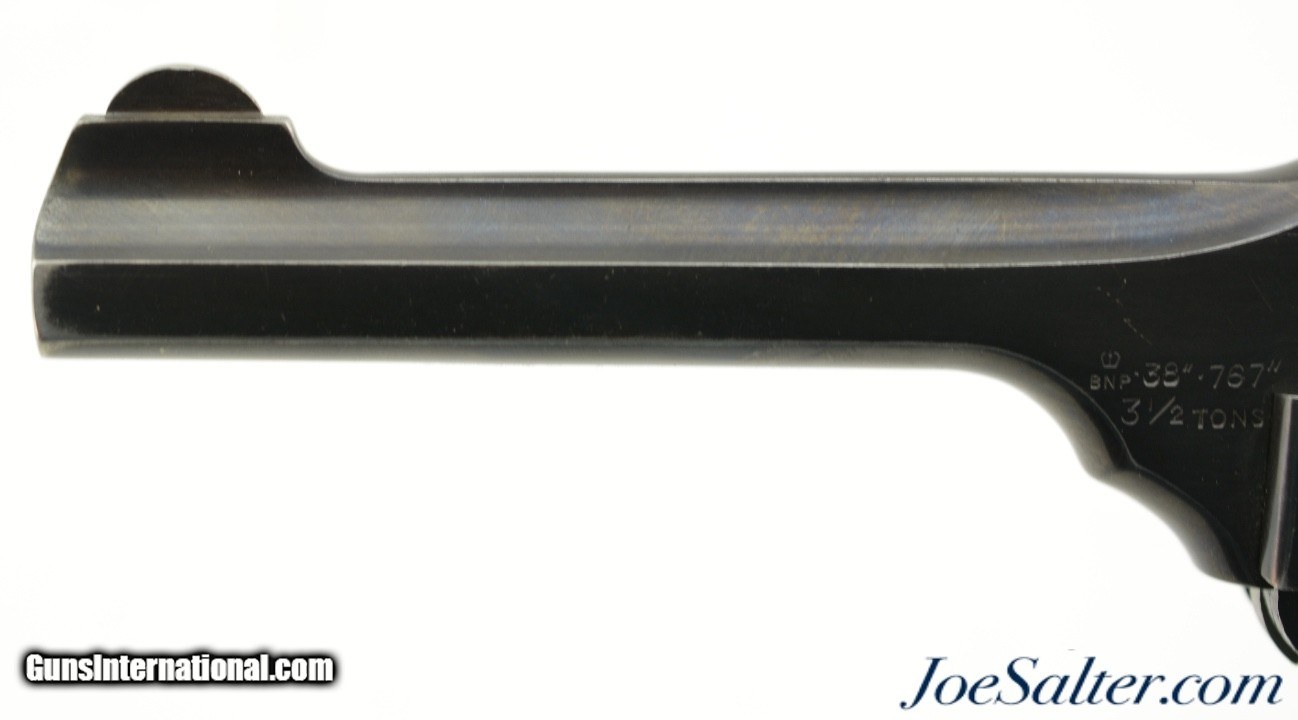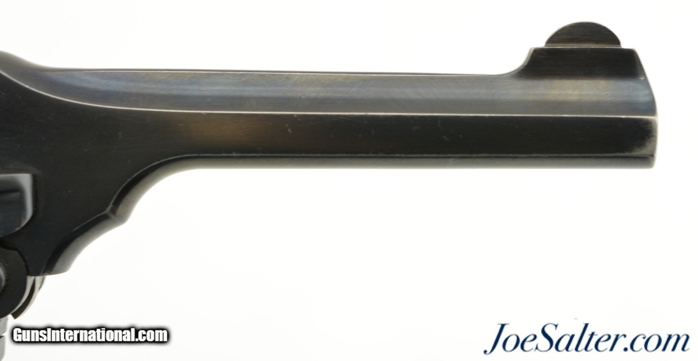 Description: Serial 138330, .38 S&W, 5 inch barrel with a bright, excellent bore. This is the Mark IV revolver manufactured by Webley & Scott with the appropriate Birmingham proofs and is discretely import marked on the under side of the barrel. In excellent condition as refinished the barrel, frame and cylinder show about 90-95% blue with silvering on the high edges. The Webley hard rubber grips are scratch numbered to the gun and remain in excellent condition. It is equipped with a lanyard loop. The lock up is tight and it functions correctly. FFL or C&R SOLD Curio/Relic: Yes |