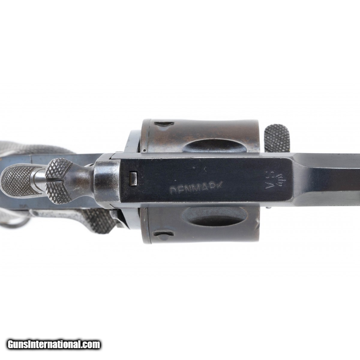 THis is a fine example of the 9mm Danish Model 1891 Navy top-break revolver. These revolvers were manufactured for the Danish Navy by J.B. Ronge in Liege, Belgium. The 6.3"" octagon to round barrel has an excellent bore with bright, strong rifling. The revolver retains approx. 90% bright blue with the cylinder and grip straps turning brown. The checkered wood grips are very good with moderate wear but no cracks or chips. The right panel has a circular brass disc with 407 stamped on it and the left panel has a blank disc. The laynard loop is present. The top strap is stamped DENMARK with a crown over SA to the front. The front of the frame above the forward end of the trigger guard has the oval Ronge trademark logo. The serial number, 533, is on multiple parts. The action functions correctly, This is a great example of a rarely seen Danish Navy revolver.