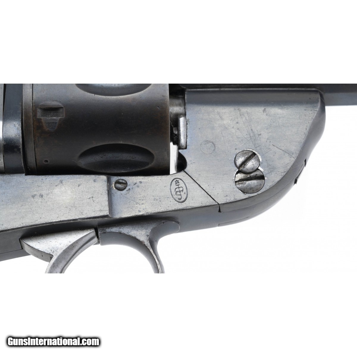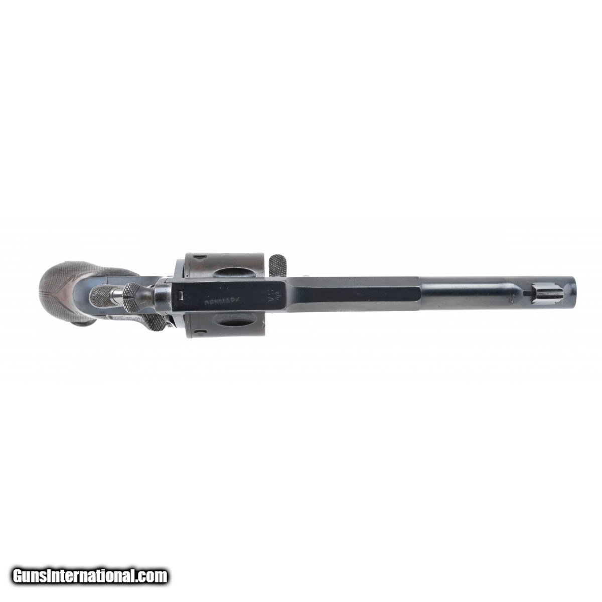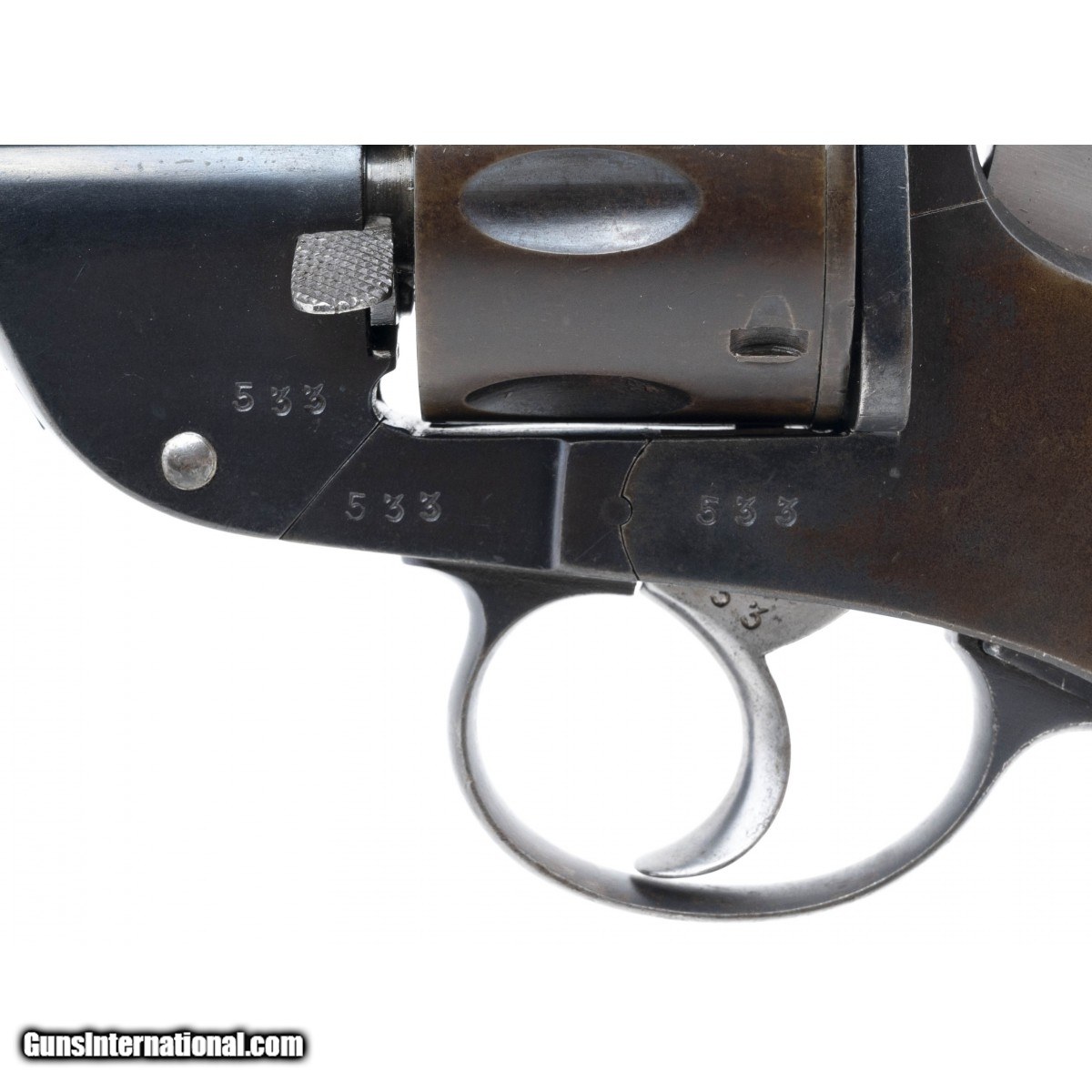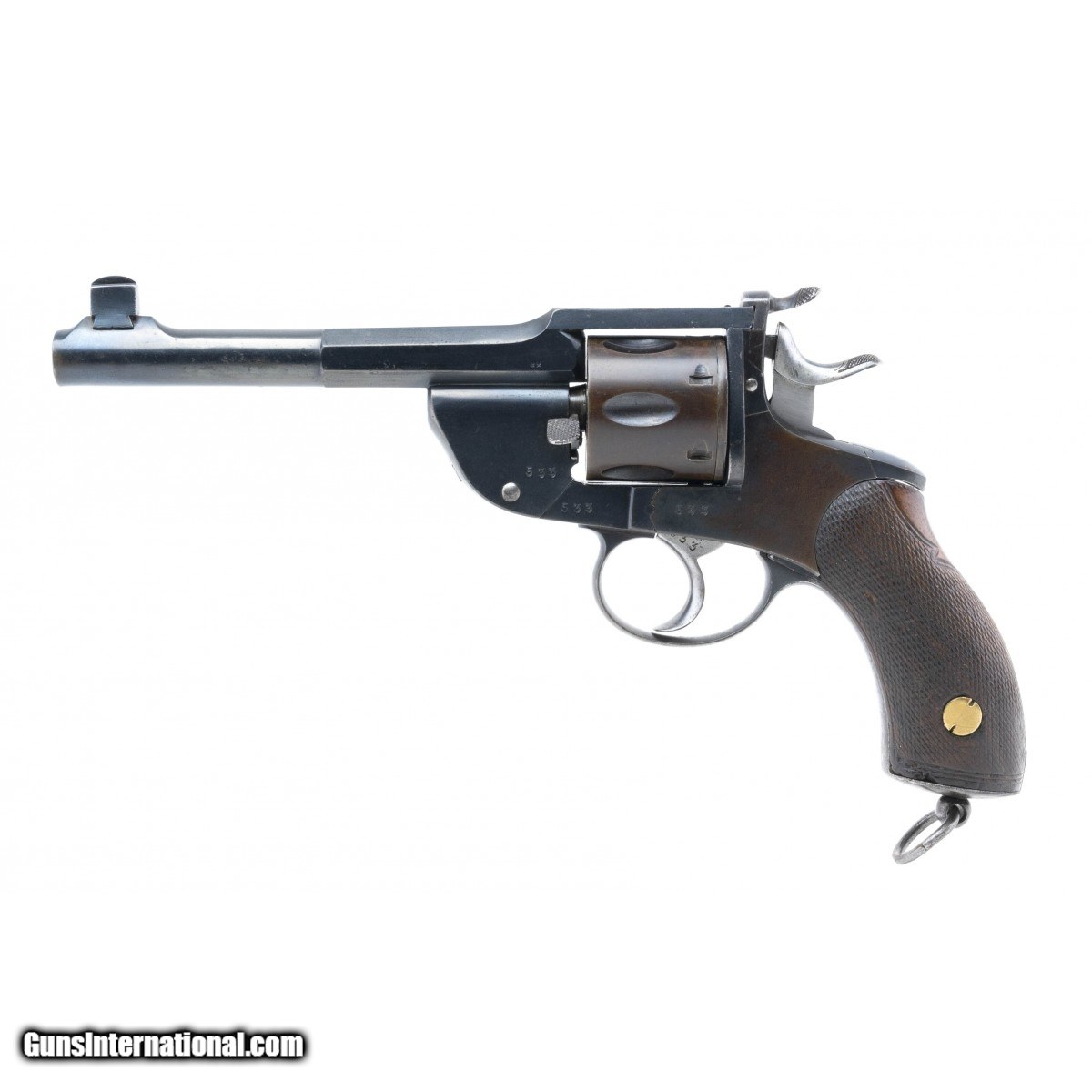 Description: " THis is a fine example of the 9mm Danish Model 1891 Navy top-break revolver. These revolvers were manufactured for the Danish Navy by J.B. Ronge in Liege, Belgium. The 6.3"" octagon to round barrel has an excellent bore with bright, strong rifling. The revolver retains approx. 90% bright blue with the cylinder and grip straps turning brown. The checkered wood grips are very good with moderate wear but no cracks or chips. The right panel has a circular brass disc with 407 stamped on it and the left panel has a blank disc. The laynard loop is present. The top strap is stamped DENMARK with a crown over SA to the front. The front of the frame above the forward end of the trigger guard has the oval Ronge trademark logo. The serial number, 533, is on multiple parts. The action functions correctly, This is a great example of a rarely seen Danish Navy revolver. SOLD |