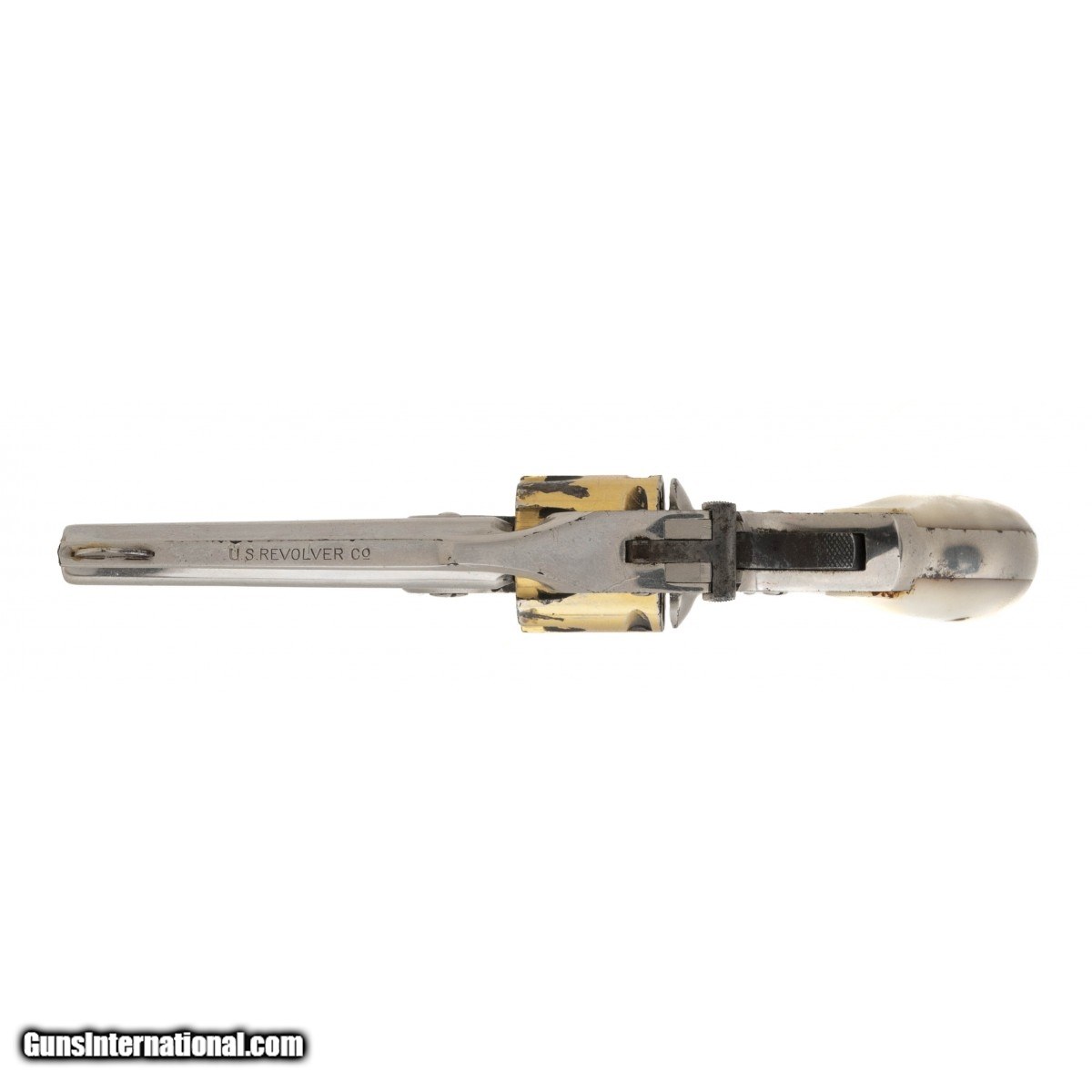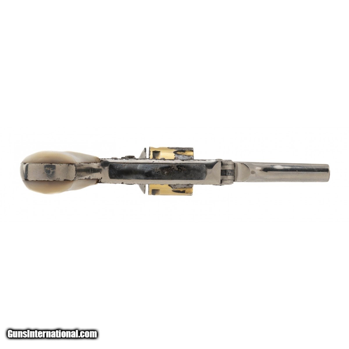 Description: " SN: 2725. 7-shot topbreak revolver with nickel finish, gold plated cylinder and pearl grips. The bore is very good, lightly pitted with good rifling. Some of the gold has flaked off the cylinder, still has just about all the nickel. Overall very good condition. SOLD |
