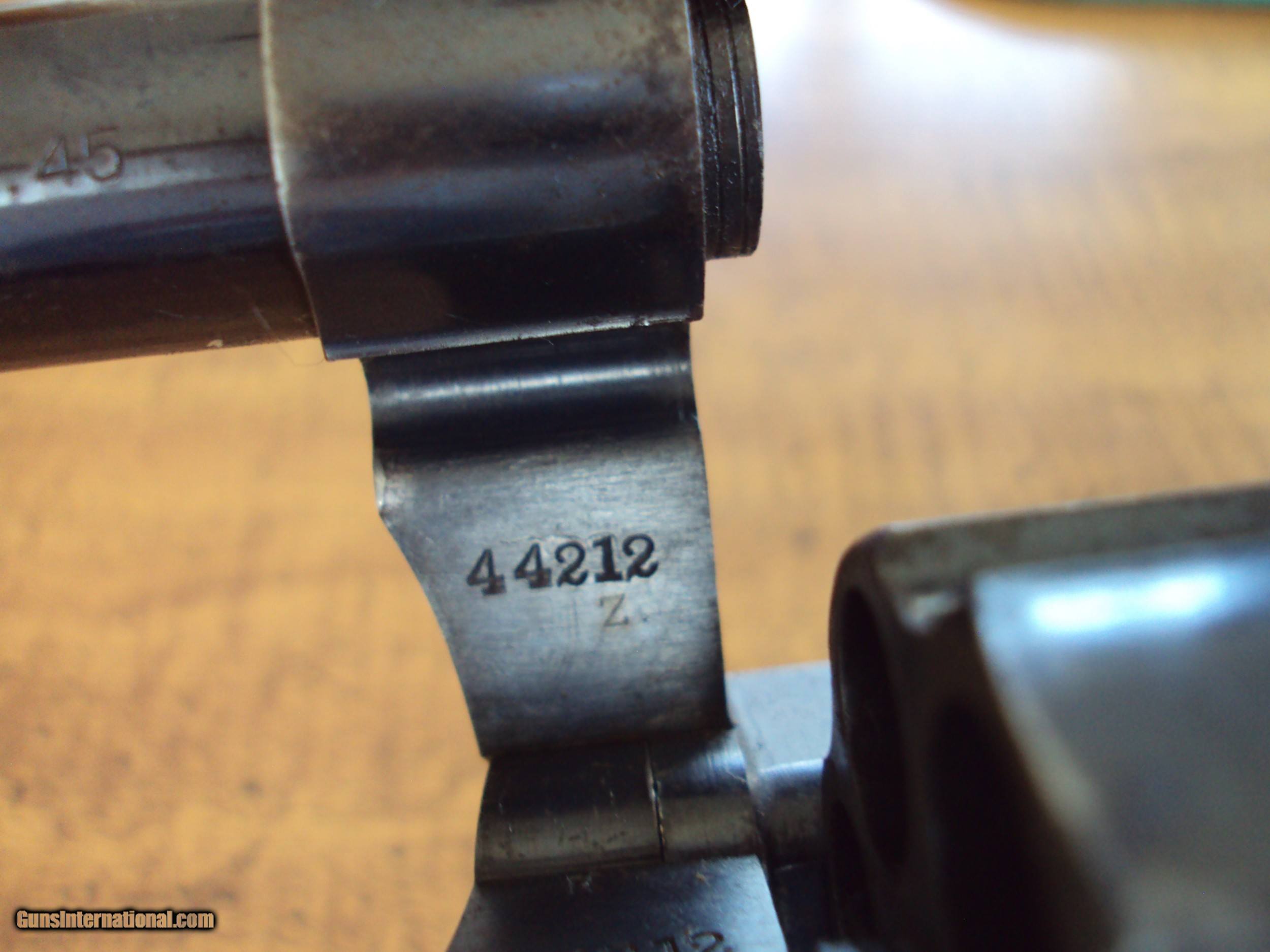 Description: A very nice Colt 1909 DA .45. All marked parts match the SN including the original grip panels. Bore is bright with a few minor pits. Underside of barrel stamped "United States Property". The cylinder is stamped with the inspectors stamp, RAC as well as the frame, barrel and grip panels. The frame also has the inspector stamp of Walter G Penfield, WGP on the right rear upper of the receiver. There were only 19,503 of these revolvers purchased by the Army. See all pics for condition and markings. Shipping cost is $25.00. USPS MO or certified bank check accepted as payment. SOLD Curio/Relic: Yes Handgun Caliber: .45 Colt Manufacturer: Colt Model: 1909 Serial Number: 44212 Barrel Length: 5.5 inch Action: DA |